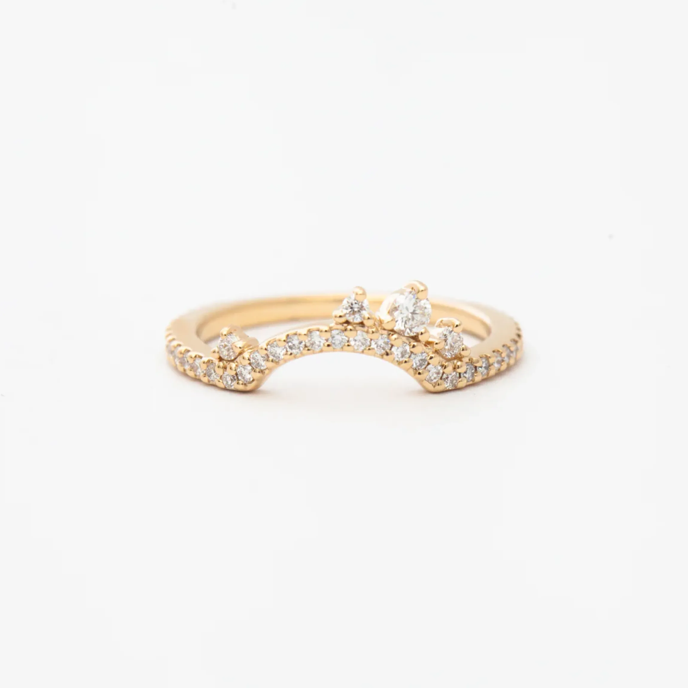 The Meridian collection by Anna Sheffield is a twinkling nod to the celestial energies of earth and sky. This band features an asymmetrical motif of four round stones prong set and dotted along a curve of diamond-set gold. The wide curve allows this ring to sit next to a myriad of different ring styles, making it a perfect choice to accentuate any ring stack. Alternatively, wear this ring on its own for an eye-catching dose of everyday glamour. Designed in New York.