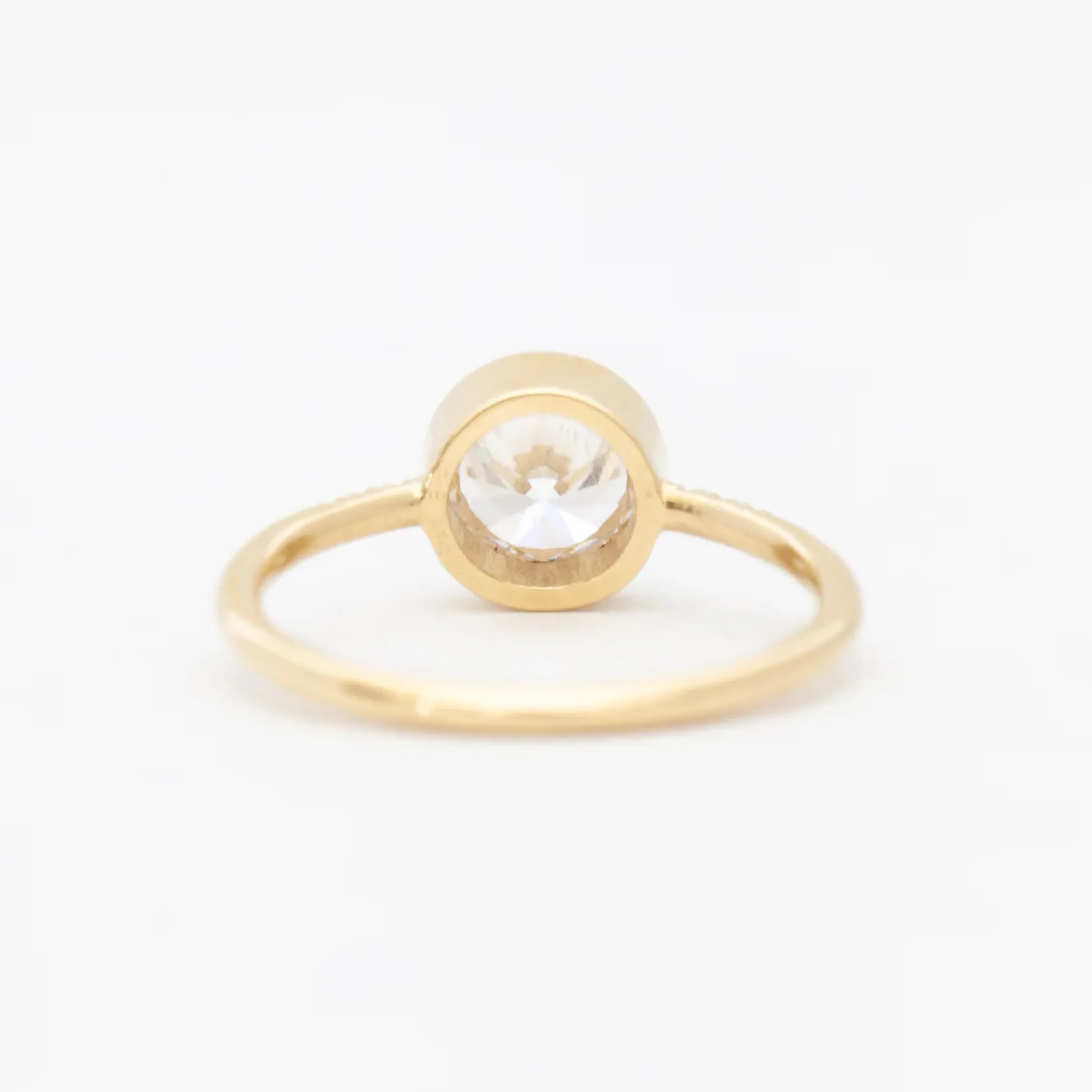 Cleanly set with Jennie Kwon Designs’ hand-crafted milgrain detail, this bold bezel setting accentuates and elevates a sparkling round diamond in a way that it’s utterly sophisticated and simple. This is simple beauty at its best, completed with a sprinkling of white diamonds on the band. Made in the U.S.A.