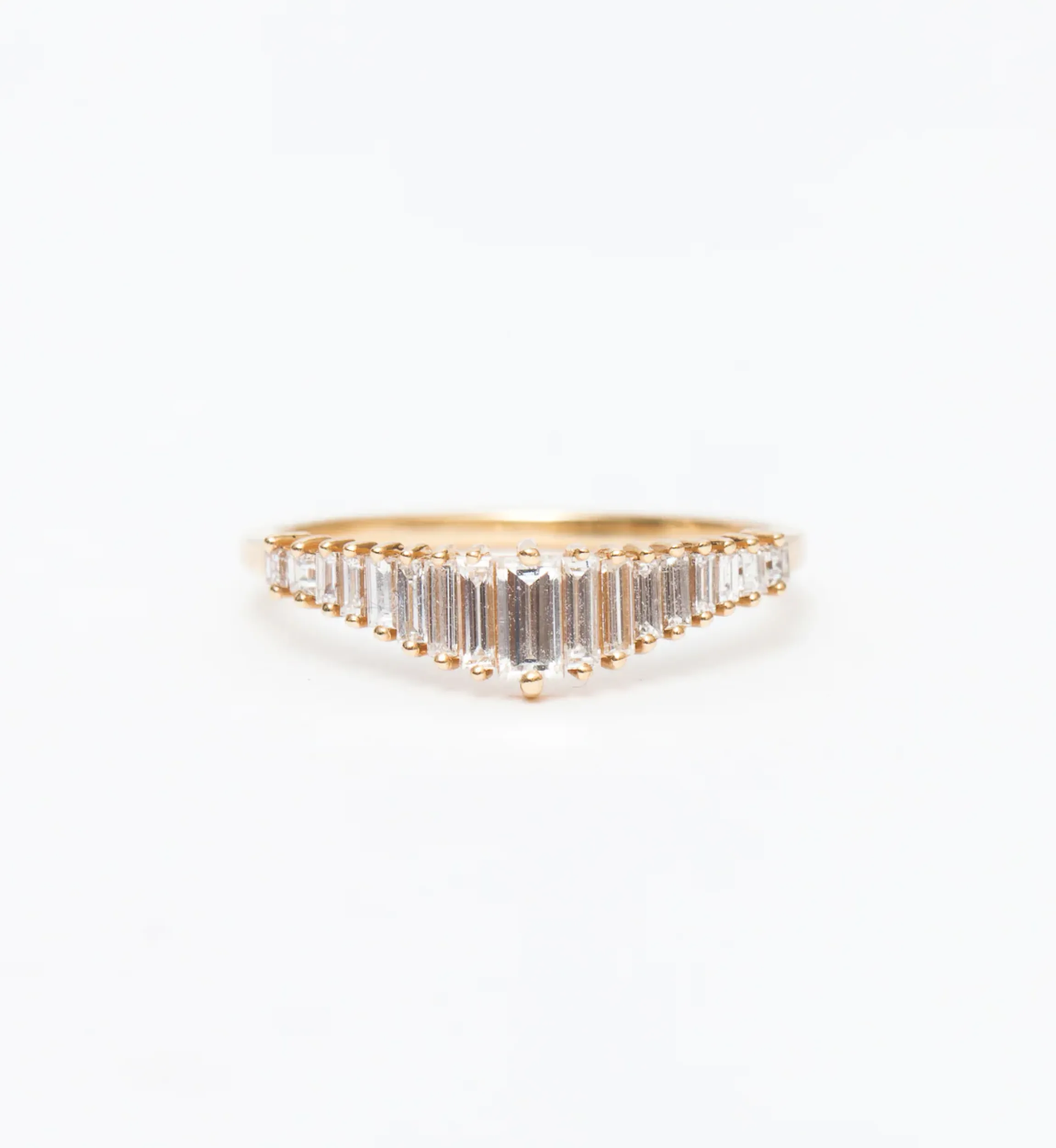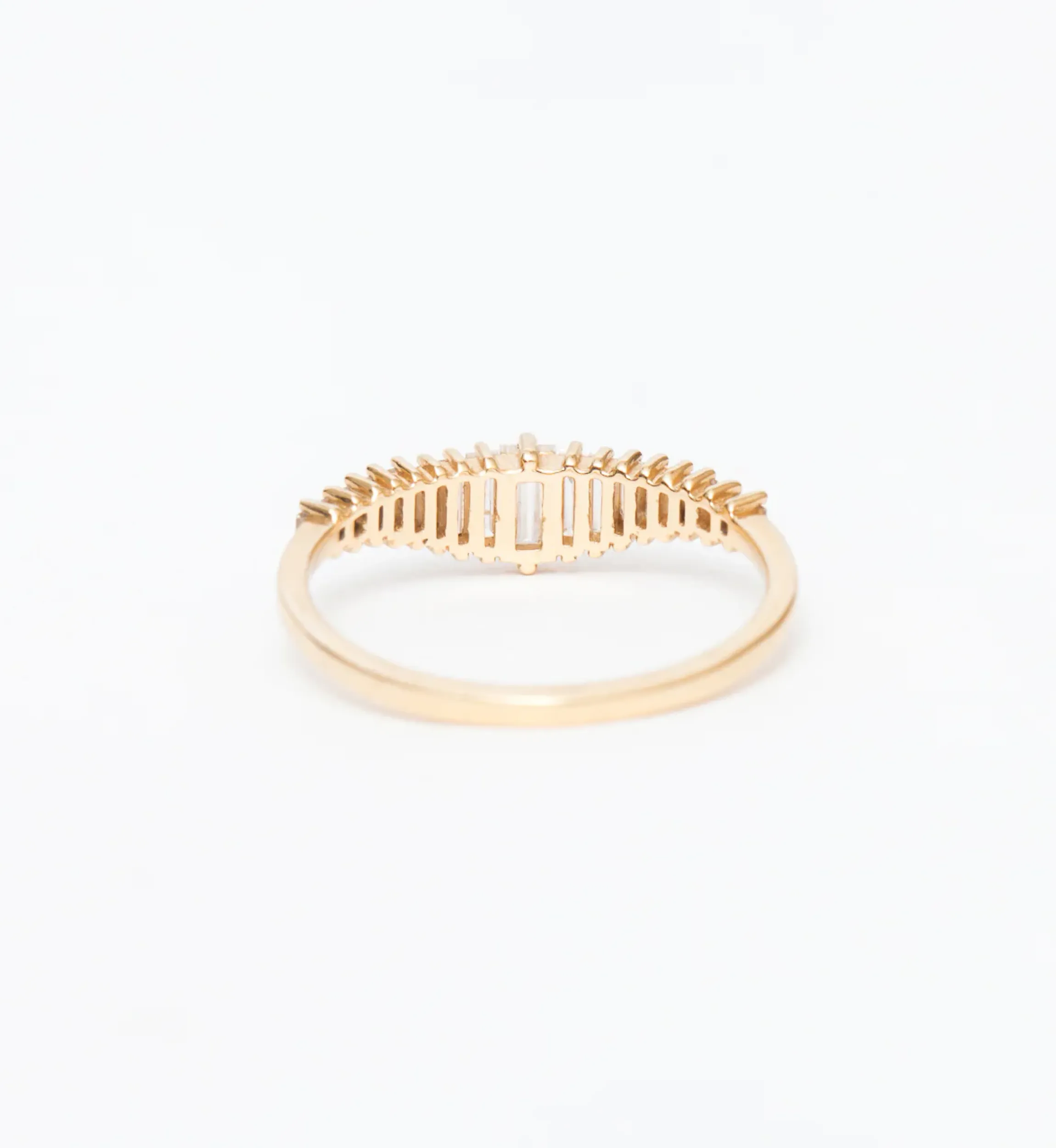 By the simple act of precise, perfect repetition, the duo behind Artemer elevate the baguette diamond to new heights with this geometric beauty. Set in parallel and amongst fine round beads, the full array of diamonds combine to create a staggering, shimmering silhouette. Wear it as a modern engagement ring or rest its flat edge against your solitaire as a wedding band of the most exquisite order. Made in Israel.