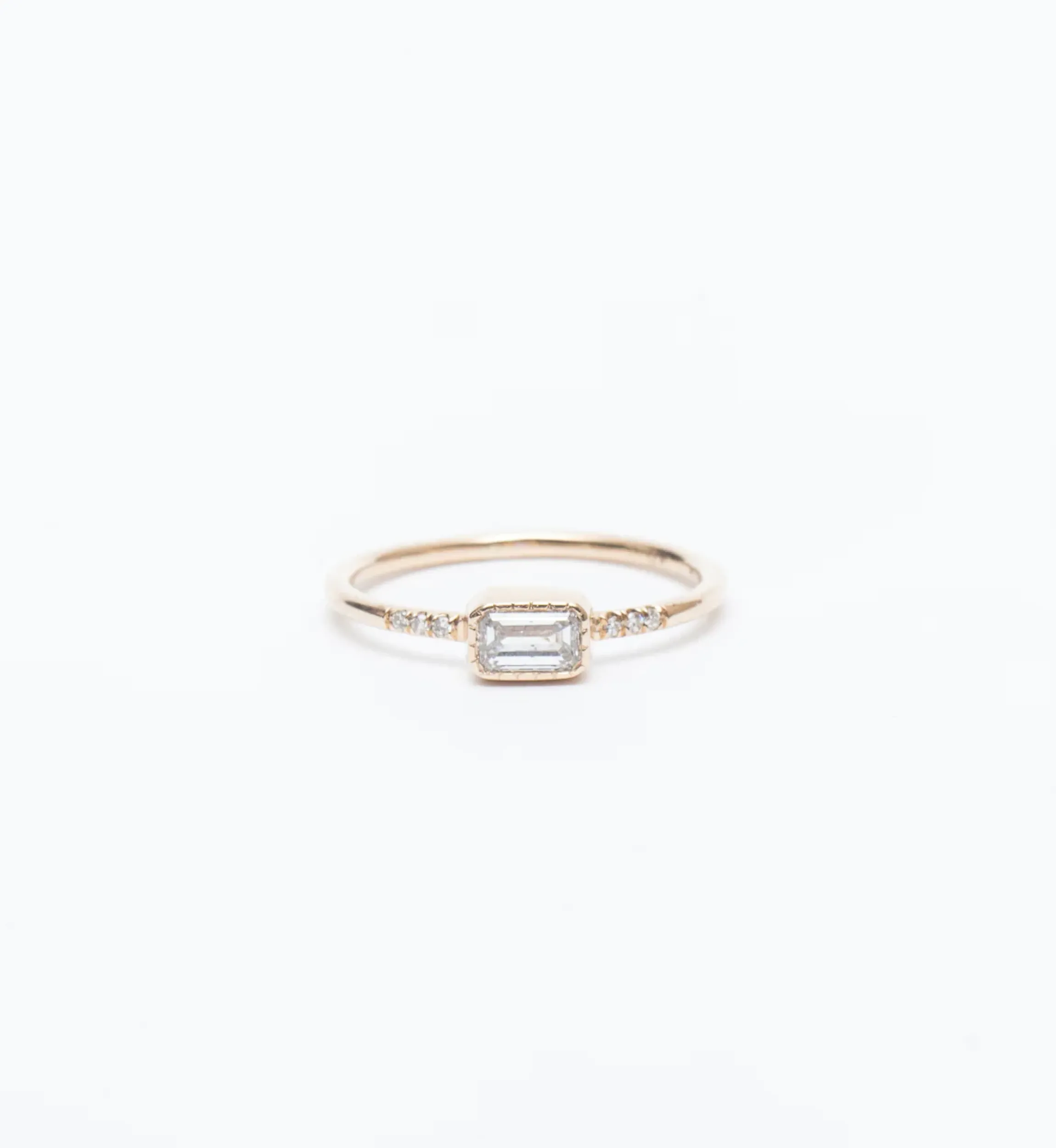 14 karat gold with one 5 mm x 3 mm emerald-cut white diamond and six 1 mm white diamonds totaling approximately 0.32 carats.
