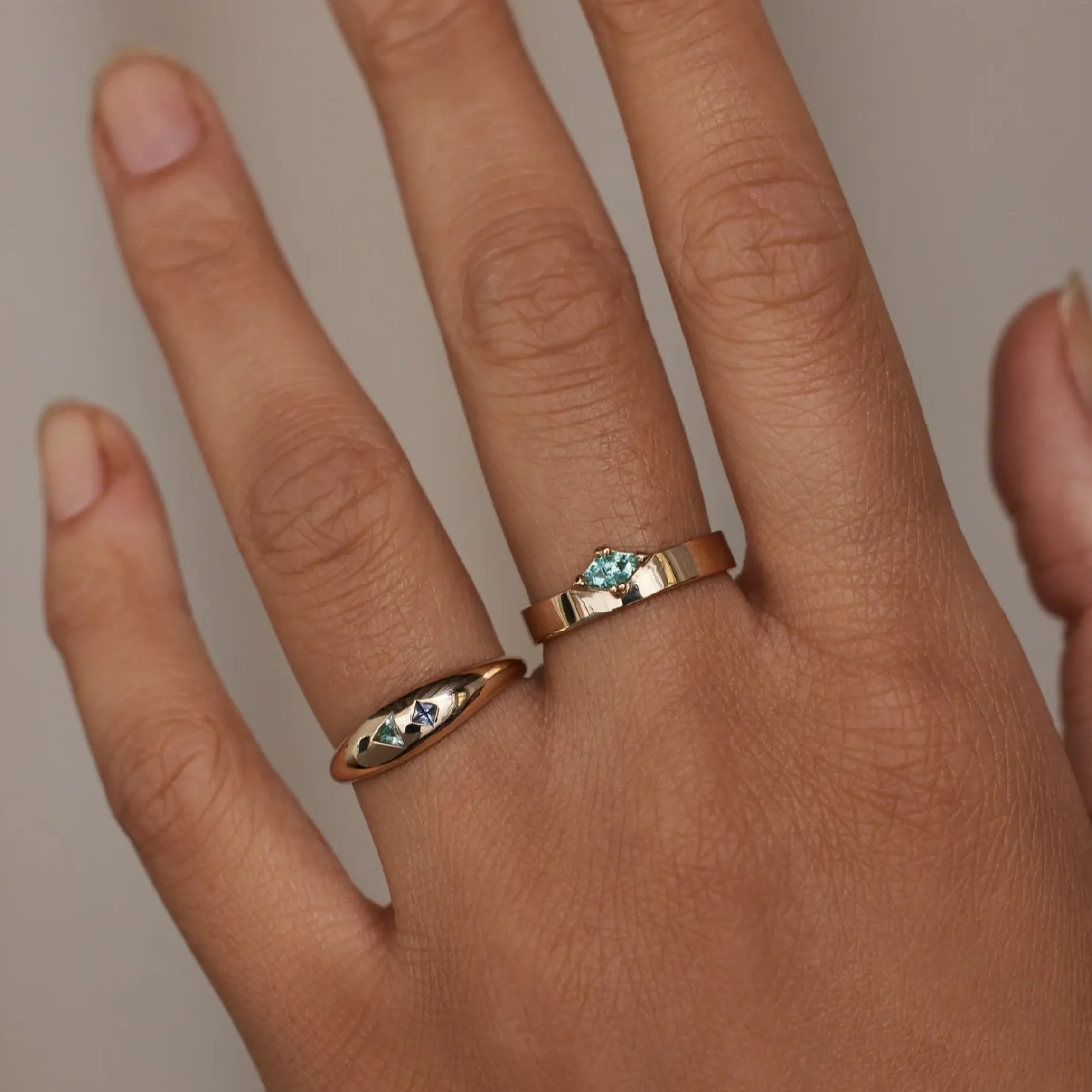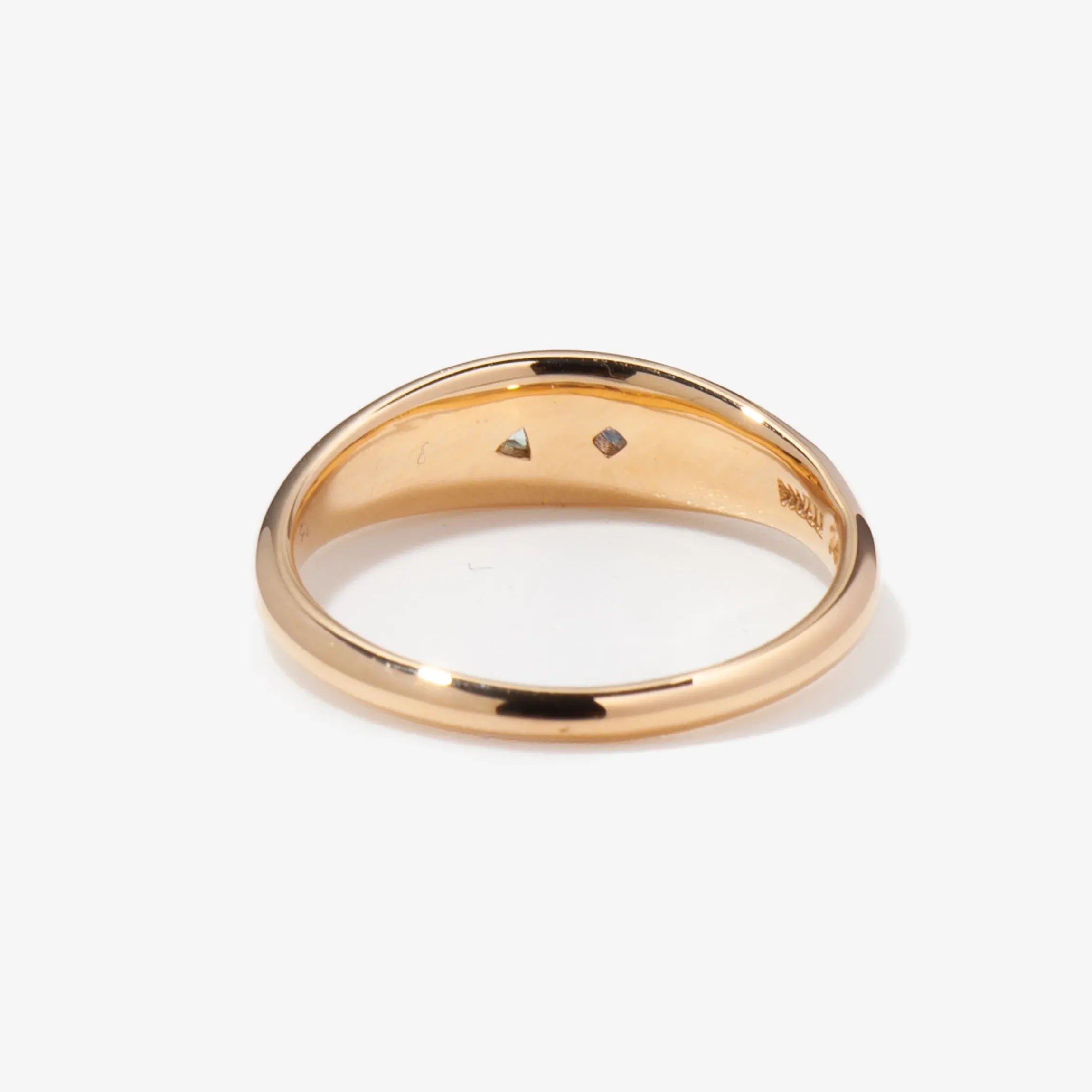 A classic dome ring with luxurious gold weight. An heirloom-to-be marked with playful lagoon-colored stones, featuring a triangle-cut green beryl and a light blue princess-cut sapphire. The unexpected and beautiful pairing sit flush in the comfortable and shiny dome ring.