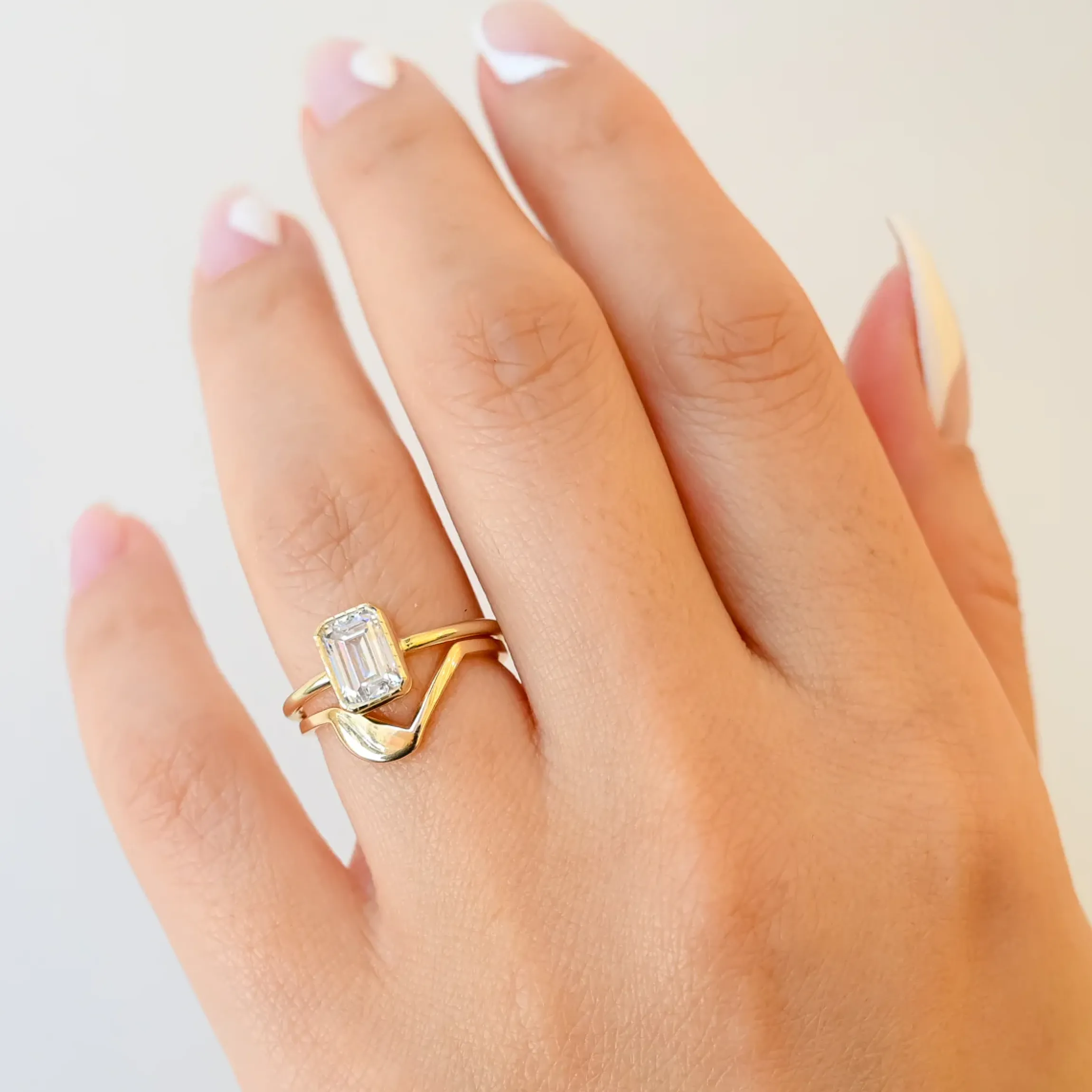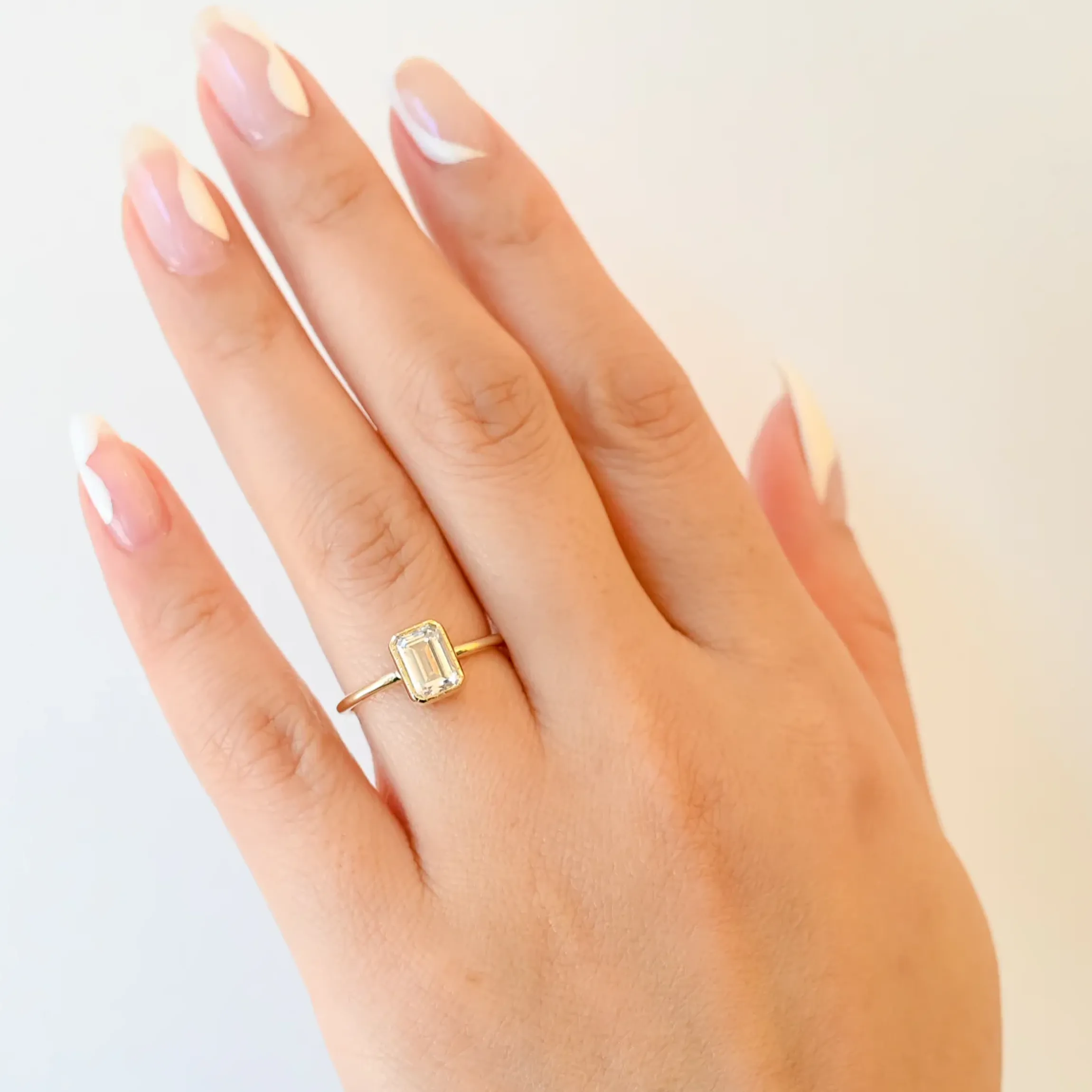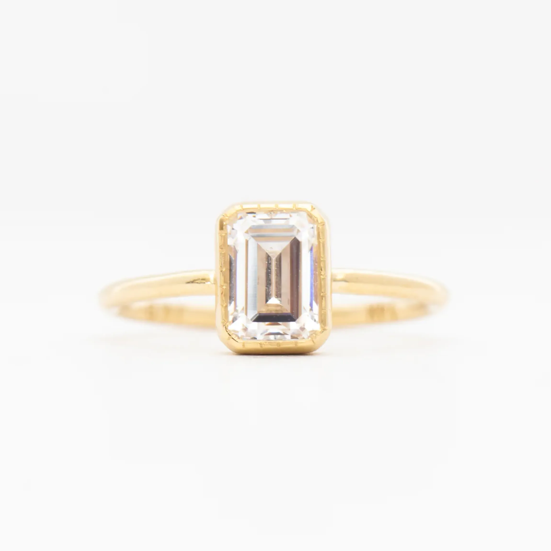 The bright shimmer of an emerald-cut white diamond is set into a beloved Jennie Kwon Designs setting that’s subtle yet utterly unforgettable. Its dainty textured bezel and thin band pulls all focus to the center stone, making it the perfect choice for a bride looking for something simple and sweet. Made in the U.S.A.