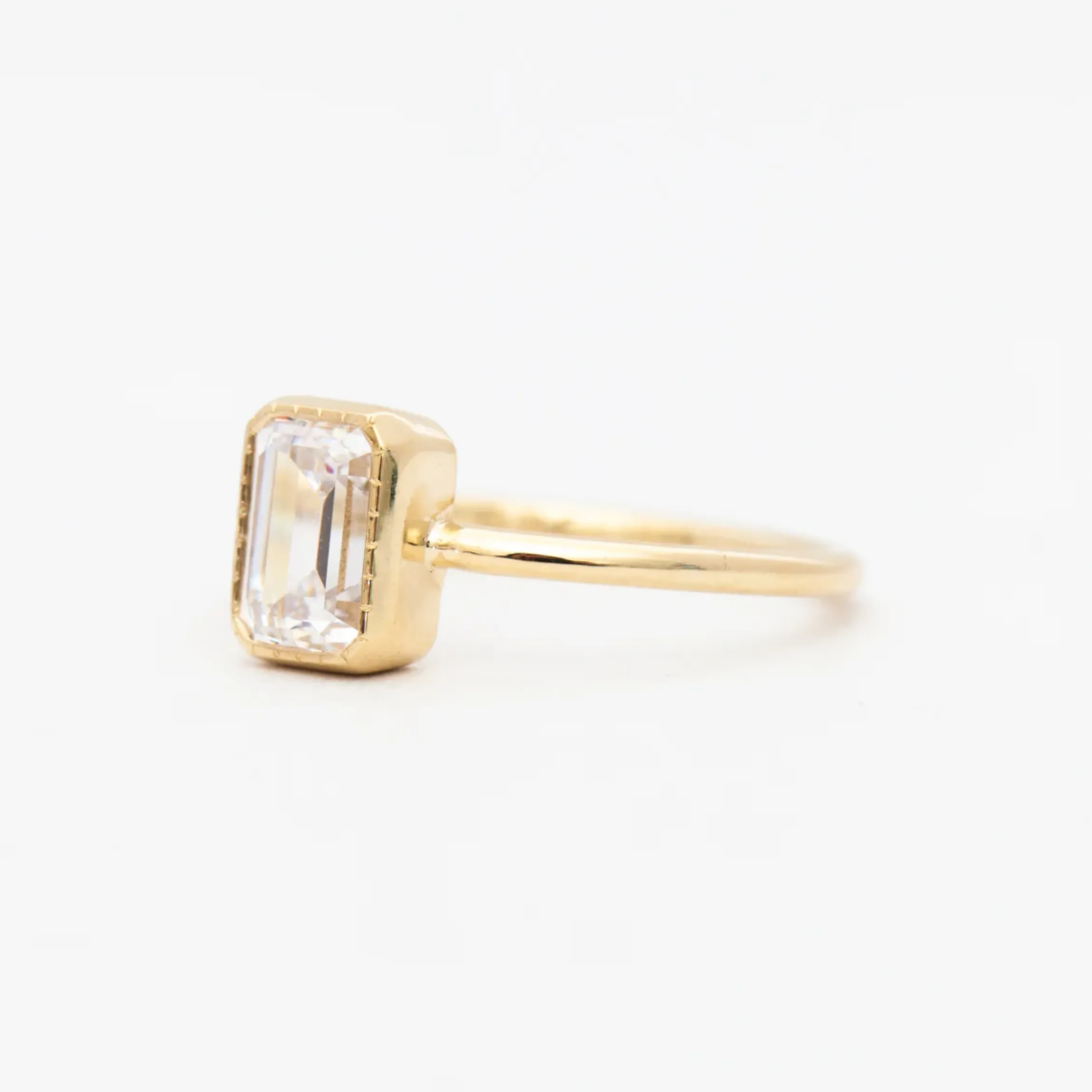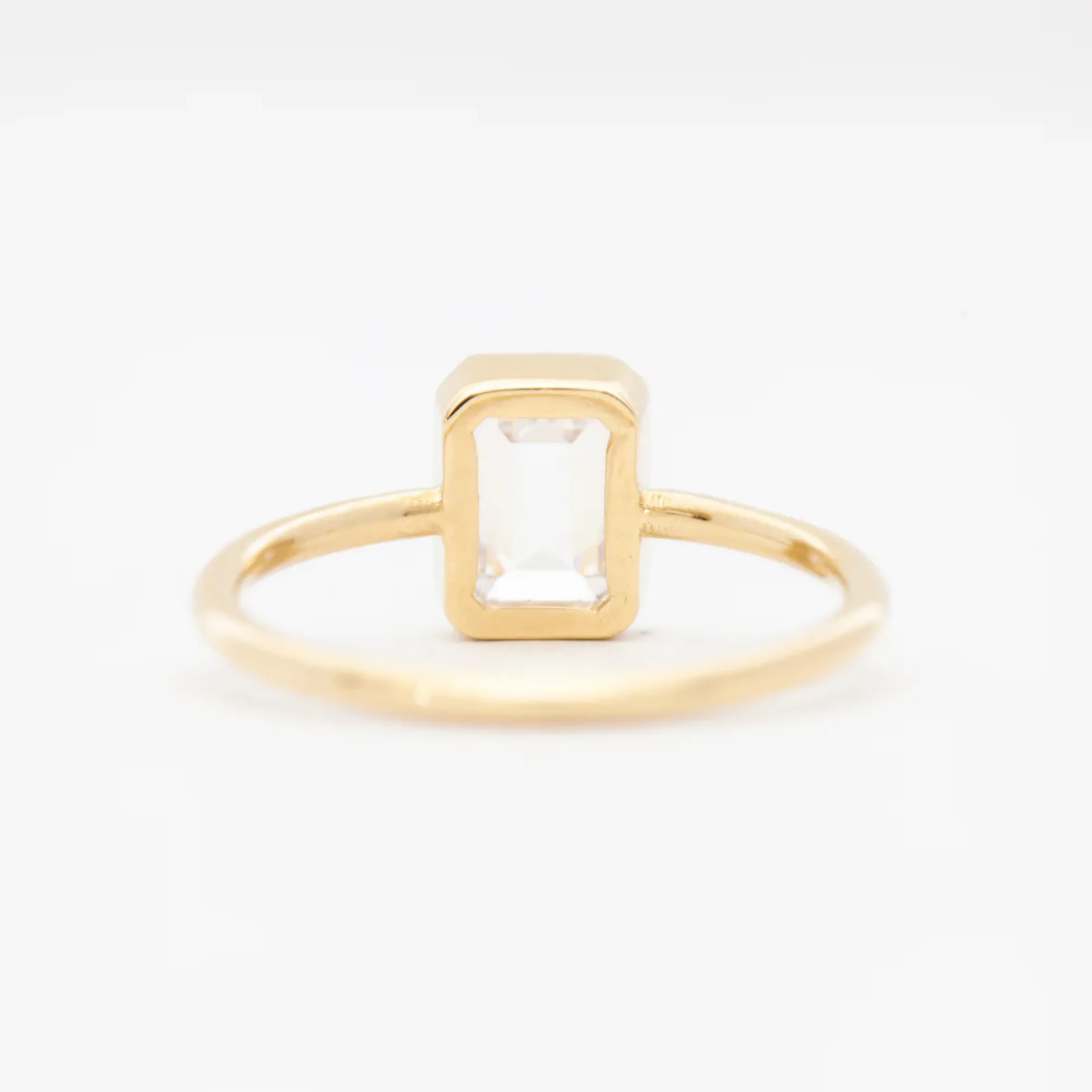 14 karat gold set with one 7 mm x 5 mm (approximately 1 carat) emerald-cut white diamond.