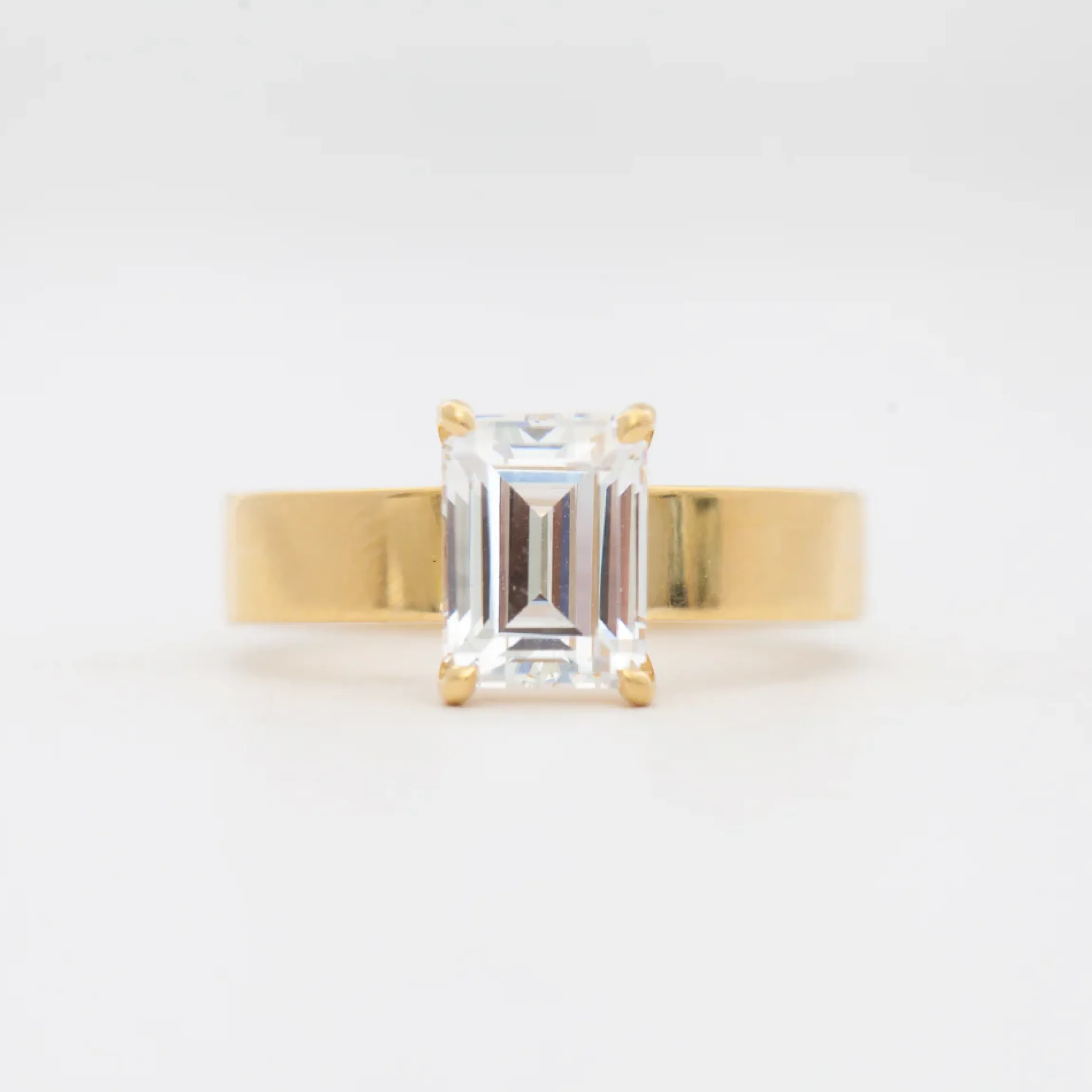Bold, beautiful, and heavy in gold, the Temple setting by The Future Fine features a thick luxurious band that truly pays homage to the diamond it carries. This four-prong version of the Temple features an emerald-cut diamond with dazzling step cuts that provide shimmering contrast against its golden backdrop. Perfect for any bride looking for an elegant solitaire that is decidedly not delicate. Made in the U.S.A.