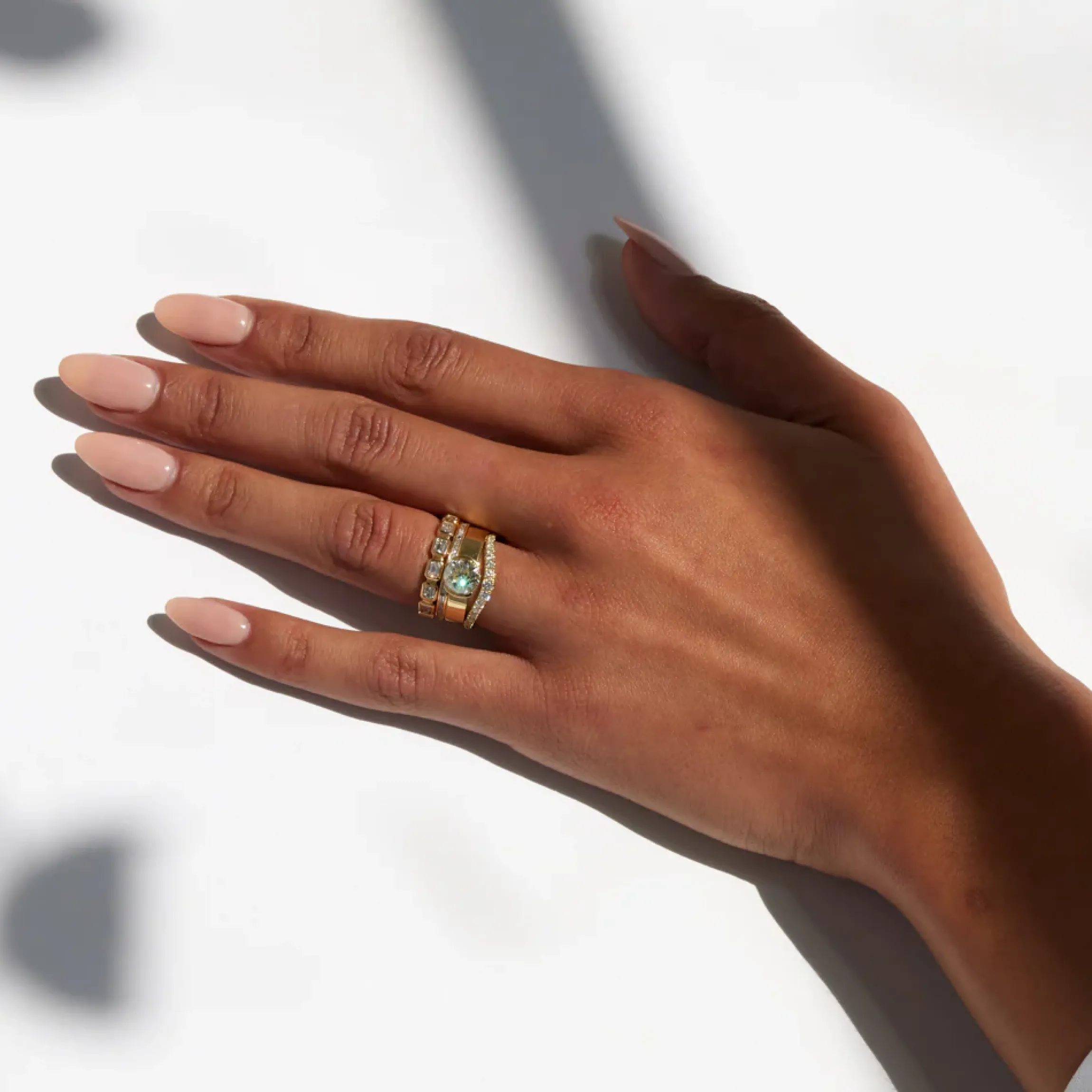 Who says a wedding band can’t make a statement? This bezel-set eternity band by The Future Fine is a multi-faceted dream come true. Glittering emerald-cut white diamonds catch the light from every angle, each wrapped in a luxurious layer of gold. Pair this band with a simple solitaire engagement ring to add a punch of pattern to your stack. Made in the U.S.A.