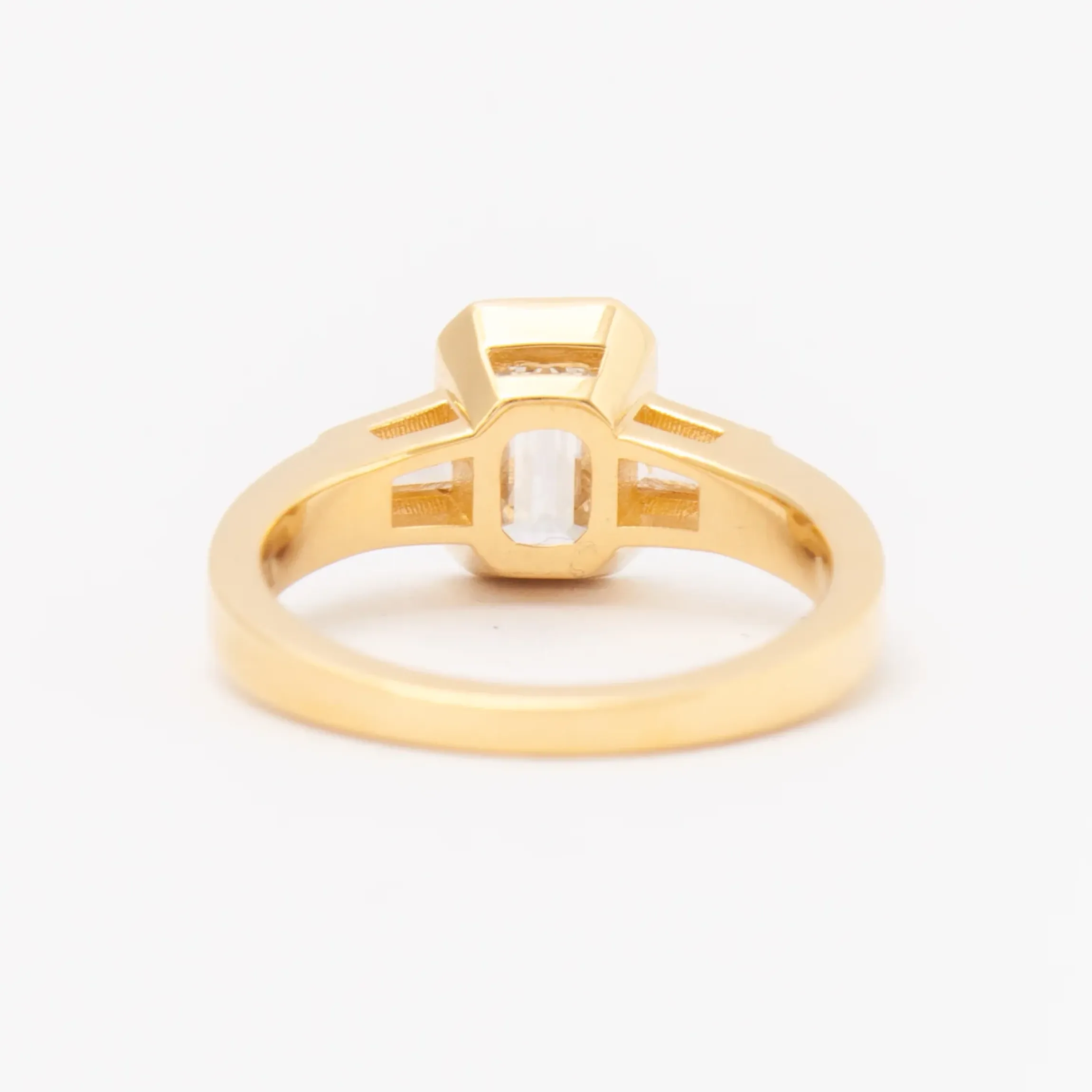 18 karat yellow gold set with an approximately 1.40 ct (GHI color/VS2+ clarity) emerald-cut white diamond with two tapered baguette diamonds totaling an additional 0.28 carat. Looking to customize your center stone? Contact us or book an appointment.
