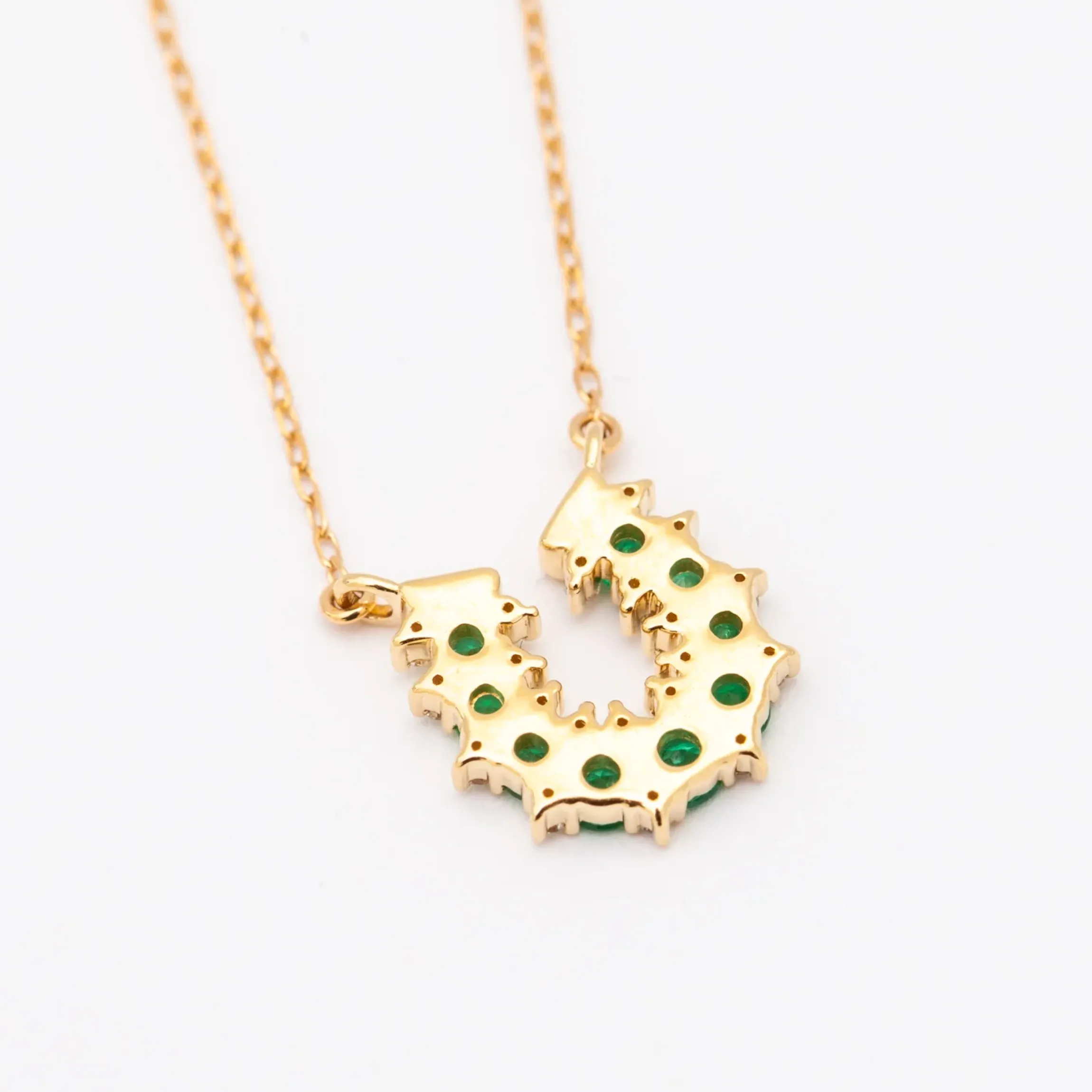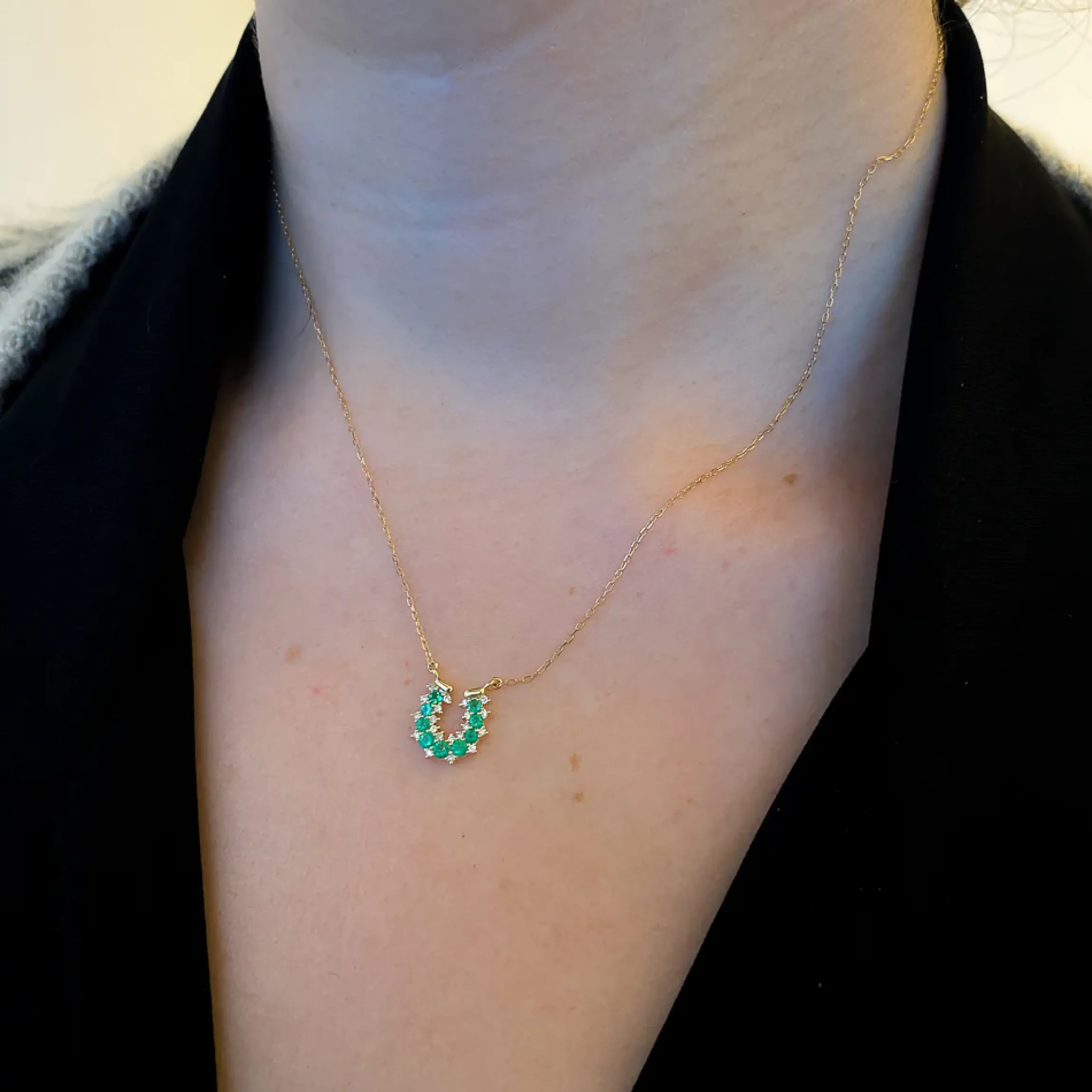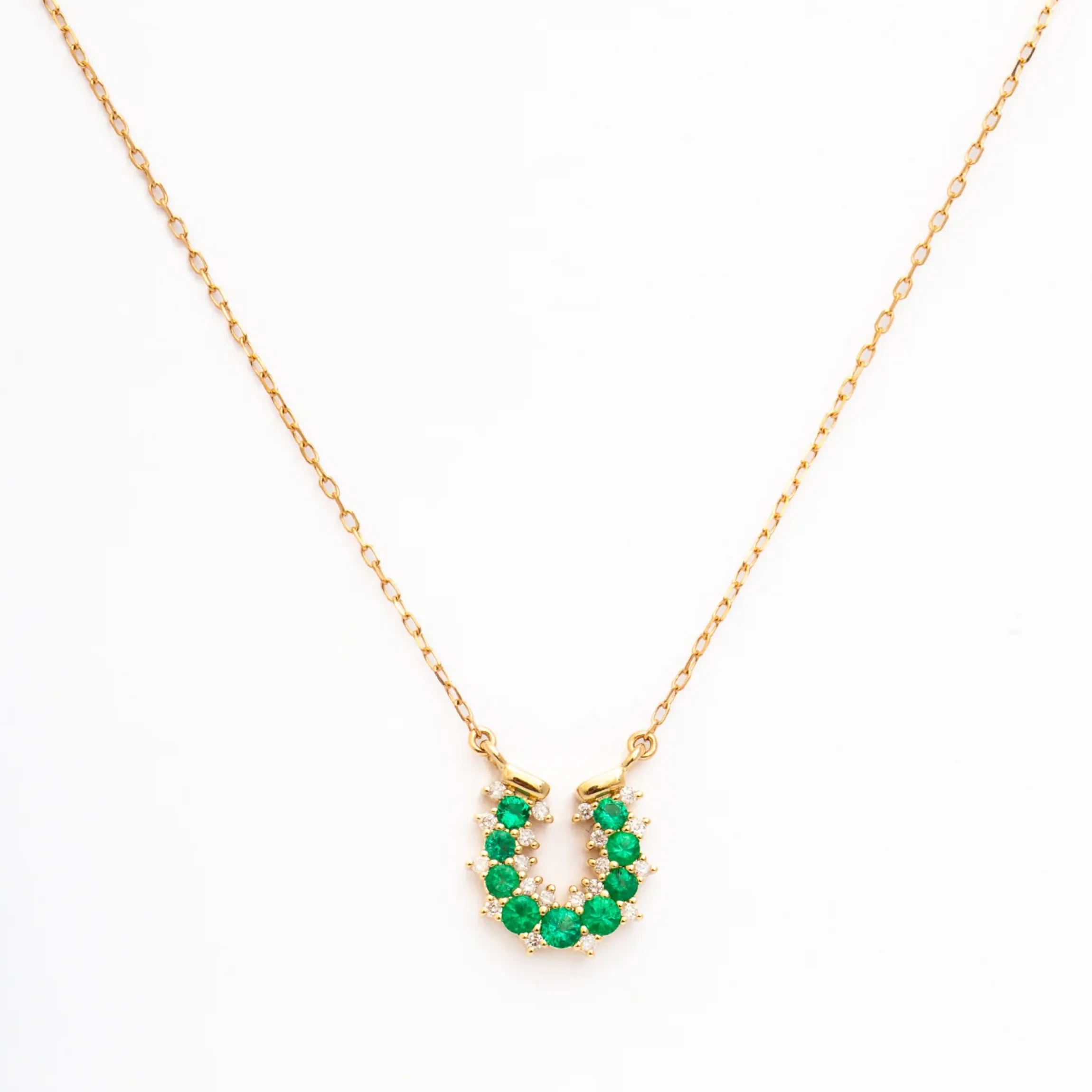 Consider this necklace from Adina Reyter your new good luck charm. Prong-set diamonds and green emeralds depict a lucky horseshoe affixed to a dainty gold chain, making this necklace both fabulous and comfortable to wear every day. Designed in Los Angeles.