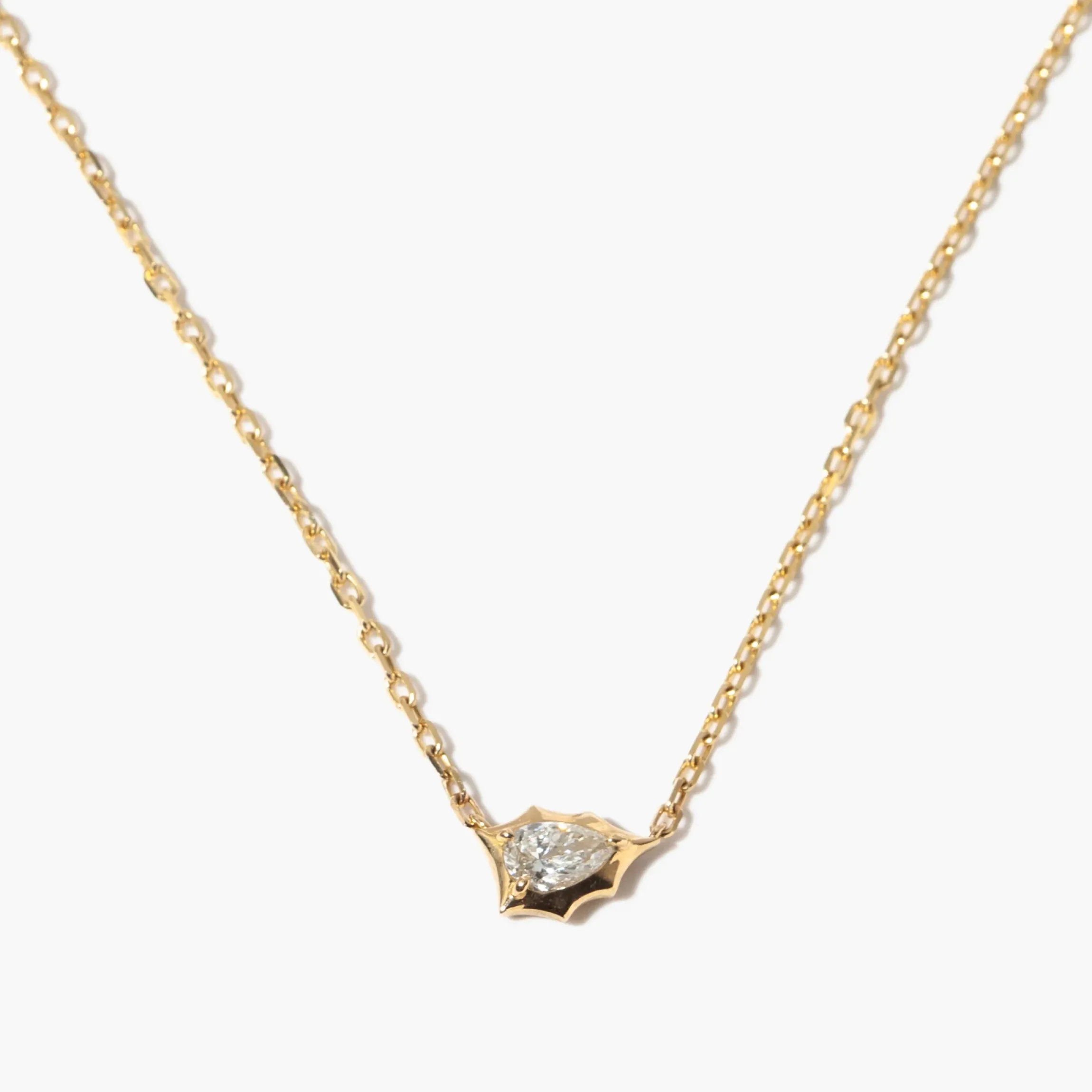 A classic diamond necklace style meets Jade Trau’s distinctive eye for shape in this dazzling Alchemy setting. The diamond pendant is a classic staple in any neck stack. An everyday essential, and delicately hangs on the neck by an 18 inch adjustable chain. Handcrafted in 18-karat gold and featuring a half carat pear-shaped diamond set east-west. Made in New York.