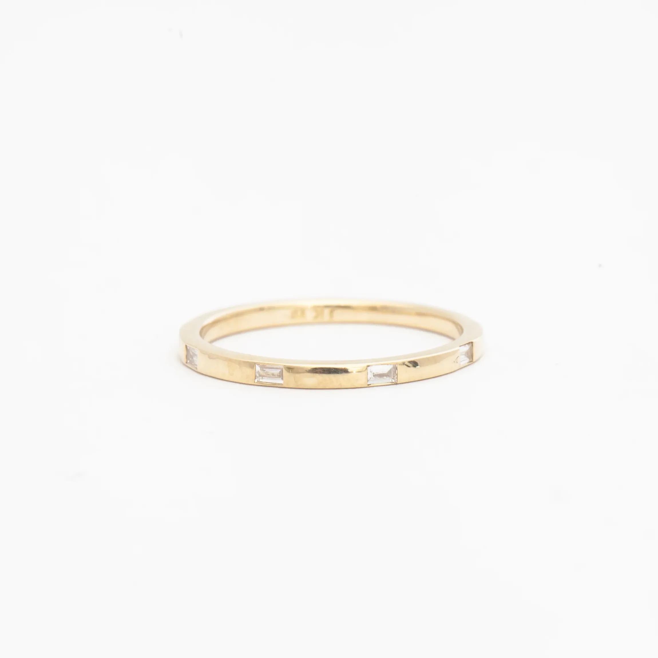 Saying “yes” is forever and Jennie Kwon honors that with her distinctive take on the eternity band. Evenly spaced baguette diamonds are flush-set into this gold ring, punctuating its polished surface with shimmering windows of light. Add it to your favorite stack of rings to bring variety in color and texture to your everyday look. Made in the U.S.A.