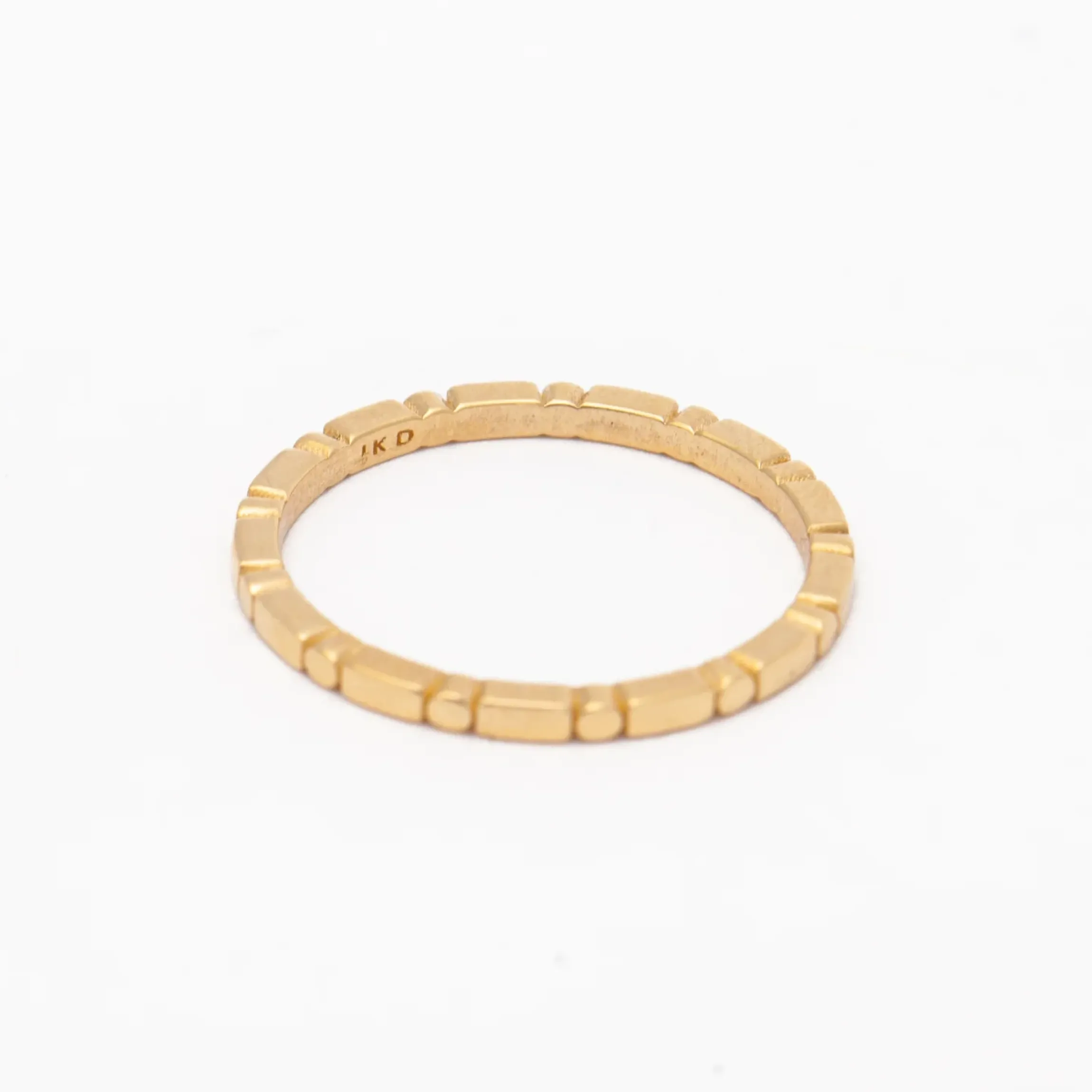 Like a sequence of morse code in dainty gold form, this piece catches the attention with its sweet geometric quality. Sharp corners and rounded lines create a soft architecture and perfect addition to any ring stack. For a quiet, subtle sense of luxe, wear it in multiples in different colors and finishes. Made in the U.S.A.