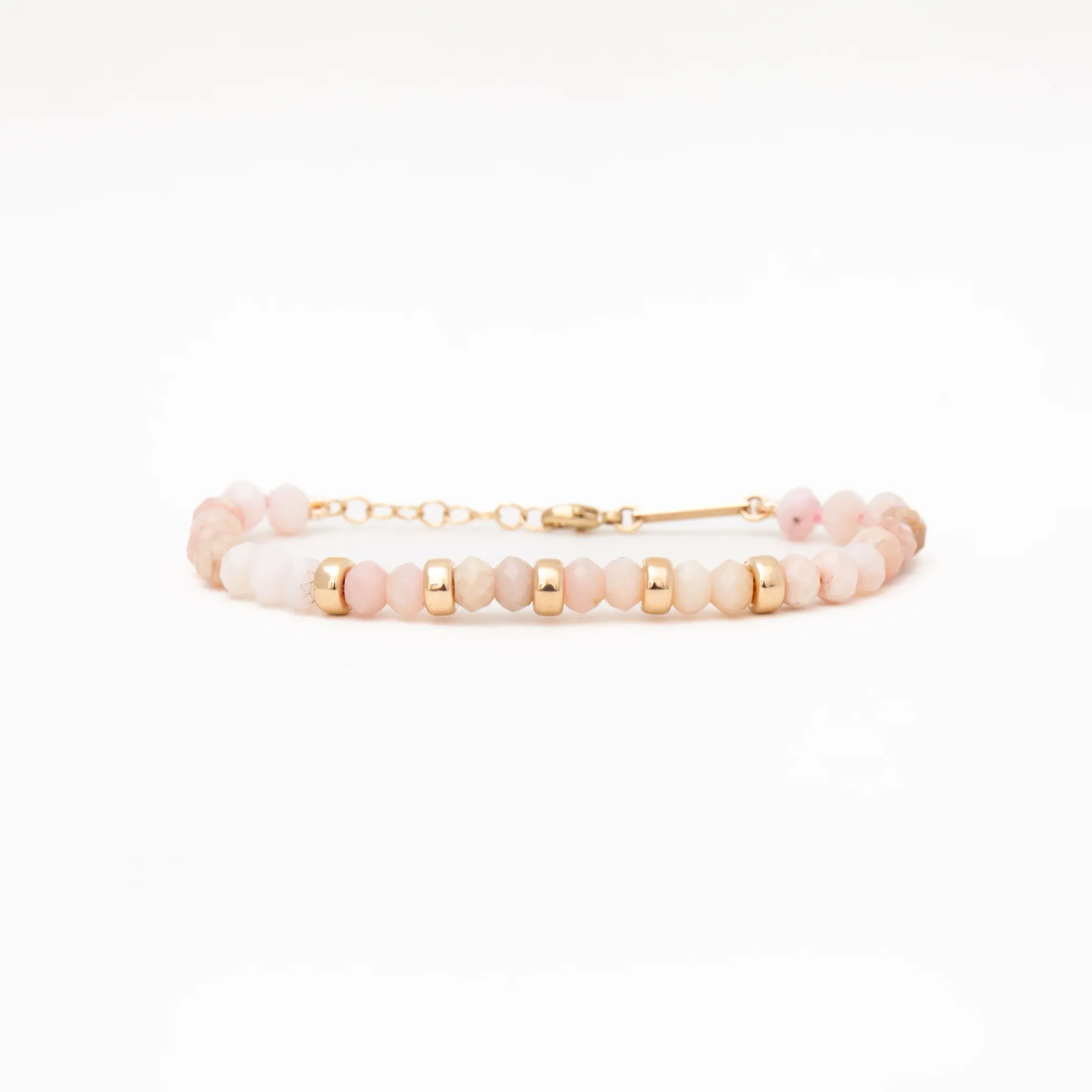 Take a chance and make a statement with this Gold u0026amp; Pink Opal Rondelle Bead Bracelet. This bracelet stands out with its fun and dainty color combination and adjustable chain, letting you create a unique look and stand out! Finished with a hallmarked logo plate and adjustable chain and spring-ring clasp closure. Made in the U.S.A.