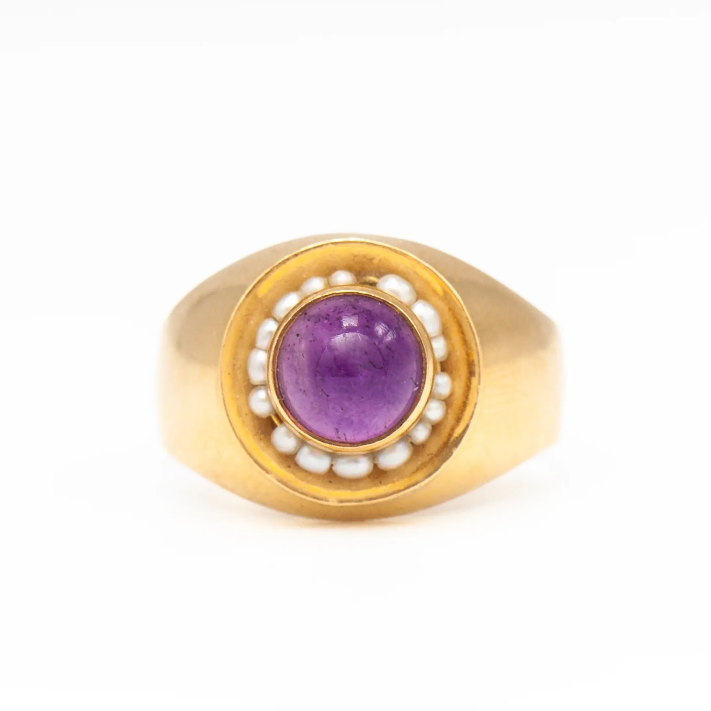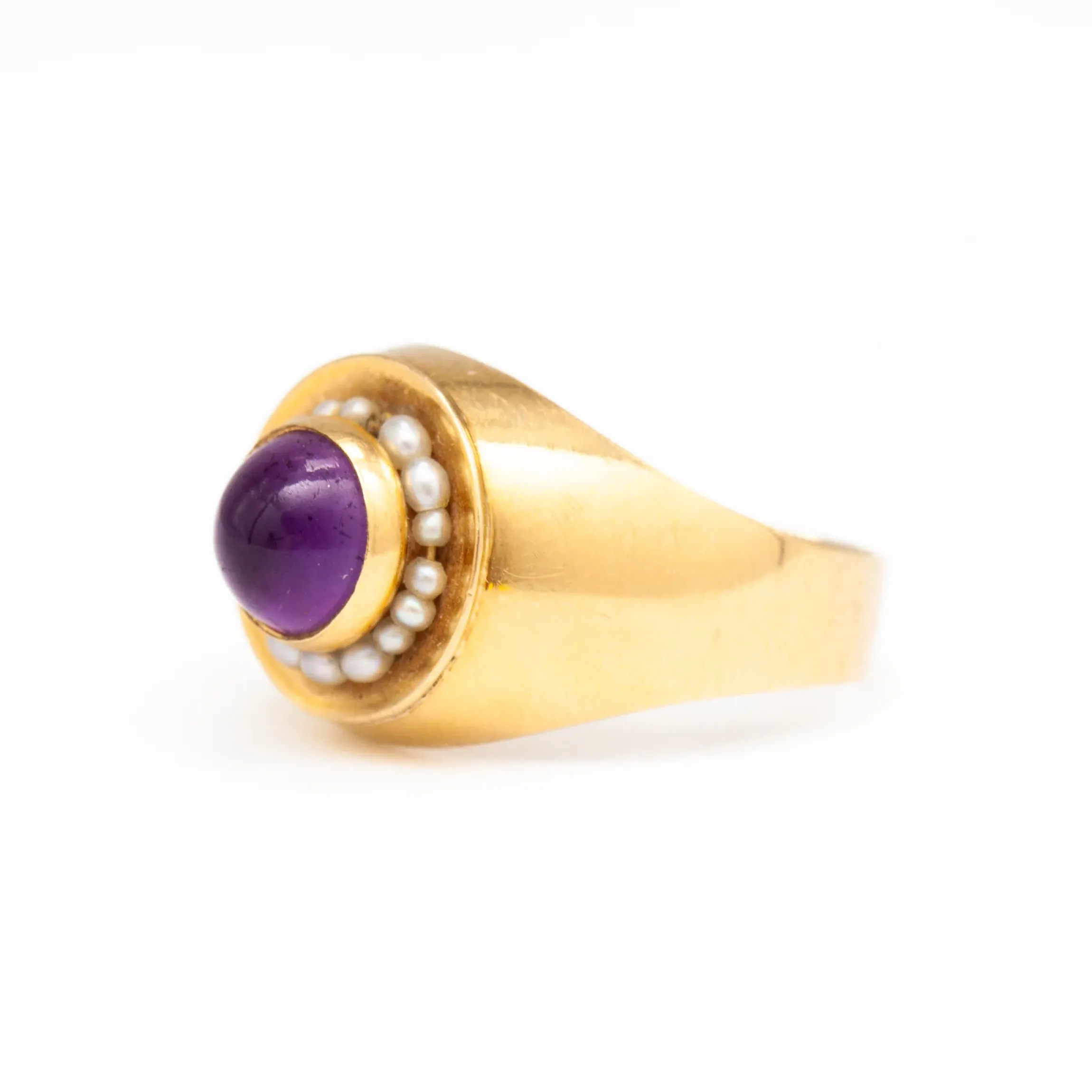 18 karat yellow gold with amethyst and seed pearls.