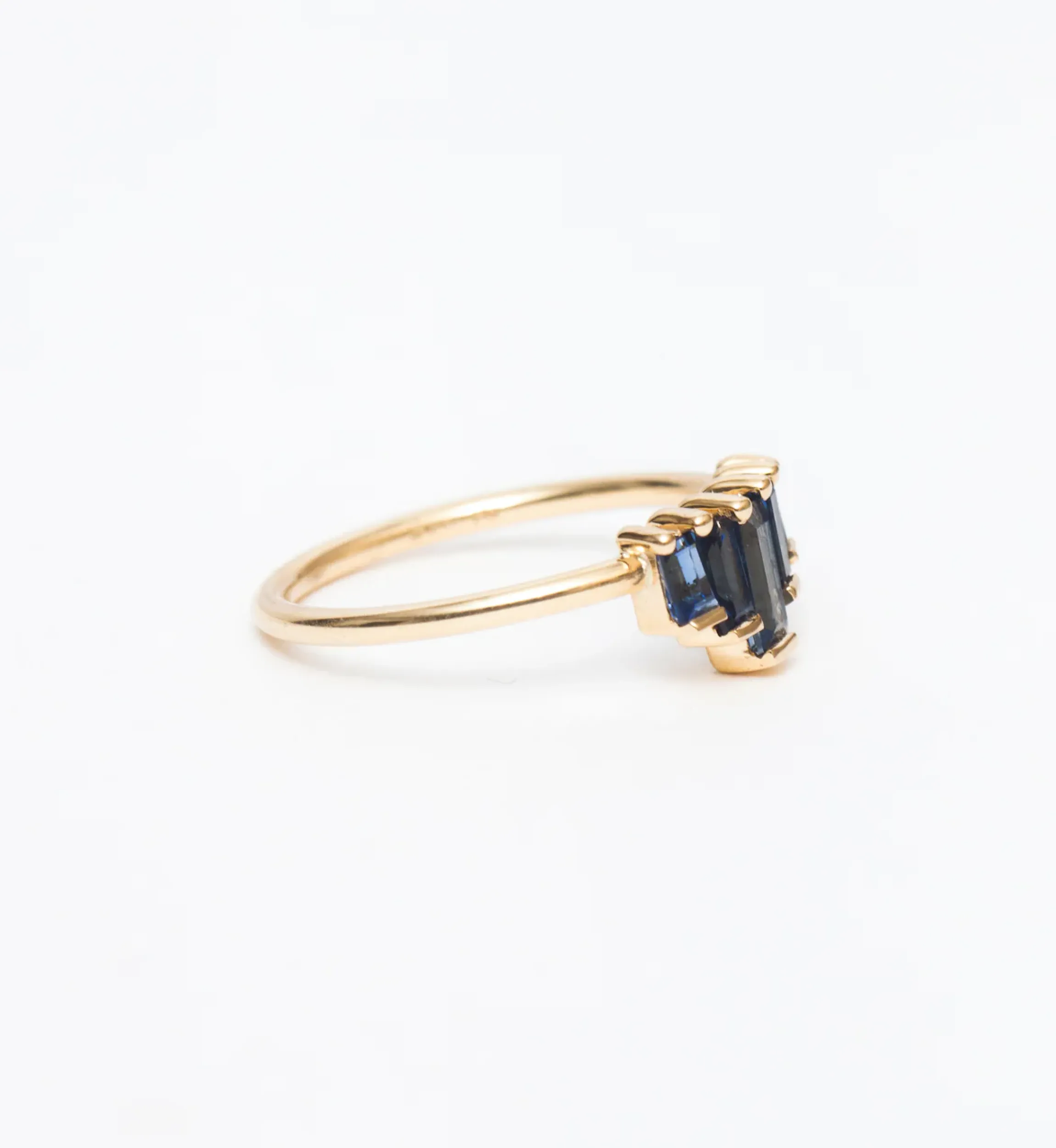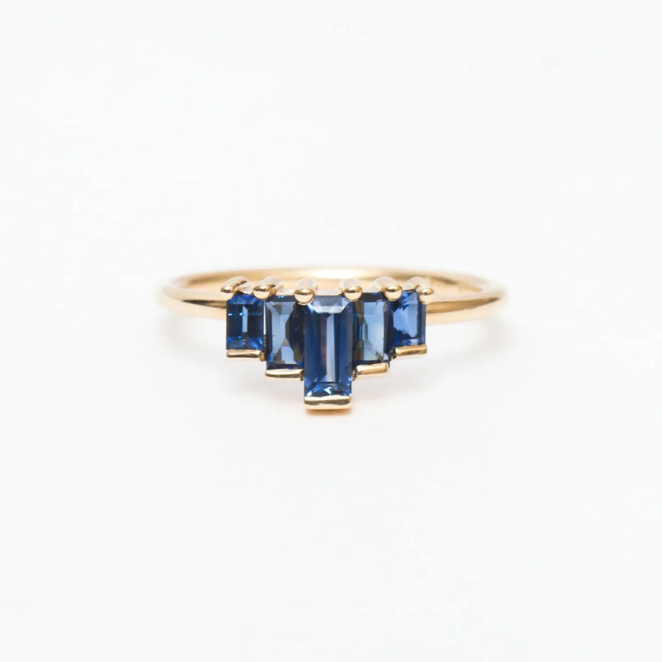 Designers Tanya and Tomer revisit their beloved Art Deco inspirations with a streamlined design perfect for the woman who craves color. A set of five blue sapphires are carefully composed into a miniature piece of architecture with flat half bezels and delicate round beads framing their shimmering facets. Wear it with a simple band to fuse classic and modern. Made in Israel.