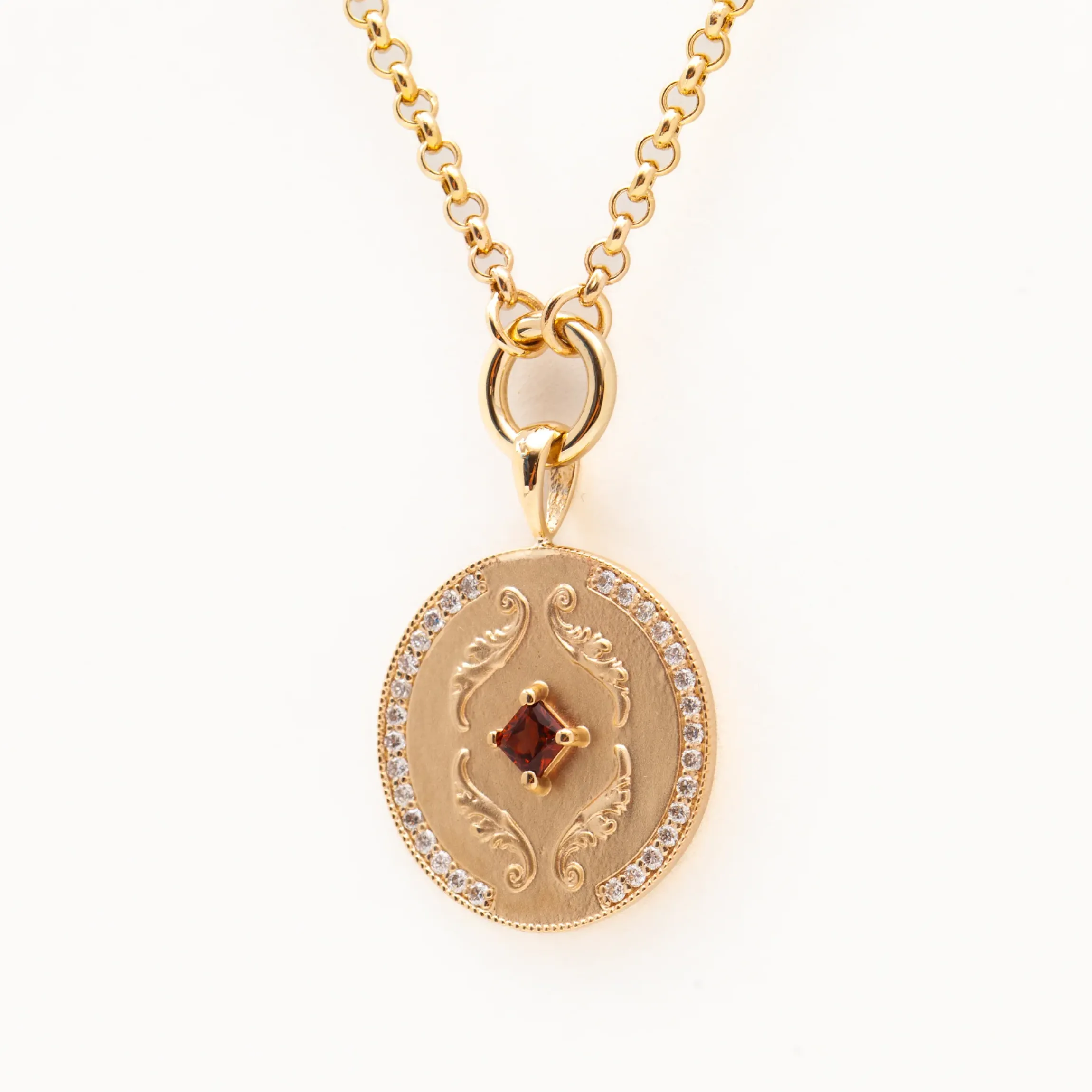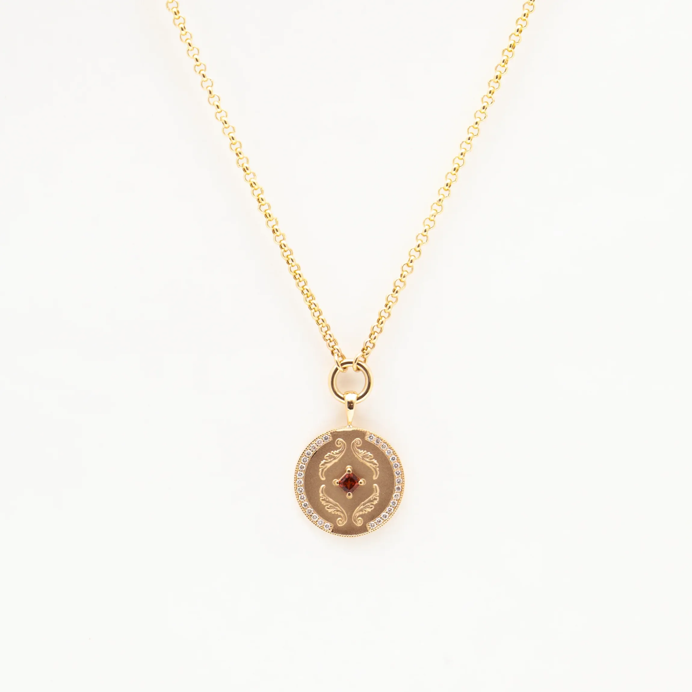 The combination of white pavé diamonds and a single red center garnet make this vintage-inspired necklace effortlessly modern. Suspended from a chunky gold ring, the lightly matted coin frames a compass-set princess-cut diamond with curling tendrils drawn from Art Nouveau delicate milgrain on the pendant’s edge. Made in New York.