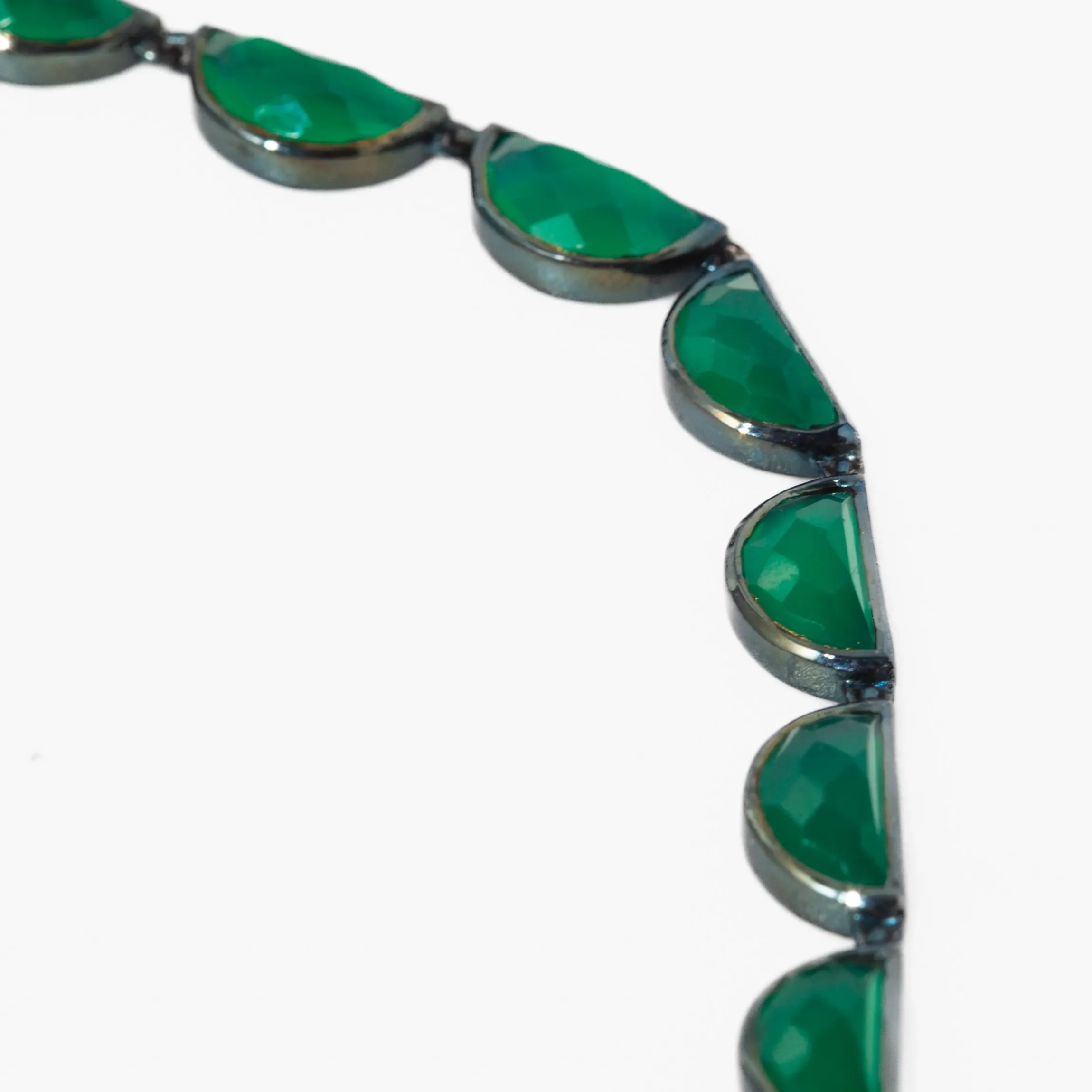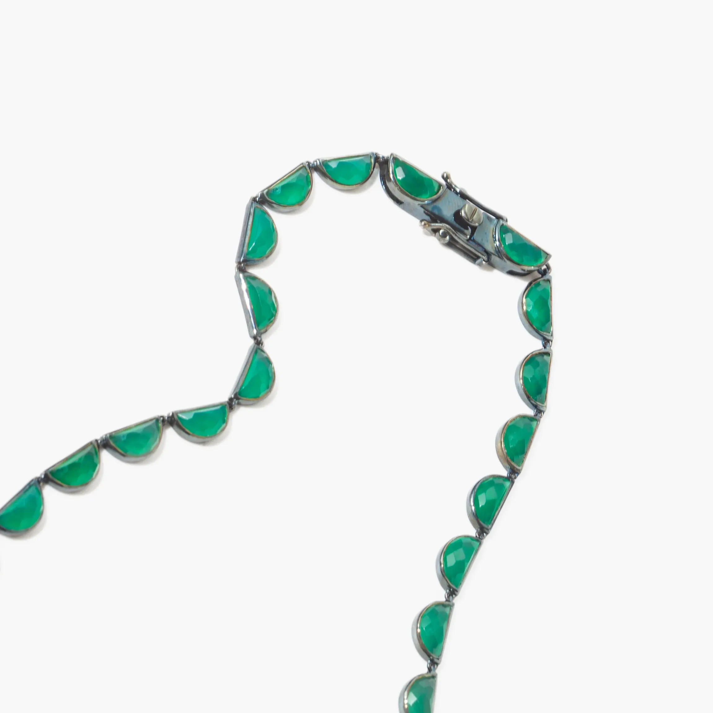 In true Nak Armstrong craftsmanship comes the Green Onyx Large Scallop Rivière Necklace, an innovative alternative to the traditional tennis necklace. Small crescent moon green onyx gemstones are set into thick sterling silver covered in blue rhodium bezels. Heavy in metal and stones, this is an ideal piece for those who like to express their individual style while simultaneously loving color. Designed in Austin, Texas.