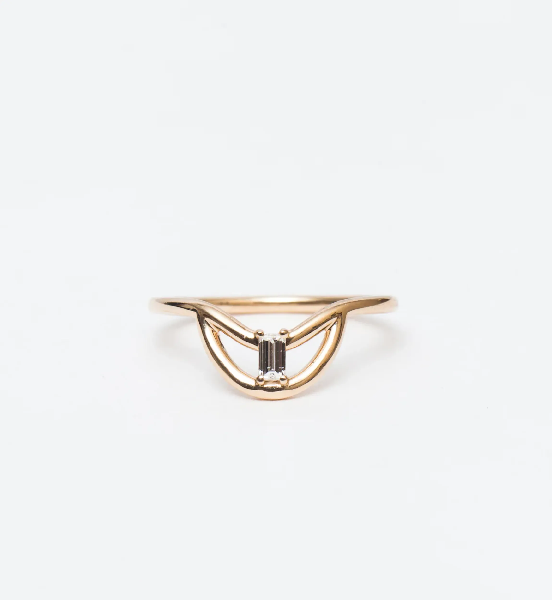 In a departure from the diamond dusted bands she’s known for, Anna Sheffield crowns this sculptural stacking band with a single stone. A solitary baguette diamond bridges the double arcs of gold on this ring. As much as we love crowning an engagement ring with its unforgettable silhouette, we’d also suggest putting it on another hand as a special little something for everyday wear, too. Designed in New York.