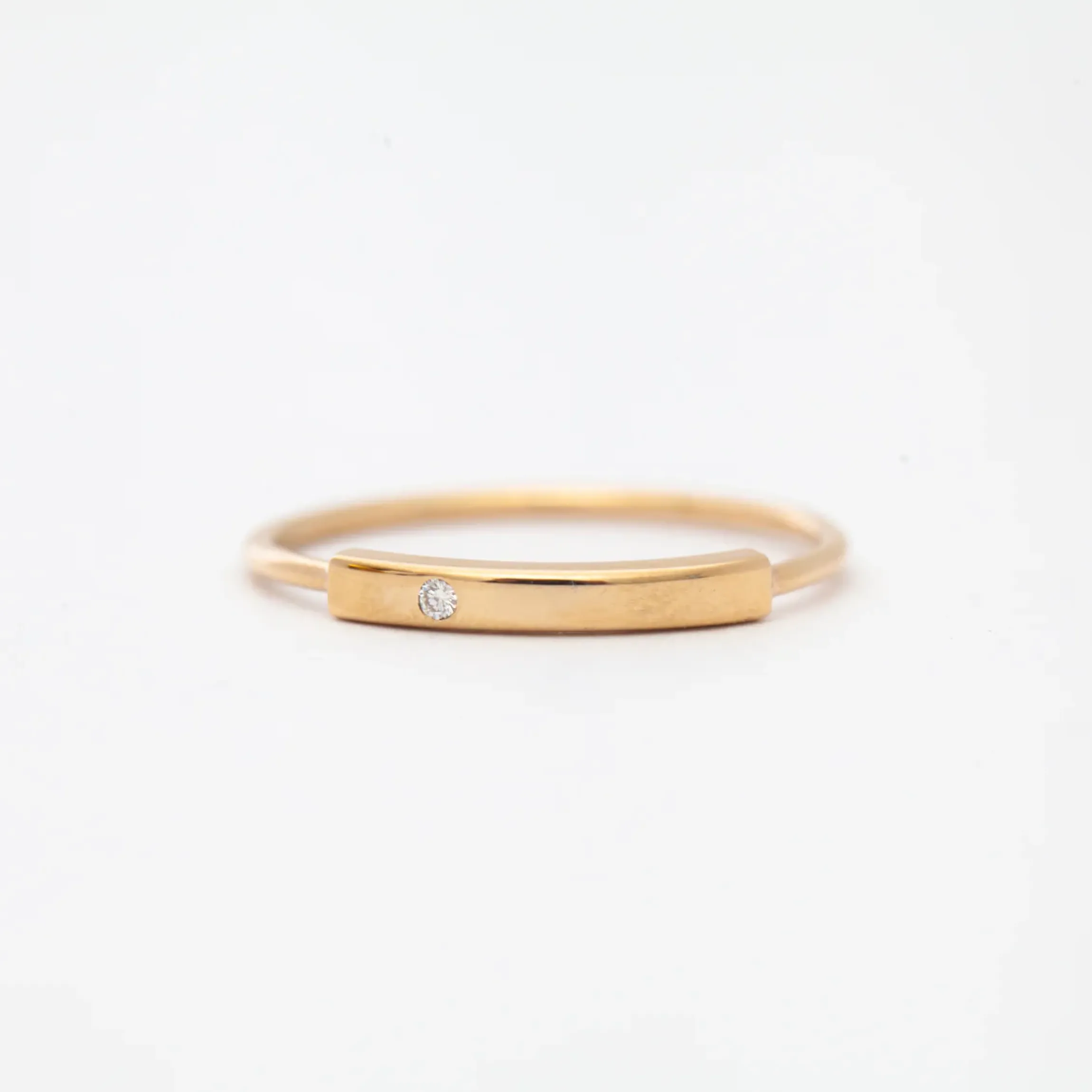 Zoe Chicco’s delicate rings are the perfect addition—or starter!—to any ring stack. This gold horizontal bar ring with an off-set white diamond is no exception, featuring just a touch of sparkle against the smooth gleam of solid gold. Wear it alone or stacked with more textural bands for a subtle touch of luxury that goes with everything. Made in the U.S.A.