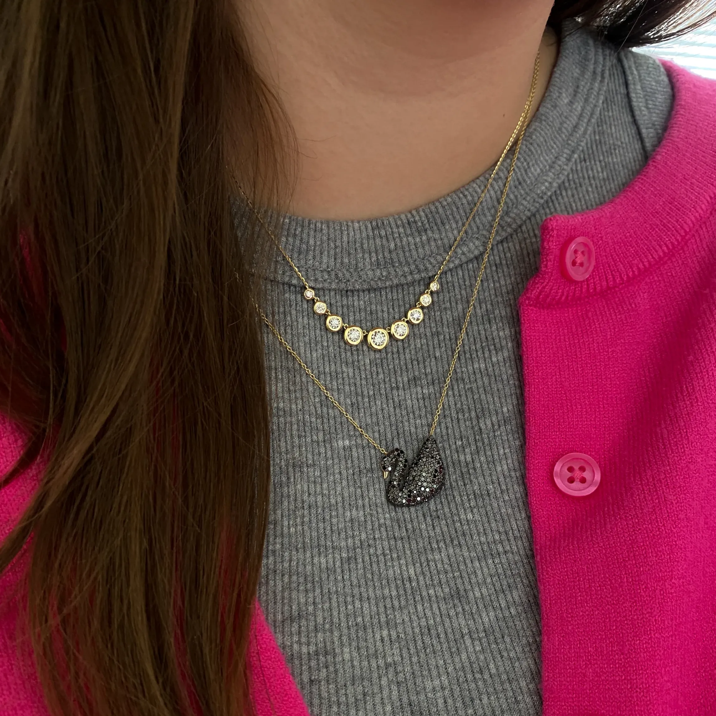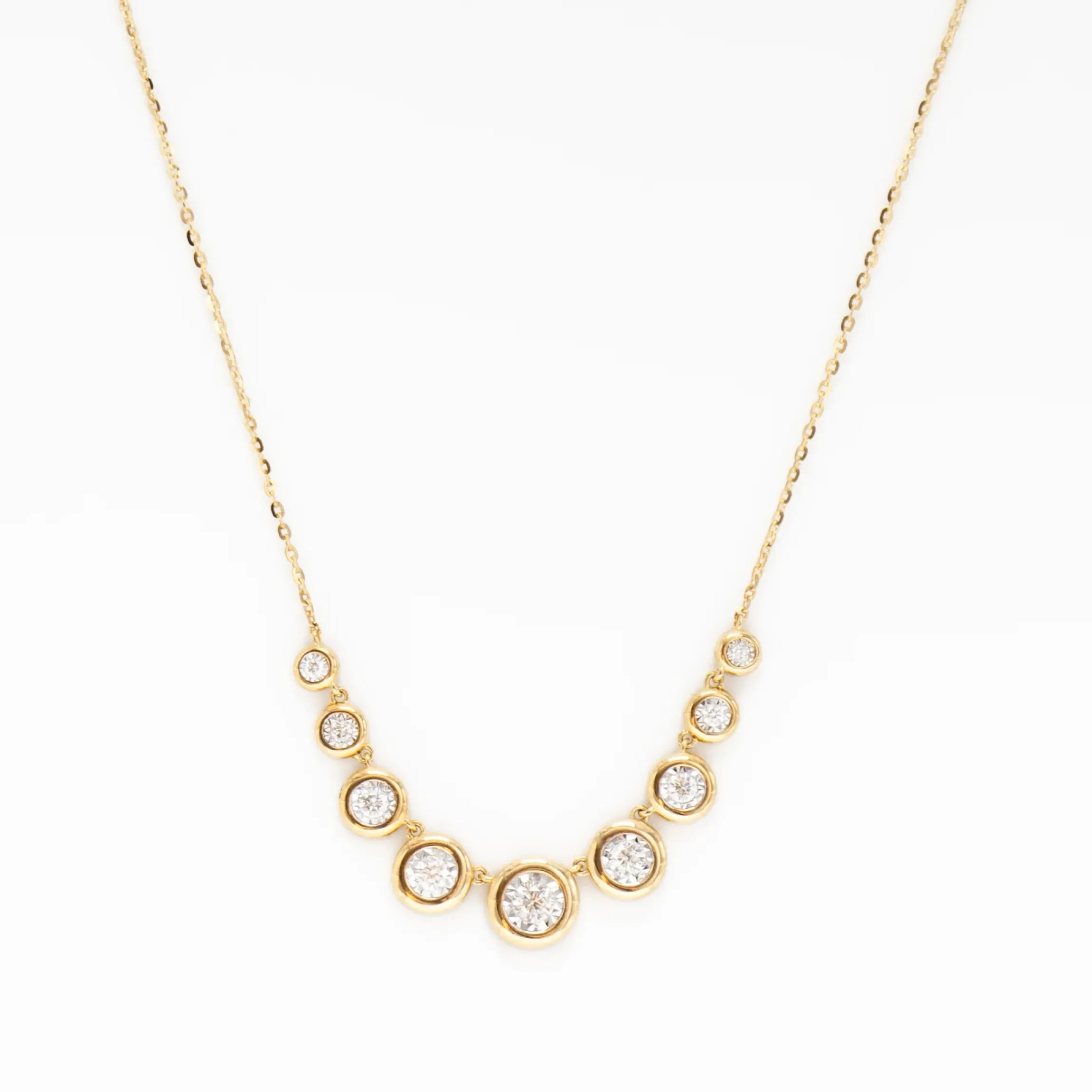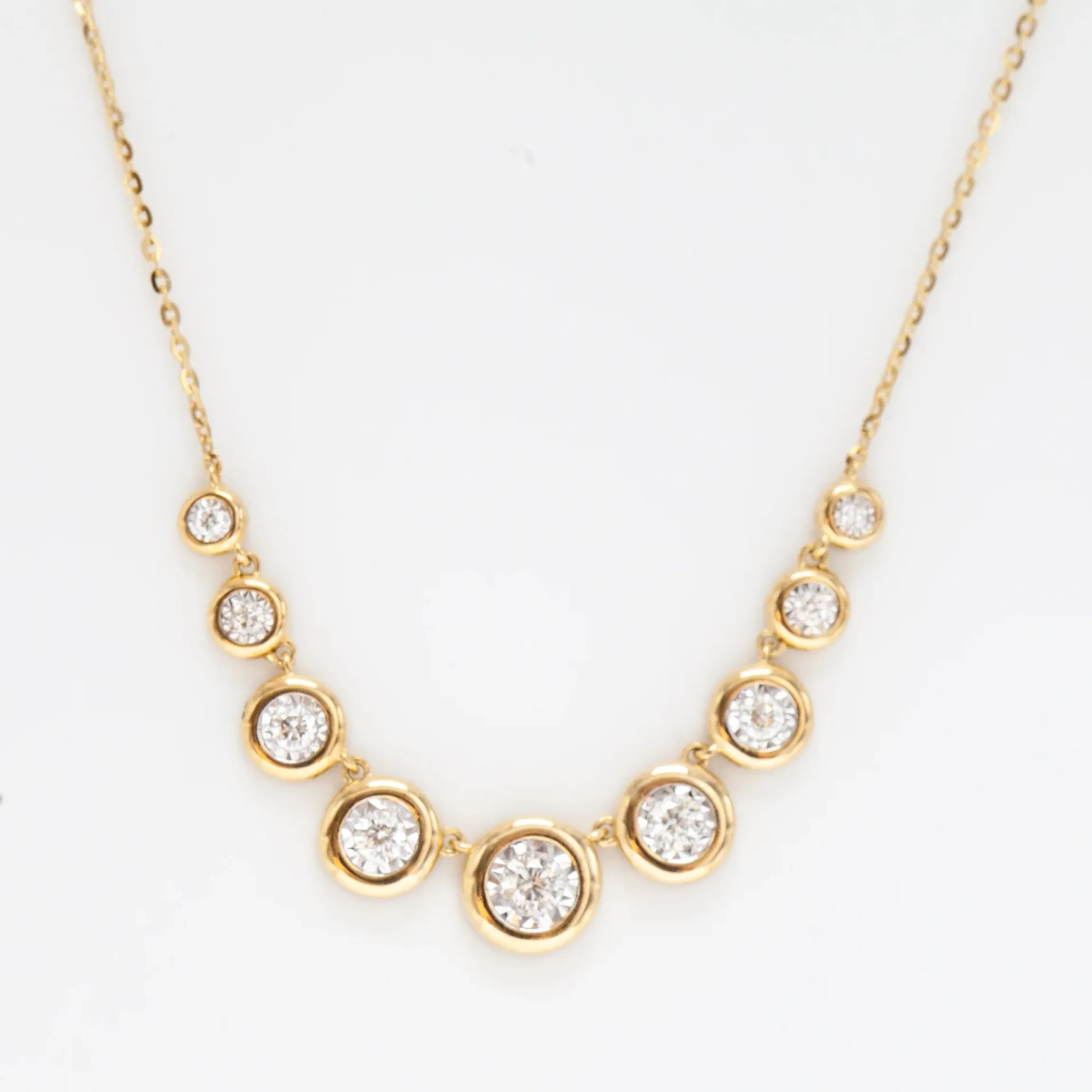 This graduated necklace is a fun and simpler take on the tennis necklace. This version features an illusion-set design with intricate facets that create a larger, sparkling effect for its nine graduating diamonds. Wear it alone for a subtle touch or pair it with chunkier necklaces for a bold contrast. Finished with a clasp closure.