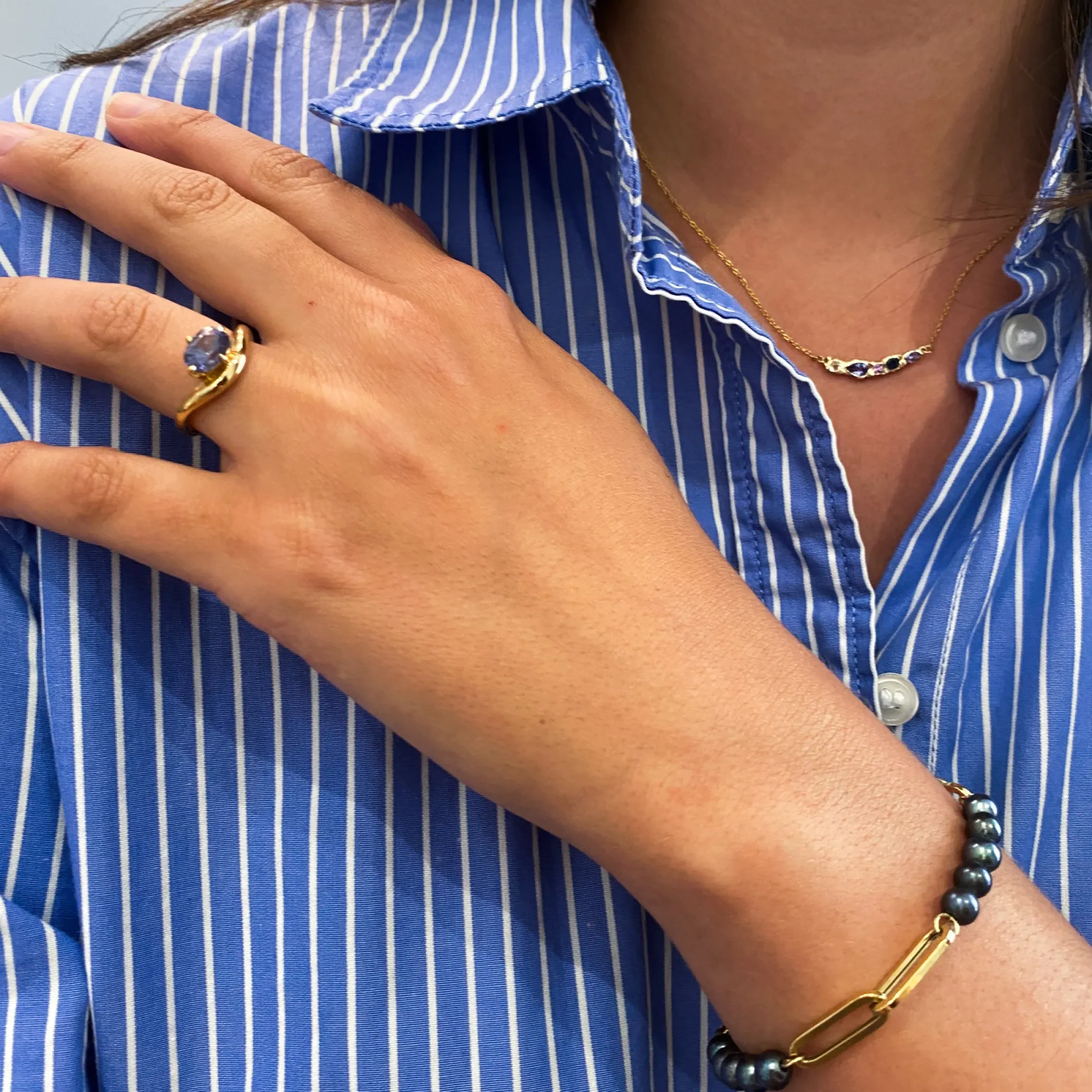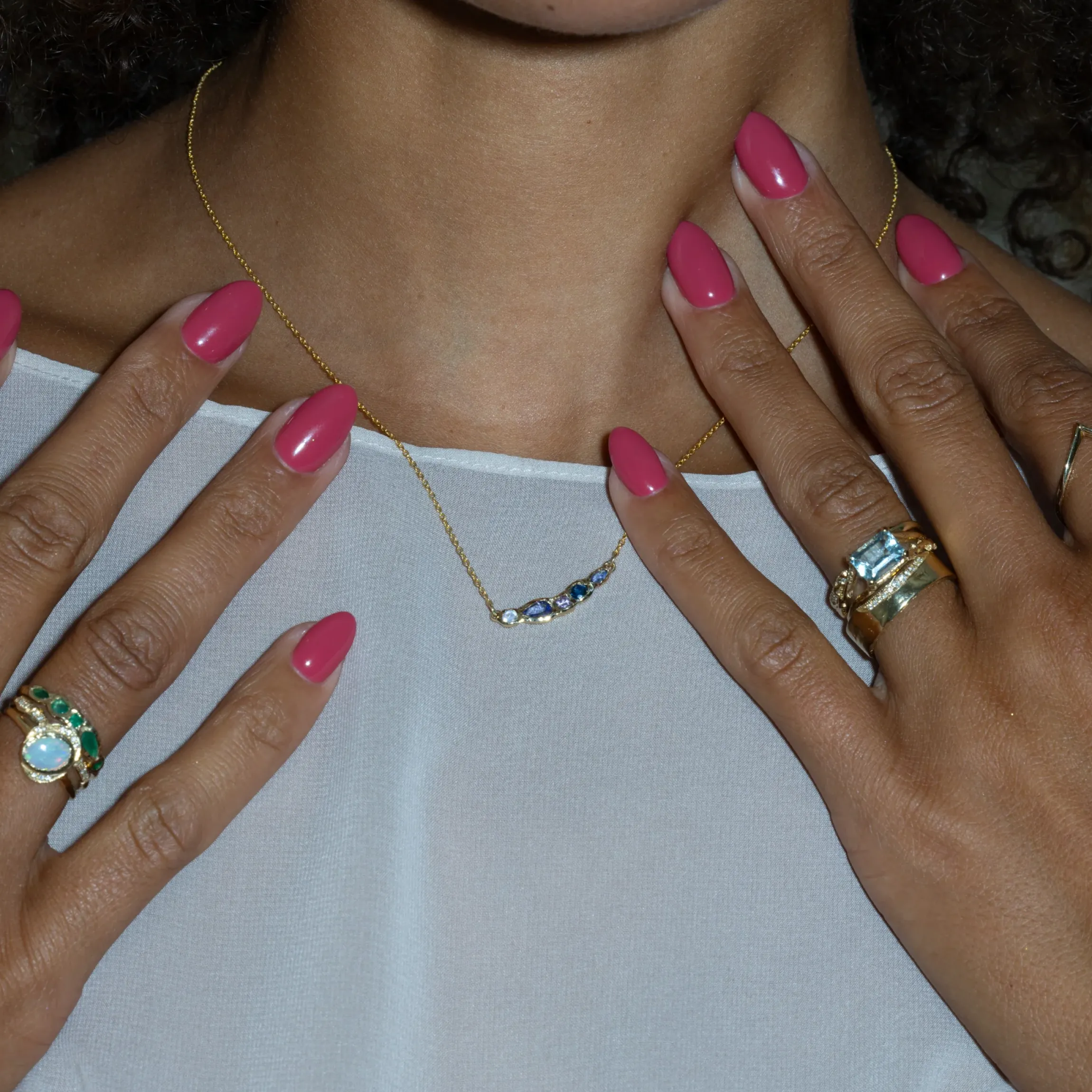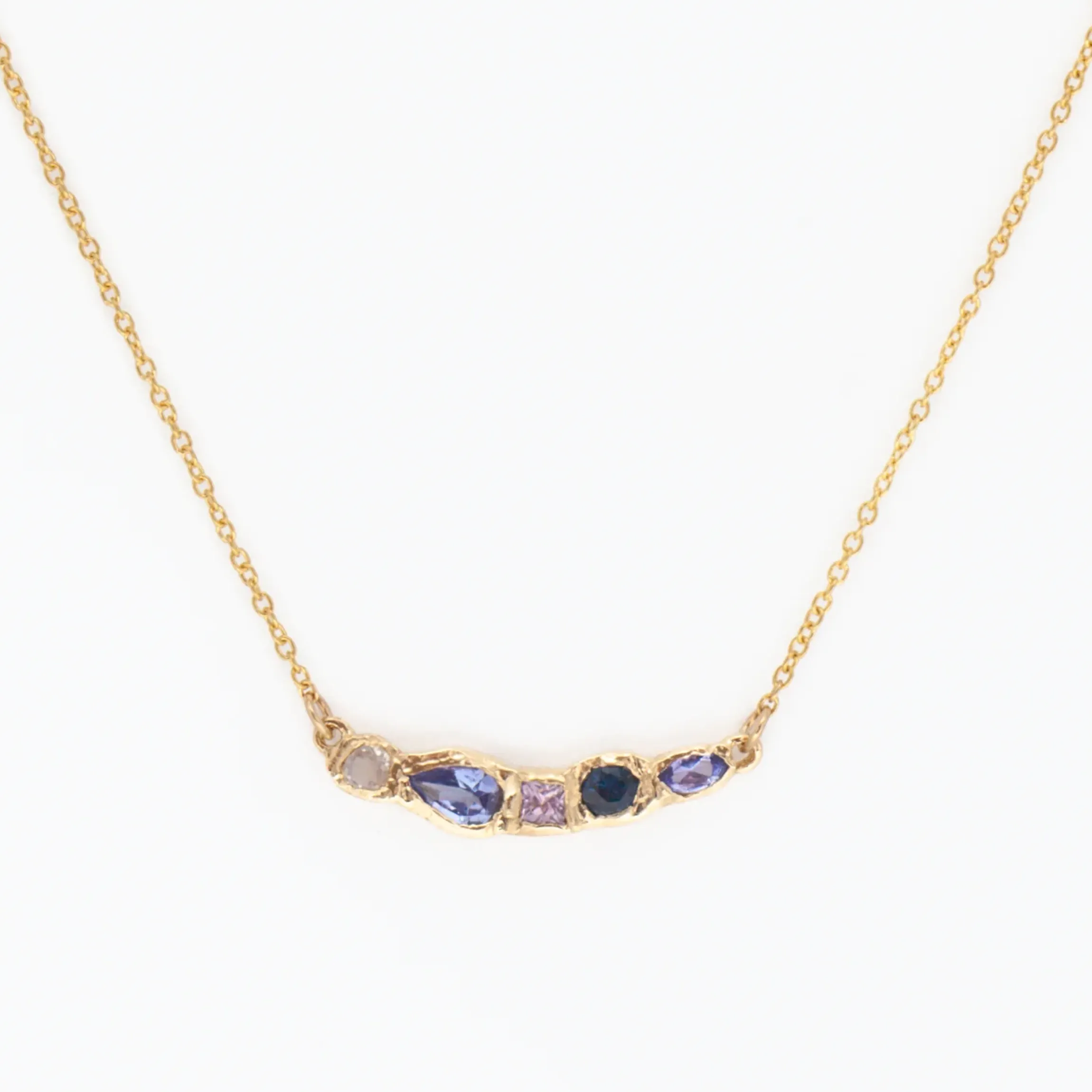 14 karat yellow gold set with Rainbow moonstone, tanzanite, pink sapphire, blue sapphire and tanzanite.