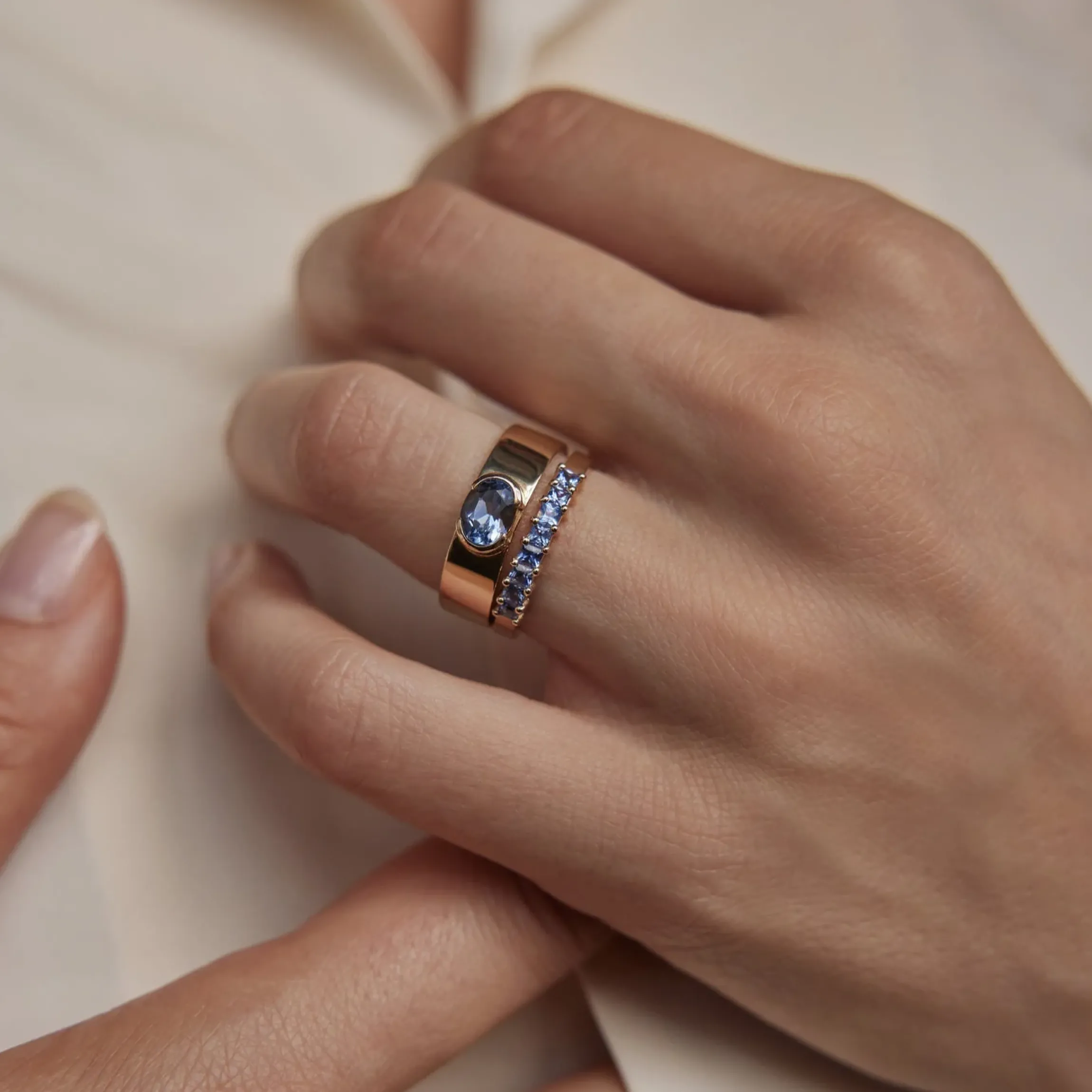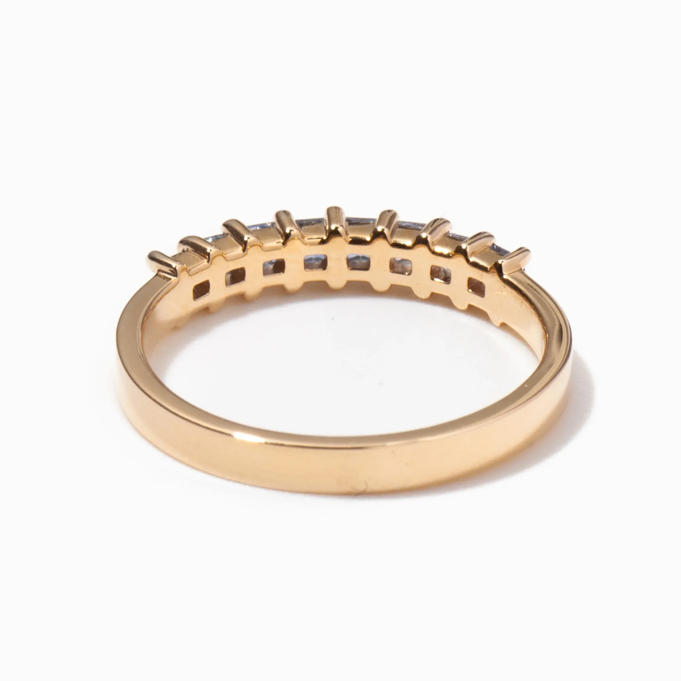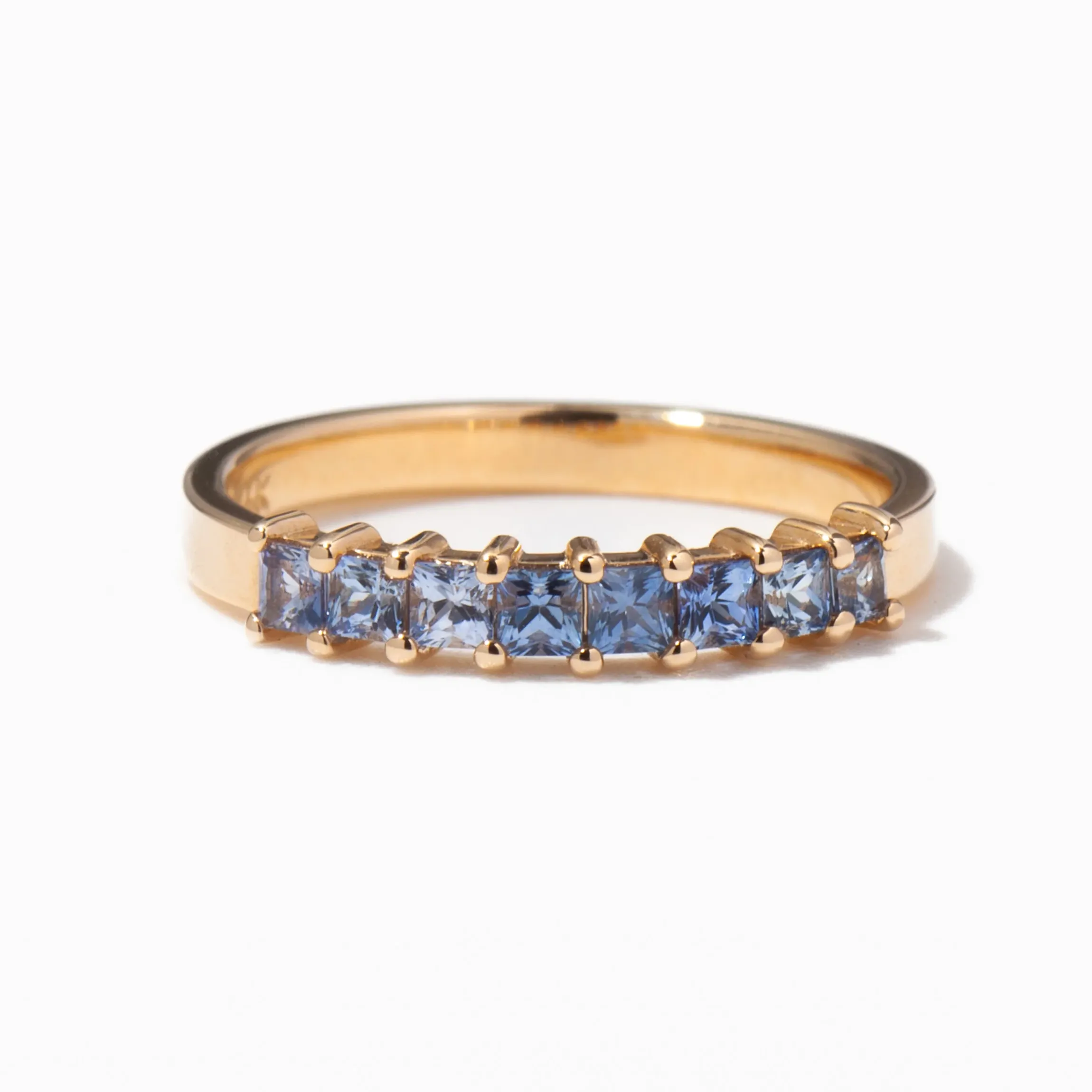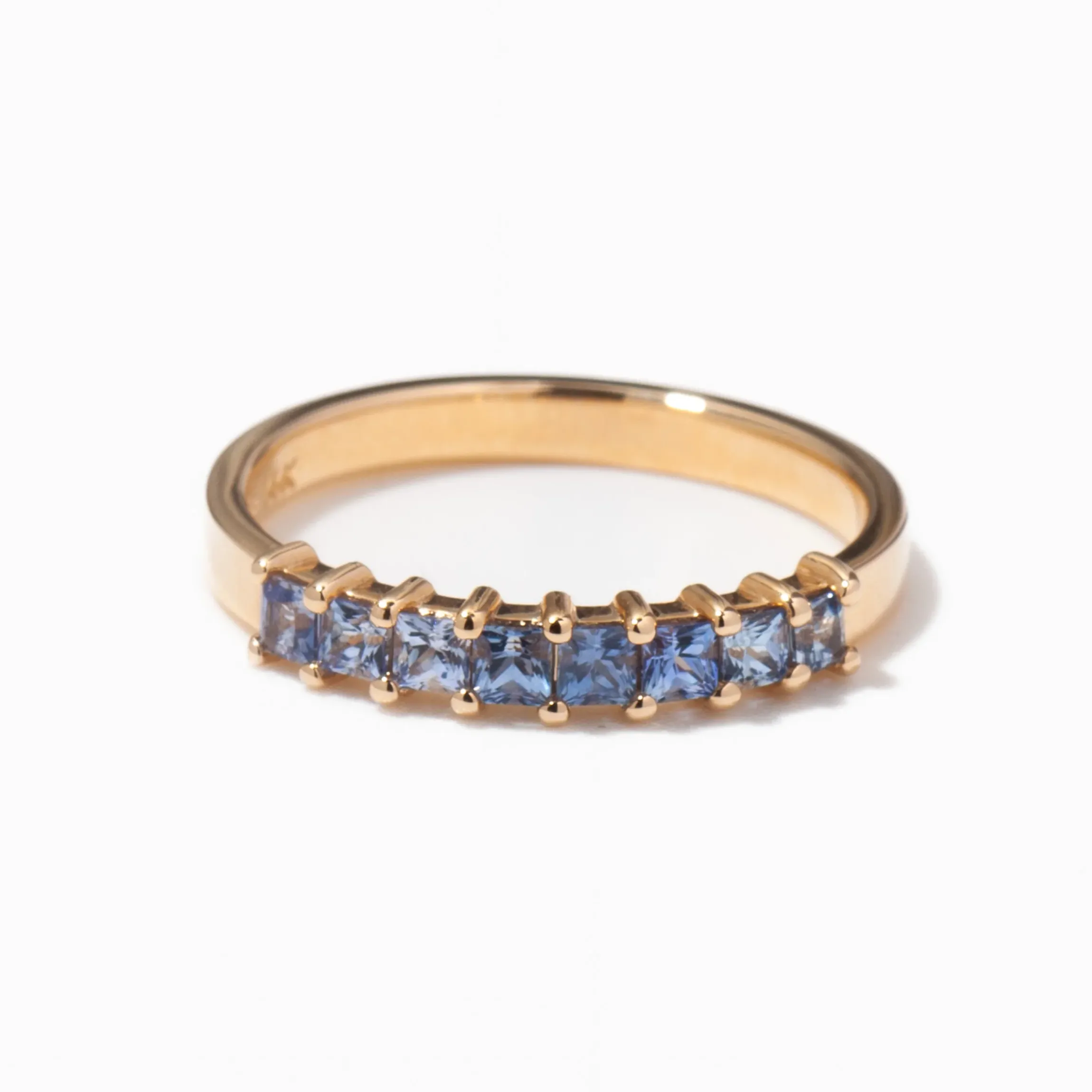 The power of a straight line lies in its simplicity while remaining strong, and beautiful. A good, solid, foundation to commemorate your next step in life. This ring features 8 princess-cut blue sapphires making for a beautiful band with an unexpected pop of color.