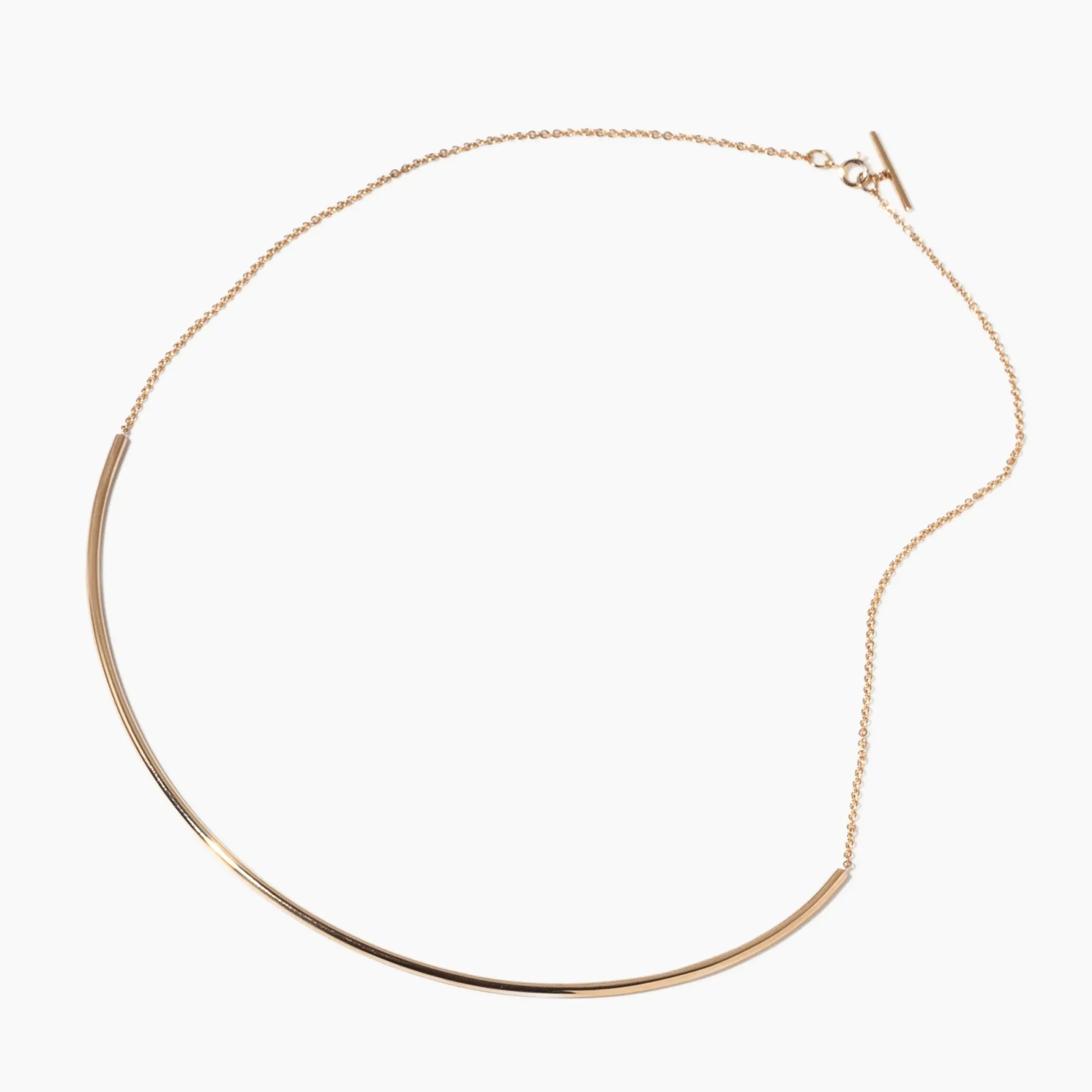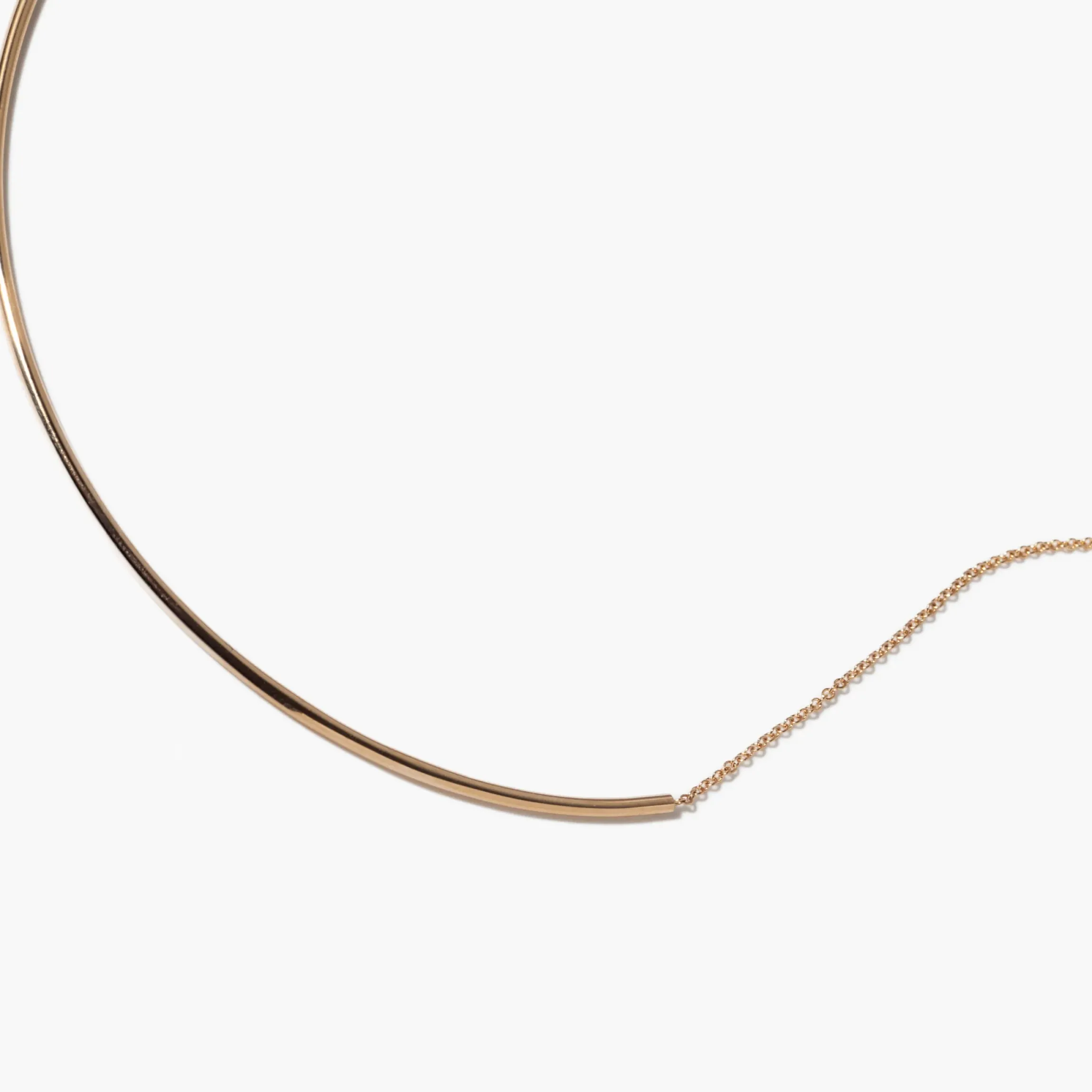 A golden arc teams up with a delicate cable chain to make a gorgeous choker style. SHW is inspired by minimal forms, the collection embraces the unusual and honors individual style, as well as the intimate ritual of wearing jewelry. Designed and handmade in NYC.