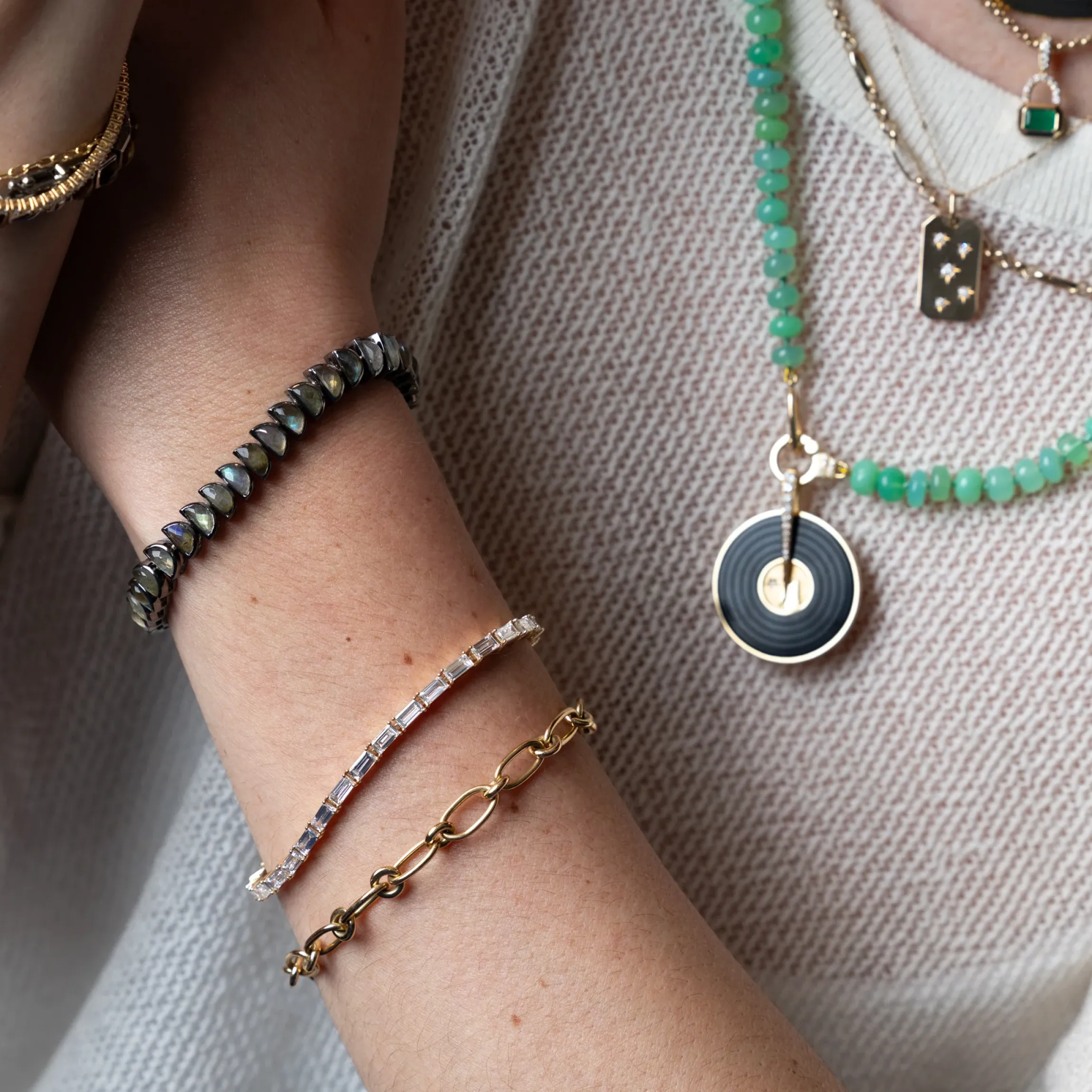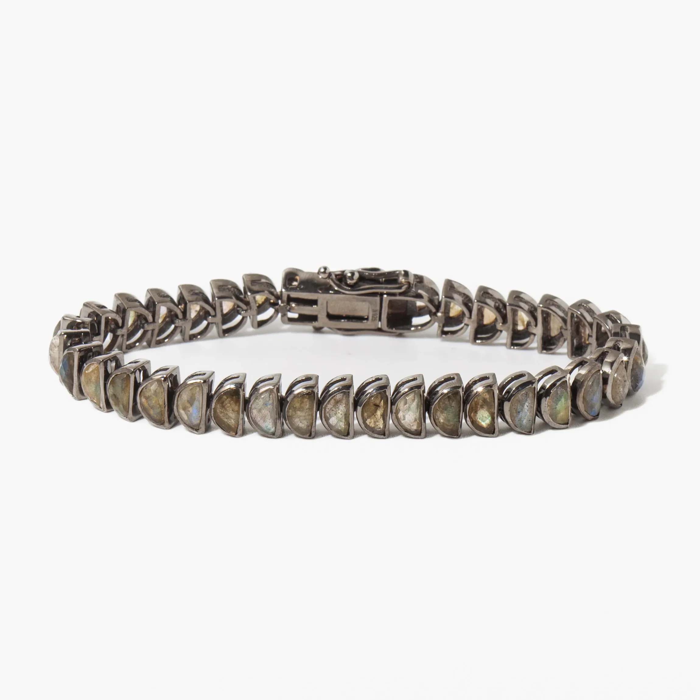 Escape the ordinary with this modern and daring labradorite tennis bracelet. Nak Armstrong’s affinity for intricate metalworking and alternative design make this the perfect bracelet to inspire bold style. Stand out from the crowd and make a statement with this one-of-a-kind piece. Designed in Austin, Texas.