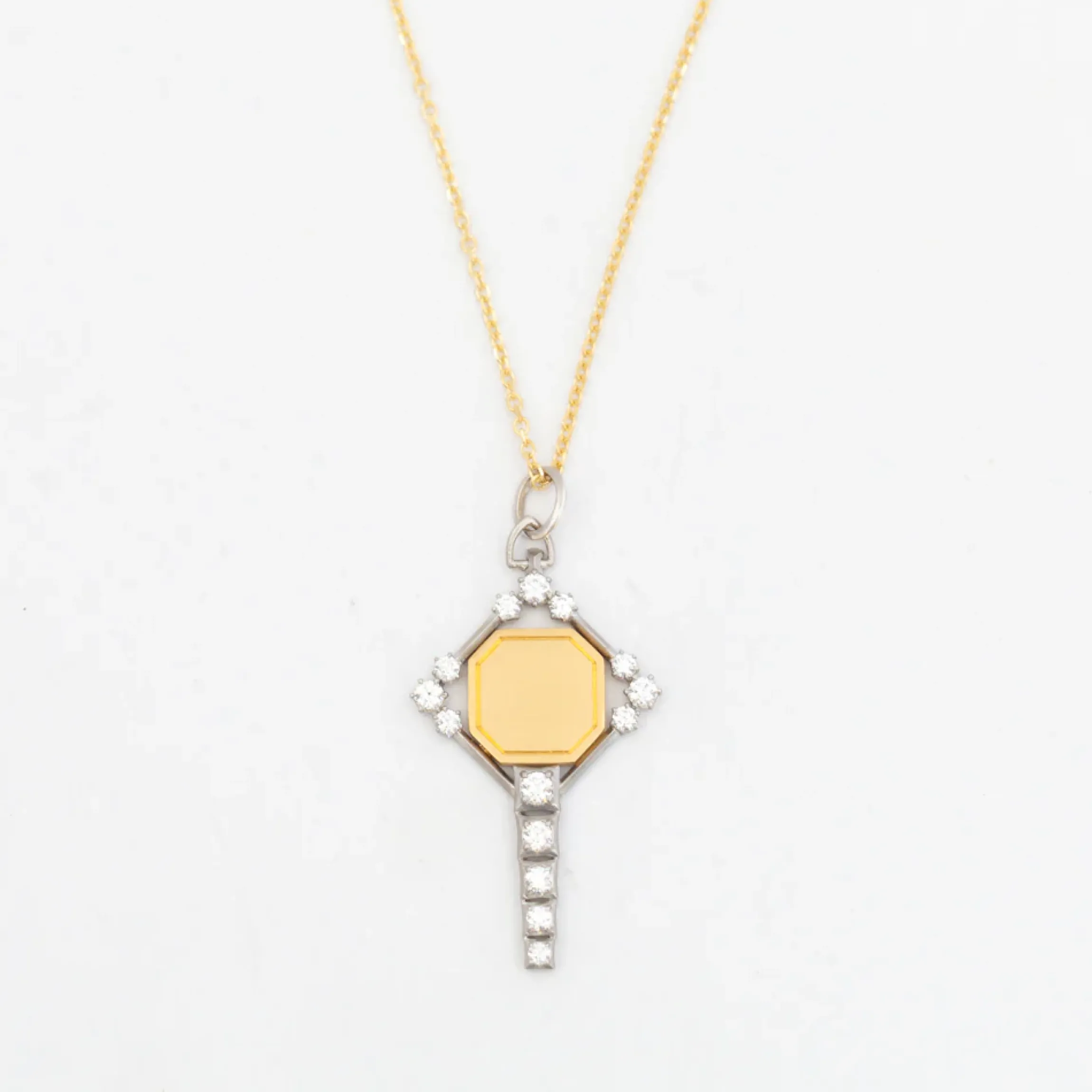 All the glory of Art Deco glamour contained in a single perfect charm, just waiting for you to customize it for yourself. Sparkling diamonds form the key’s “blade” and trace along its platinum frame while a rich gold center provides the perfect space for you to engrave a special message or monogram a loved one’s name. Made in New York.