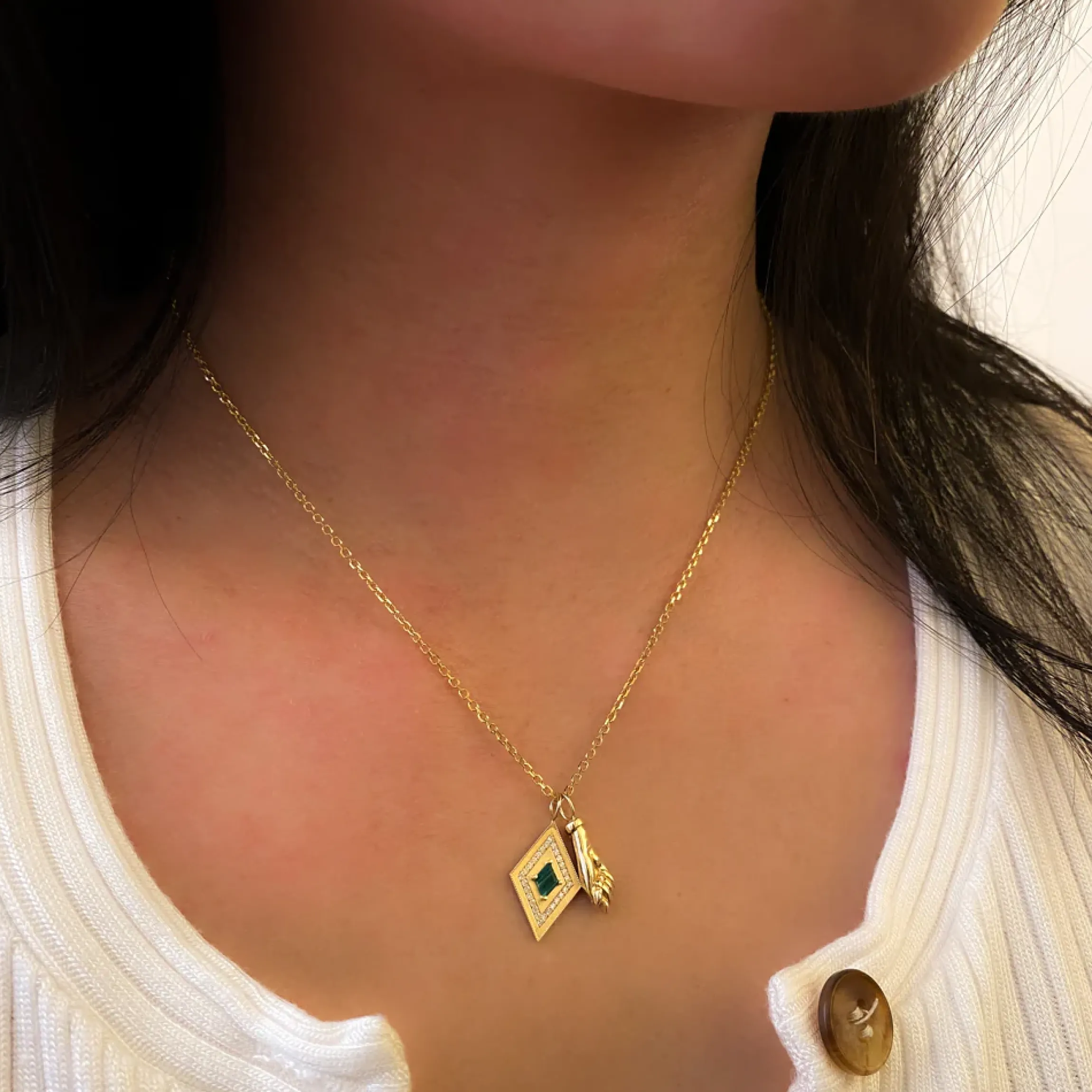 A ripple of diamond shapes in gold, diamond, and green malachite reflect the light from all angles in this beautiful amulet by Vale. Complete with milgrain edging, its strong lines and subtle sparkle make it a perfect adornment to any outfit, day or night. Shown here on our medium diamond-cut cable chain. Made in the U.S.A.