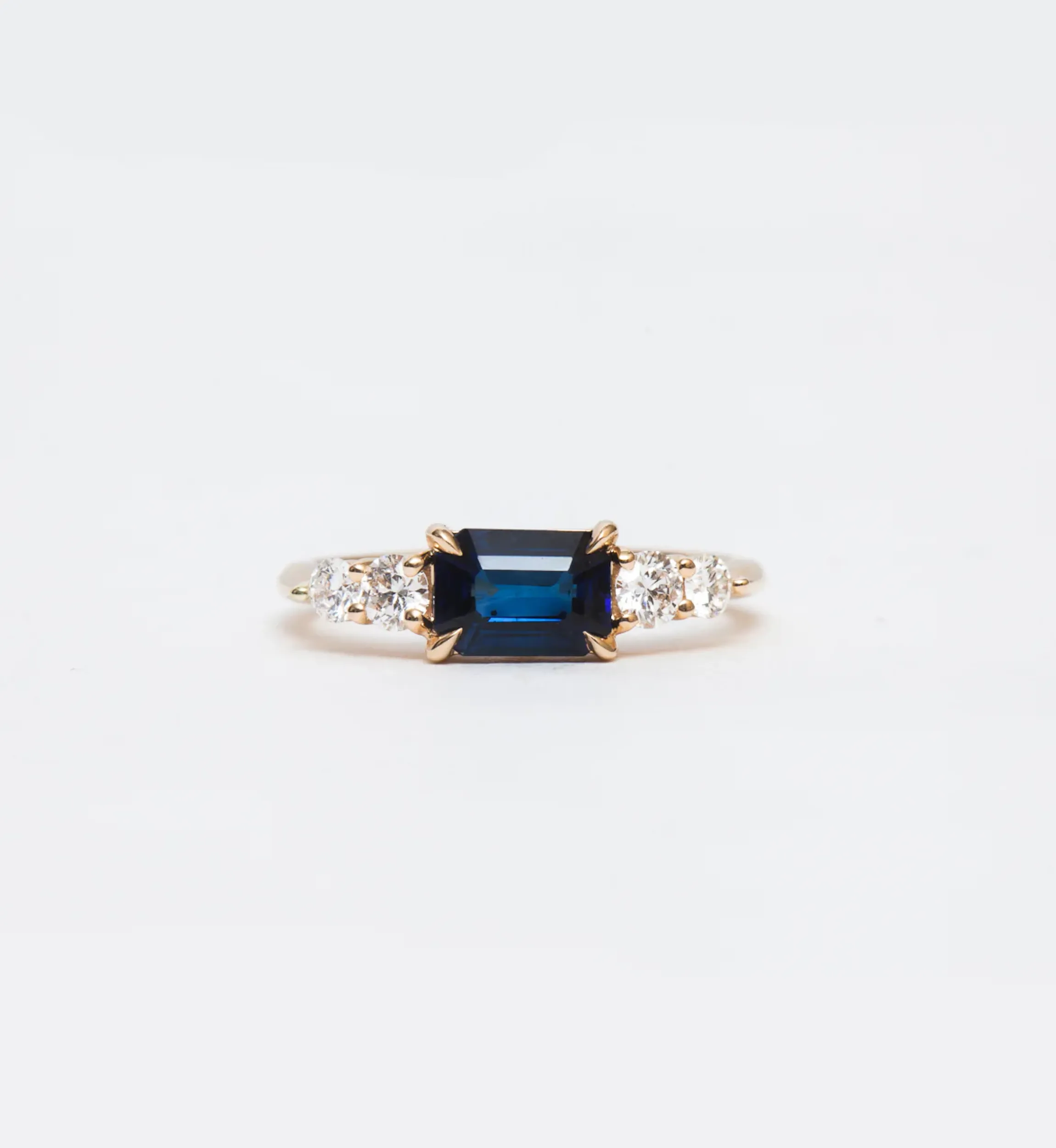 The delicate scale and architectural lines of this setting combine for a distinct silhouette unlike any other. This exclusive design by Anna Sheffield sets an emerald-cut sapphire horizontally on the hand with graduated round diamonds for a vivid mix of color and sparkle that sits neat and compact on the finger. Stack it with a classic eternity band for a timeless complement to this ring’s modern attitude. Designed in New York.