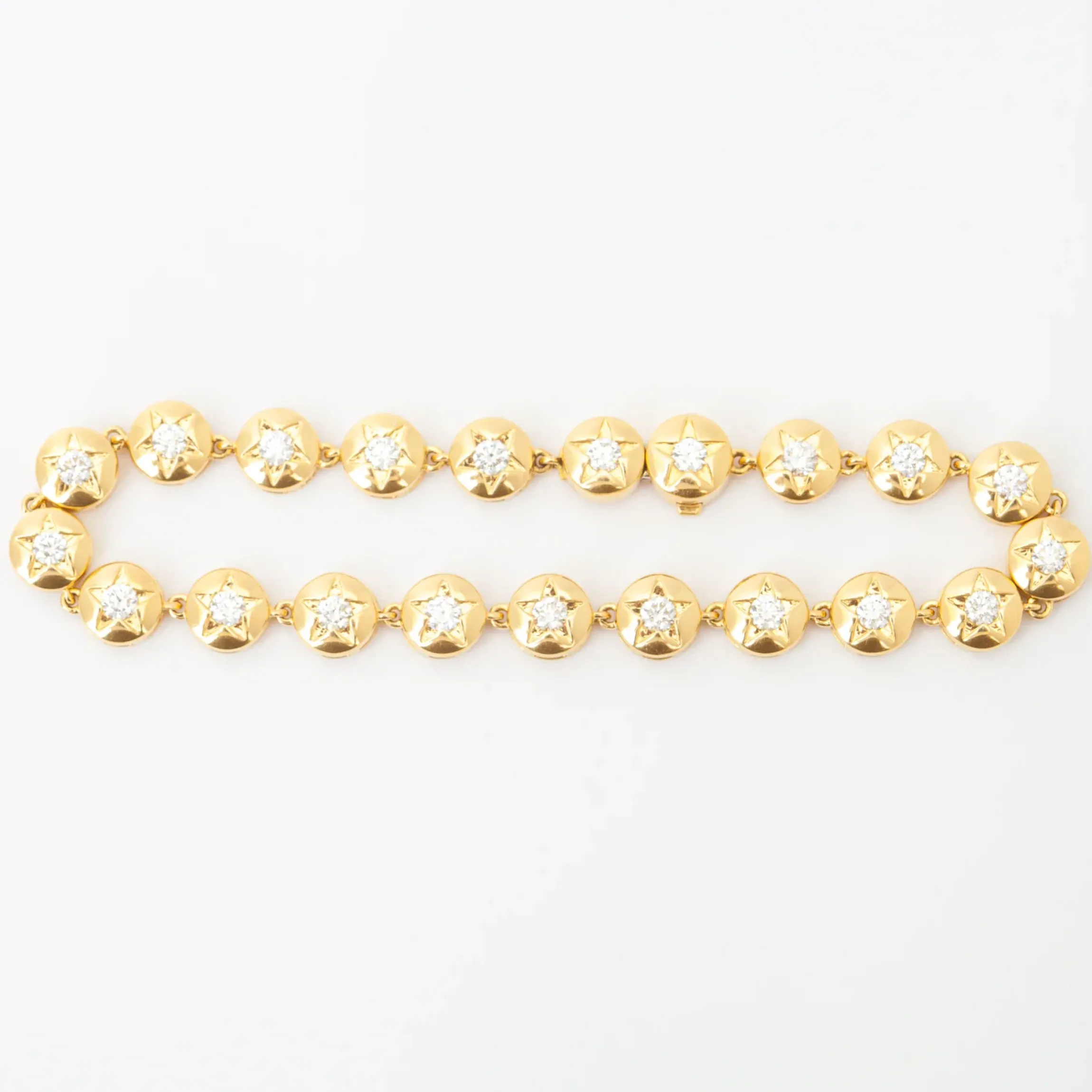 We can guarantee you have never seen a tennis bracelet like this before. Designed for those who want to make a statement with their jewelry, this bold diamond bracelet is truly a showstopper. Adorned in gorgeous gold star details and round white diamonds, this is a beautiful piece from New York jewelry design house, Sorellina. There is a harmonious dichotomy by seamlessly blending opposing ideas of feminine with masculine and vintage with modern. Finished with a lock clasp.