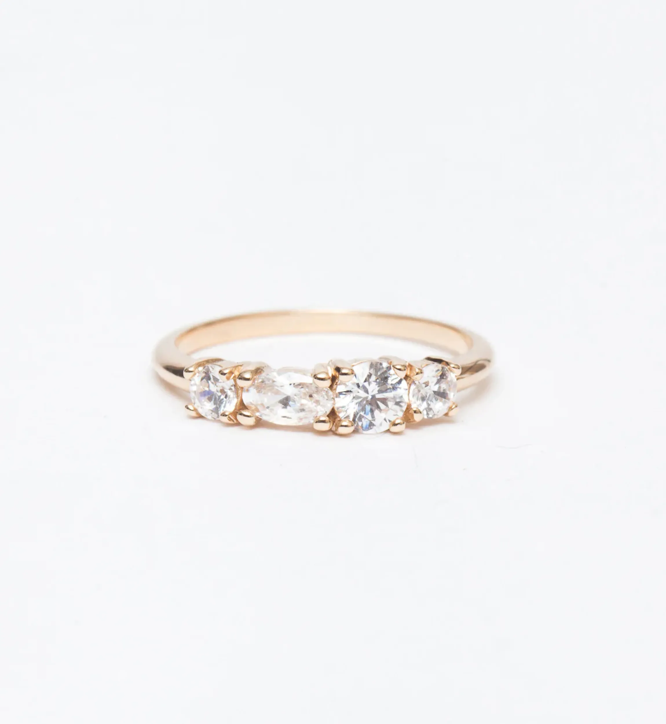 Subtle differences in shape and scale make all the difference in this four-stone diamond ring. Three full-cut round diamonds and one oval diamond are ingeniously arranged so that no two stones of the same cut or size touch; each stone commands attention on its own, while still creating a unified whole. The sleek, linear setting is perfect for someone who loves the sparkle of diamonds, but dislikes the idea of settling for a single stone. Wear it as an alternative engagement ring, an unconventional wedding band, or a stunning anniversary band. Made in the U.S.A.