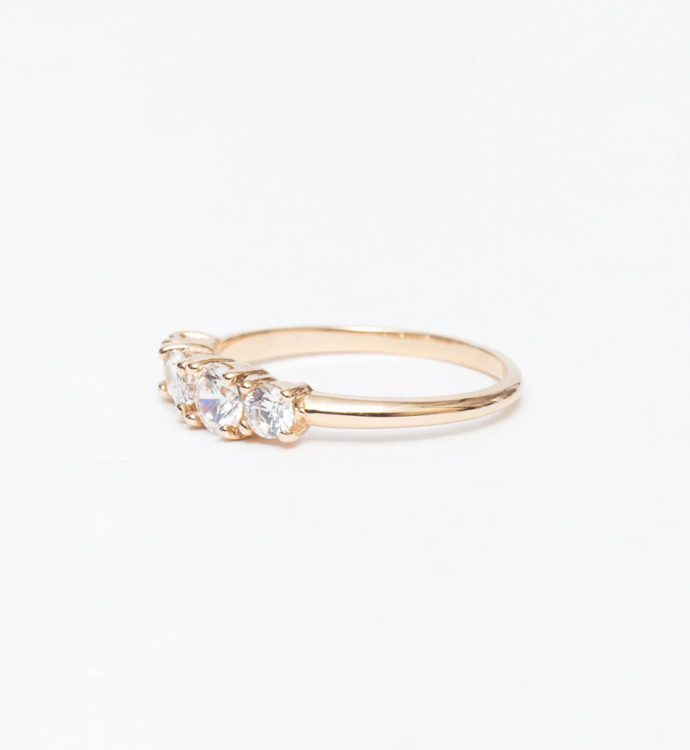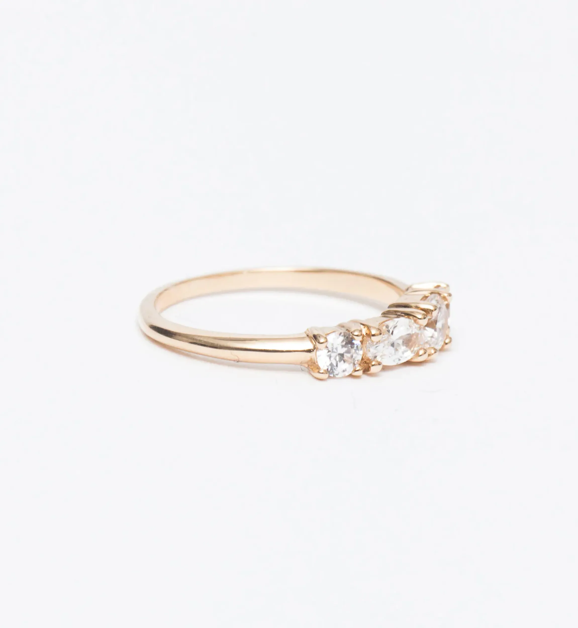 14 karat reclaimed gold with 0.60 carats of diamonds (one 5 x 3 mm oval, one 4 mm round, and two 3 mm rounds).