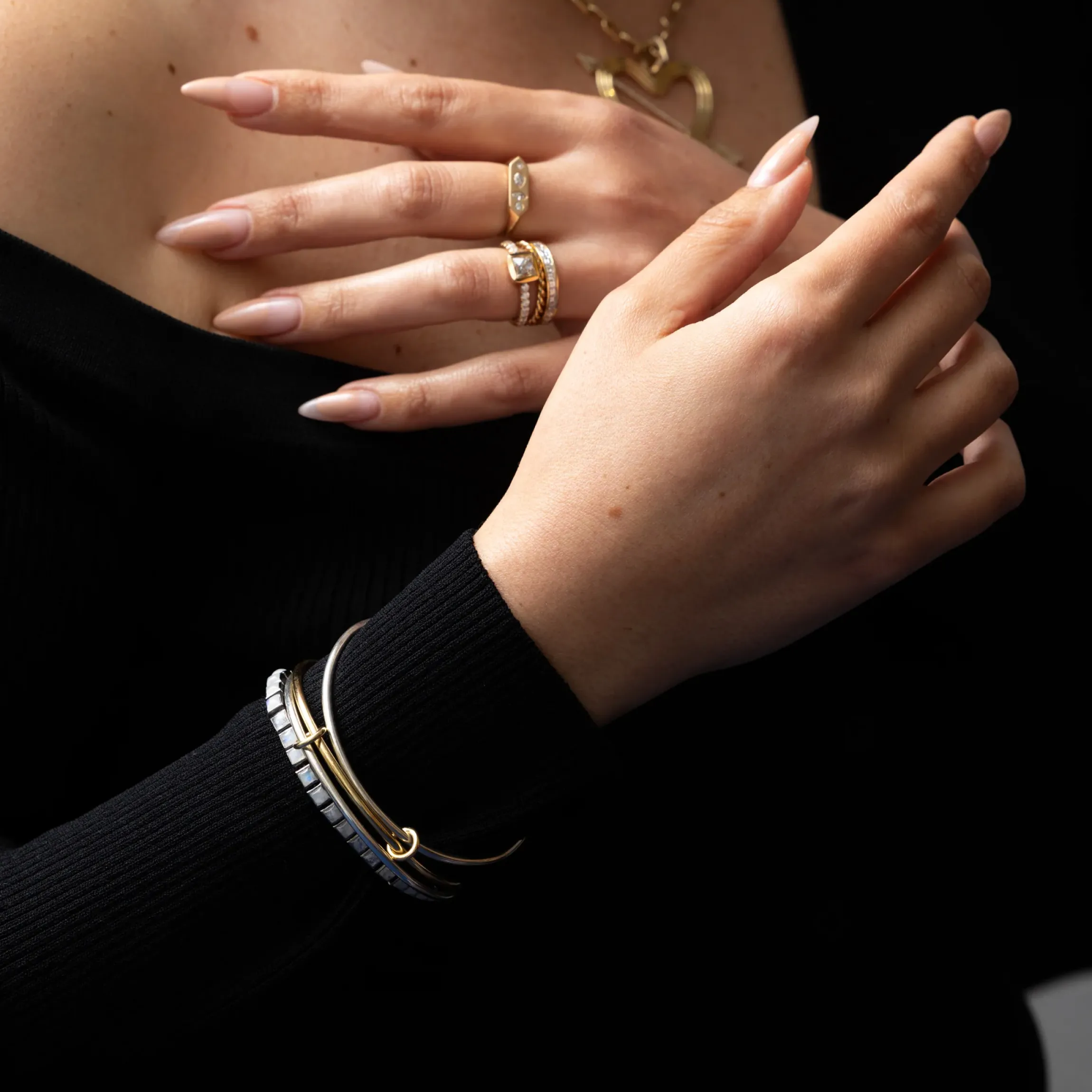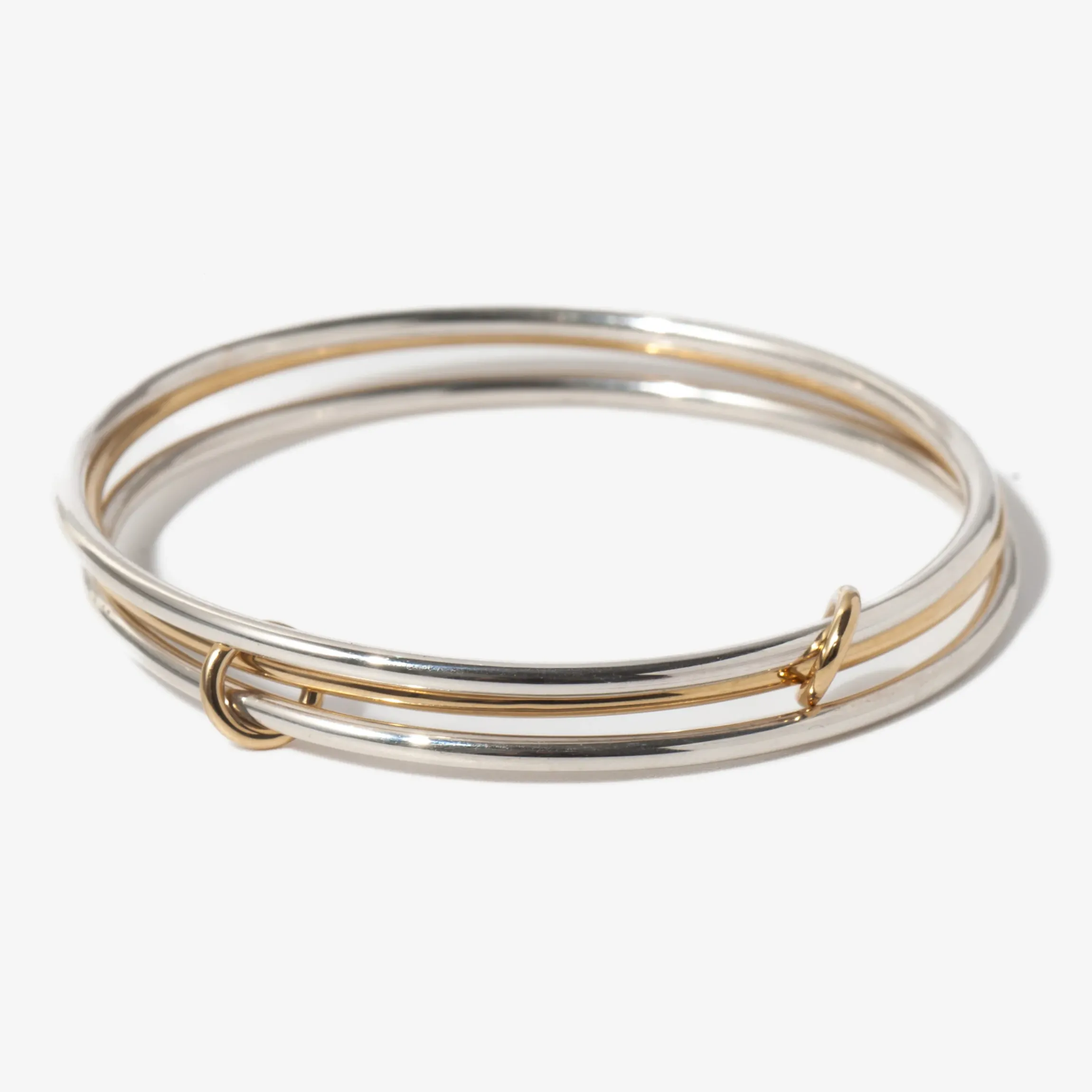Spinelli Kilcollin’s signature design, features three circular bands all connected with golden loops, but this time transformed into a playful bracelet. This eye-catching masterpiece pushes the boundaries of jewelry design with its unique mix of metals and circular loop motif, cementing Spinelli Kilcollin’s top spot in the industry. Individually handmade in Los Angeles.