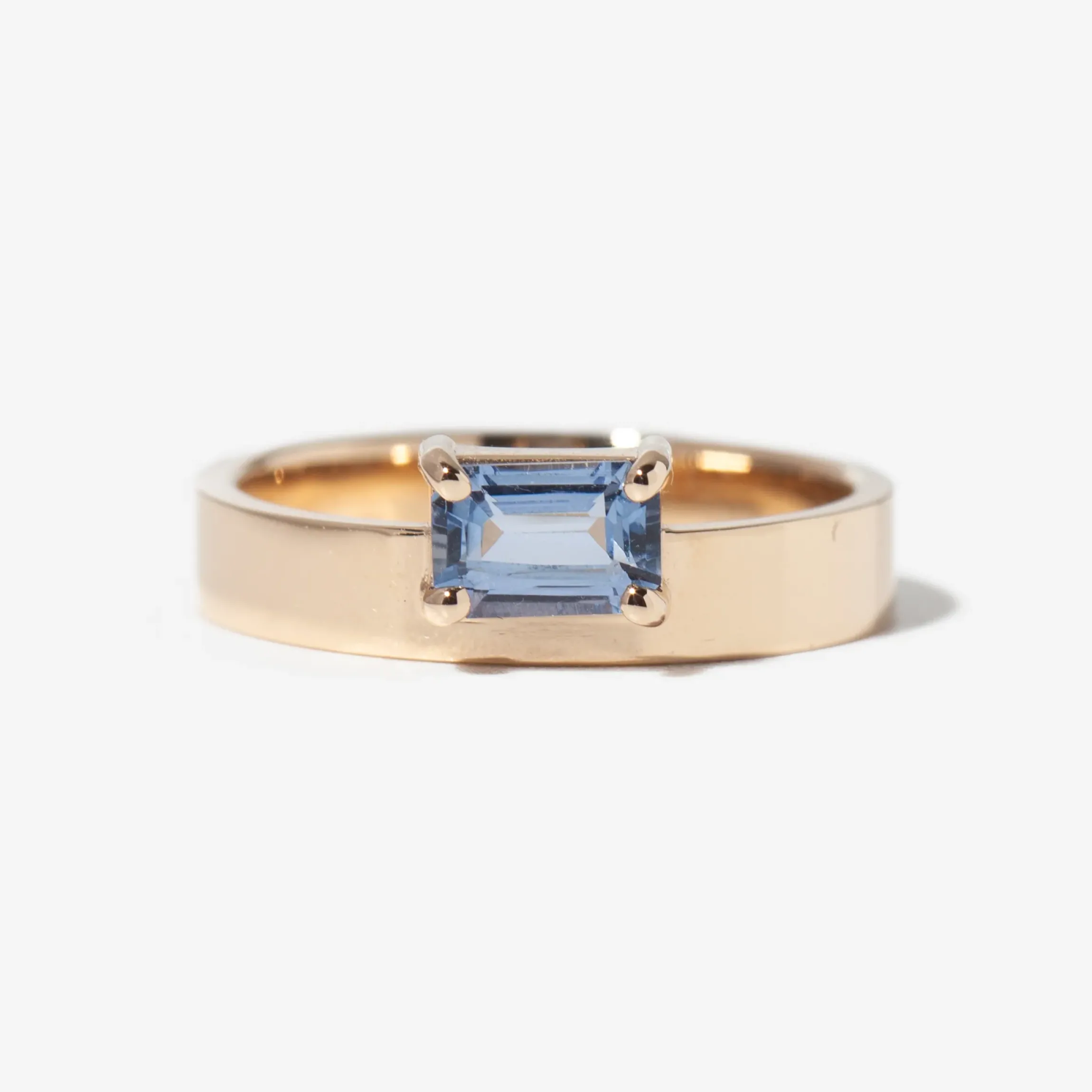 14 karat gold set with one emerald-cut blue sapphire, with Sri Lanka origin totaling approximately 0.65ct. All stones are one-of-a-kind and will vary slightly in scale or color.