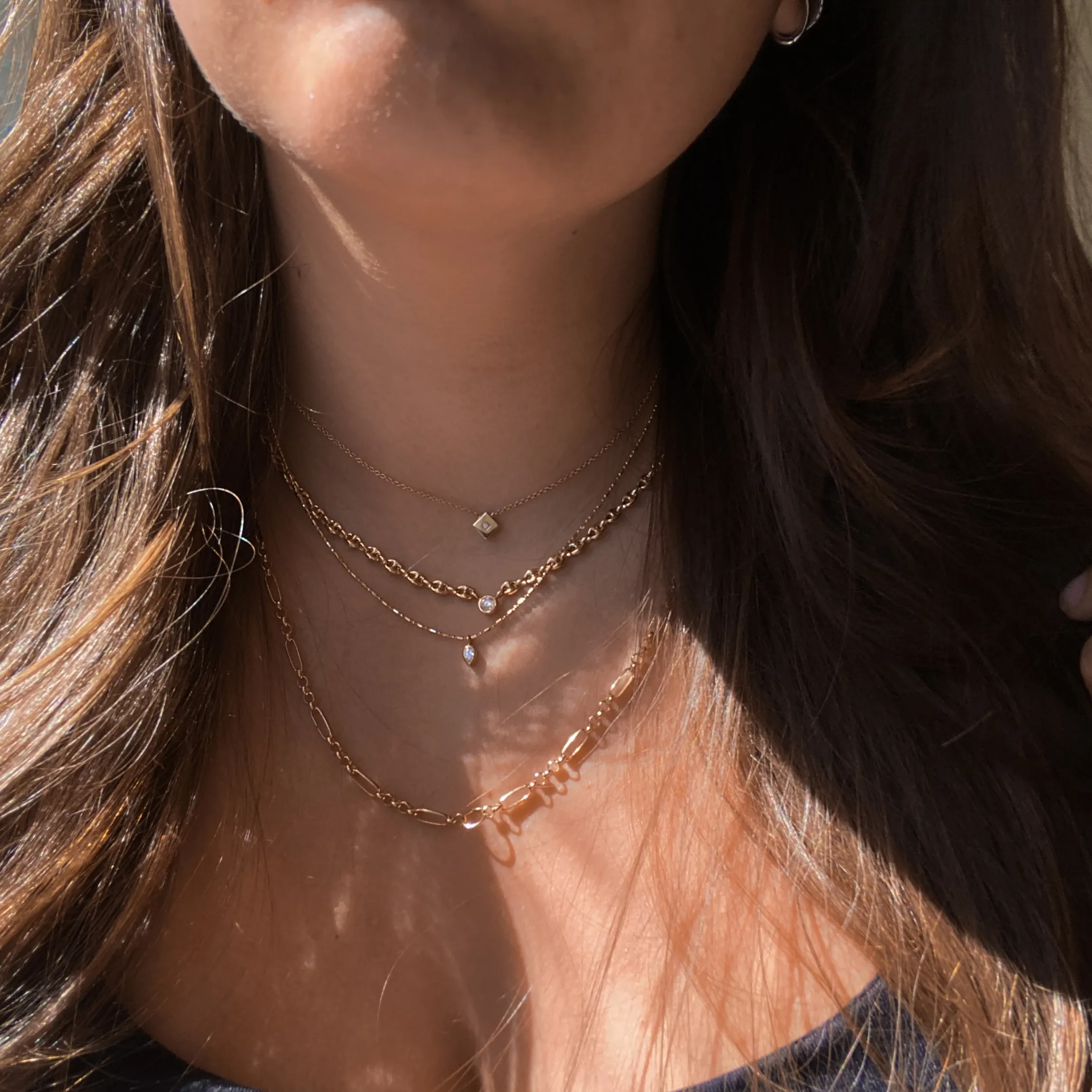 Indulge in the golden chain of your wildest dreams, delightfully mixed with paperclip and roll chains. Perfect for stacking or adding a charm with a hinge.