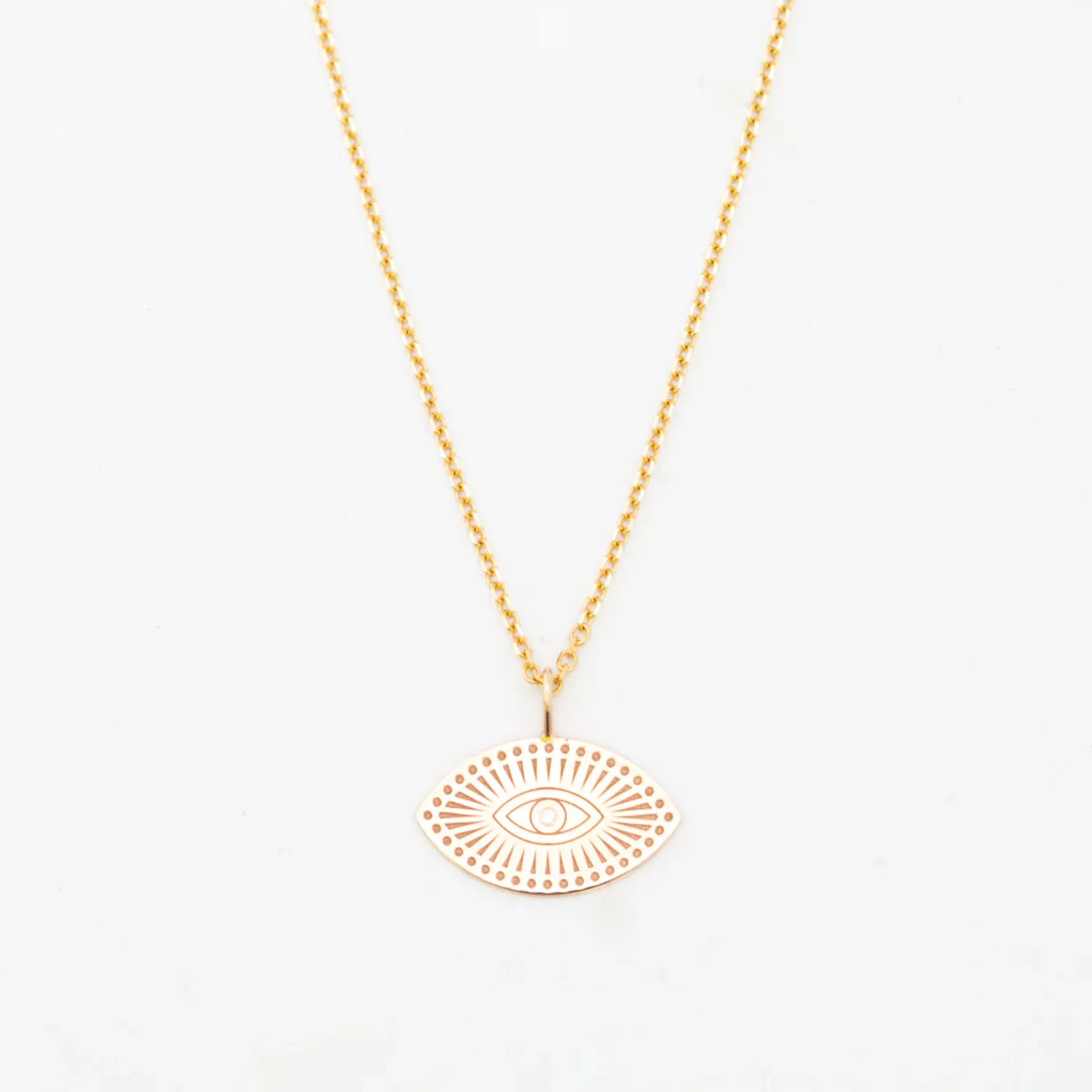 Bad luck and bad fashion begone! The intricate design engraved into this bold pendant give this timeless symbol a modern spin. A single flush-set diamond flashes out from the eye’s center, like a brilliant wink. String it alone on your favorite chain as a bold yet versatile accessory, or layer it with more necklaces for a look that will catch all the eyes.
