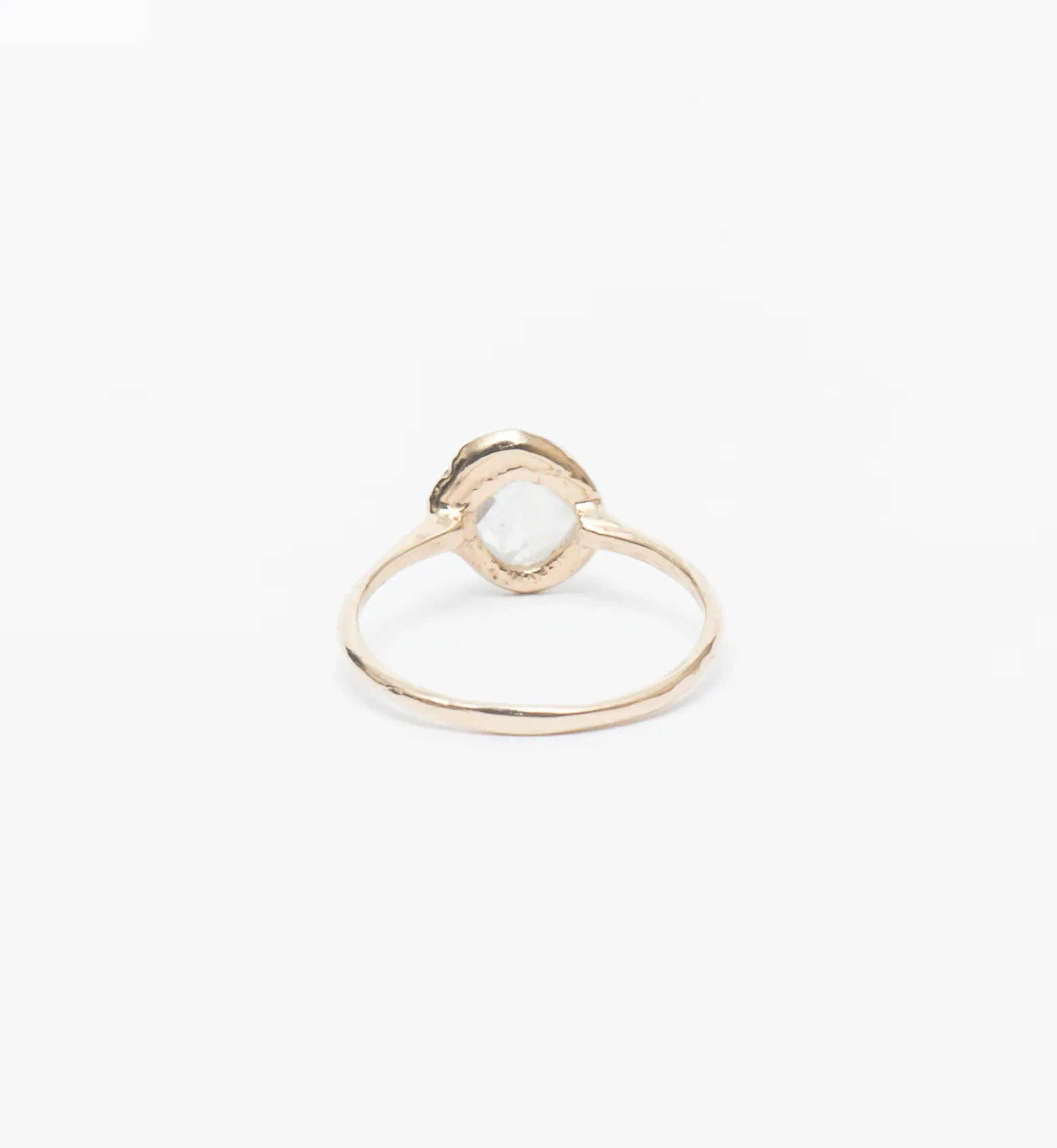 14 karat gold with a 6 mm rose-cut rainbow moonstone and approximately 0.02 carats of white diamond accents.
