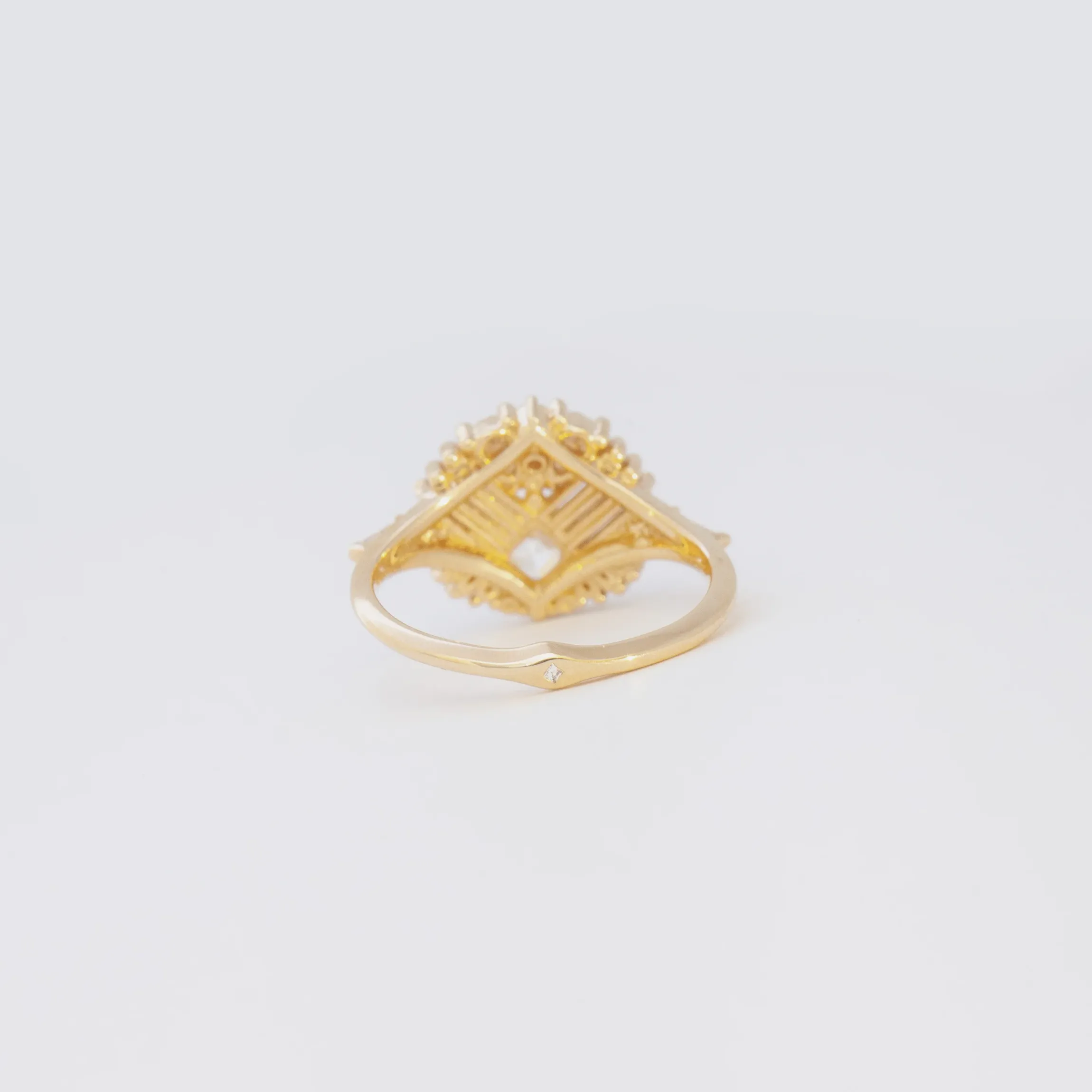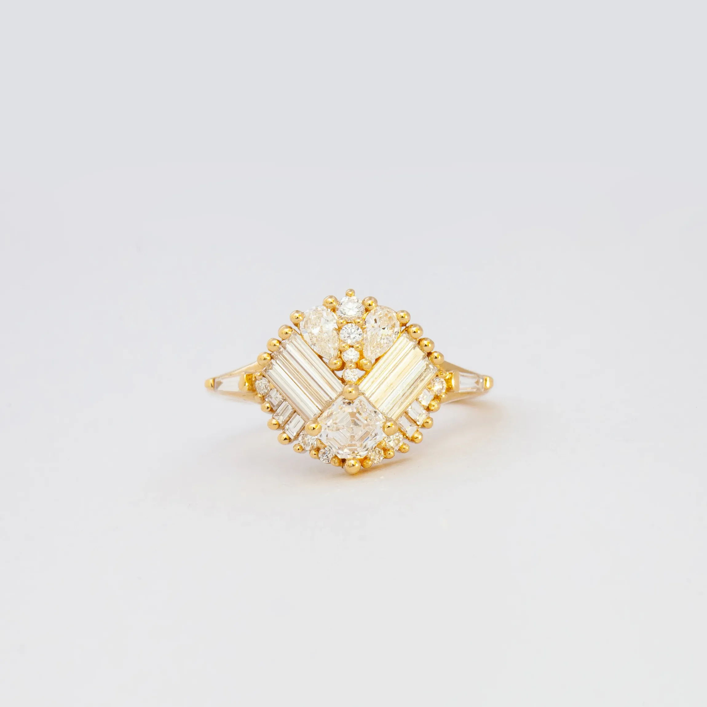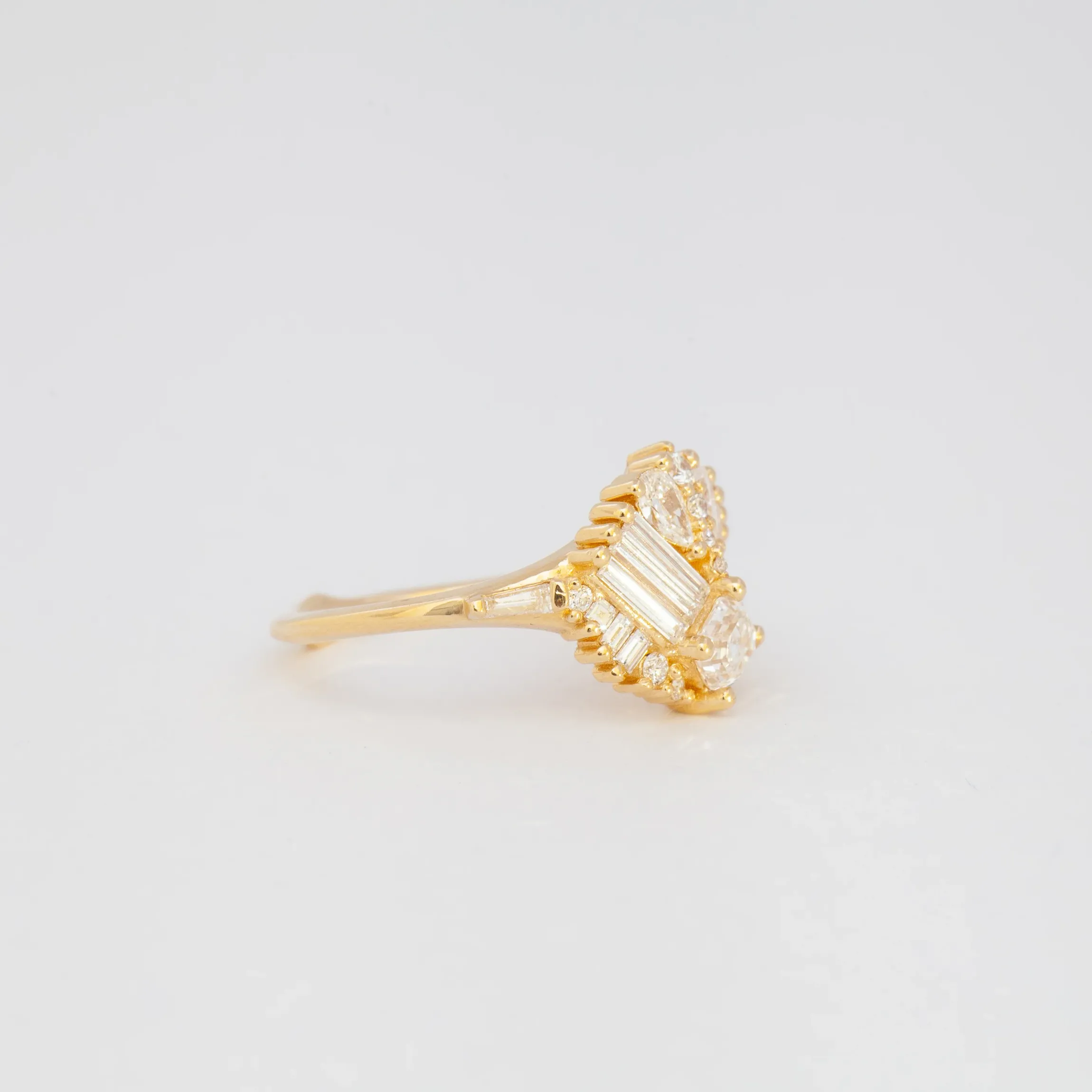 Soft curves, straight lines, and delicate beads combine for a diamond-encrusted style that’s surprisingly easy to wear. Despite the staggering number of diamonds on your hand (twenty-seven; we counted), the low-profile design makes this ring incredibly easy to wear. By using both dazzling brilliant cuts and shimmering step cuts, the Artemer designers create hypnotizing mix of textures and forms. Made in Israel.