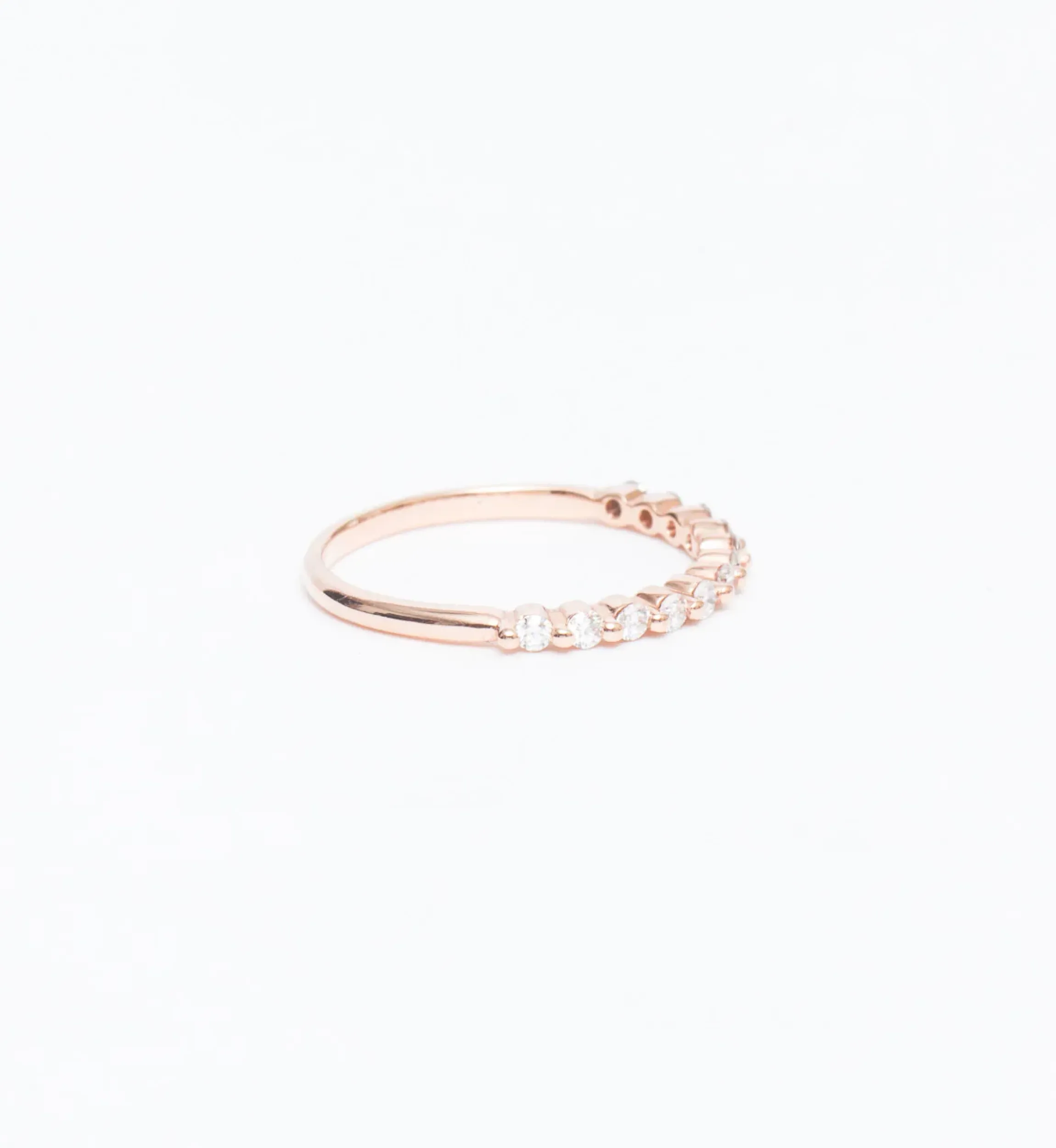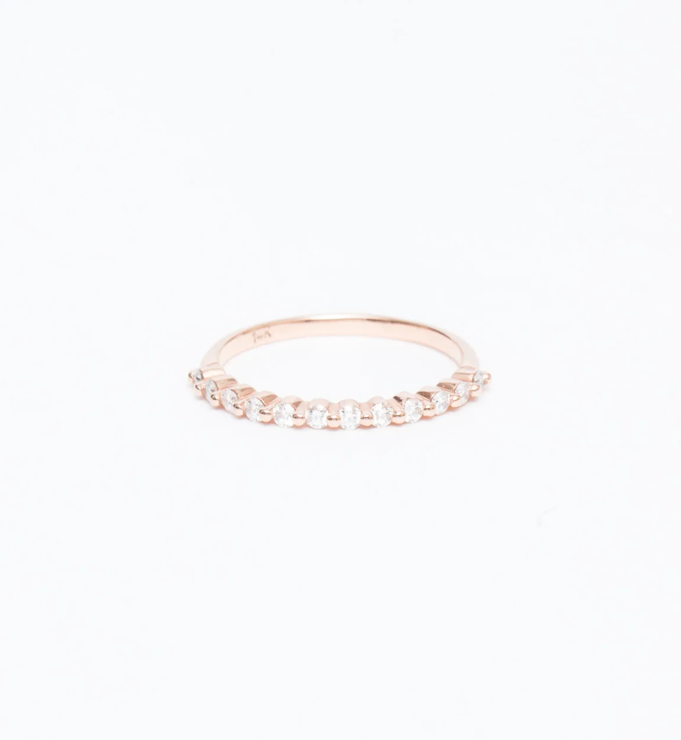 A glittering row of diamonds are subtly raised above the finger with shared-prongs letting in as much light as possible. The result is a delicate band with a surprising amount of brilliance and fine metal detailing. This half eternity style stacks neatly with engagement rings on slender bands, but makes perfect sense as a singular piece to wear all on its own. Made in the U.S.A.