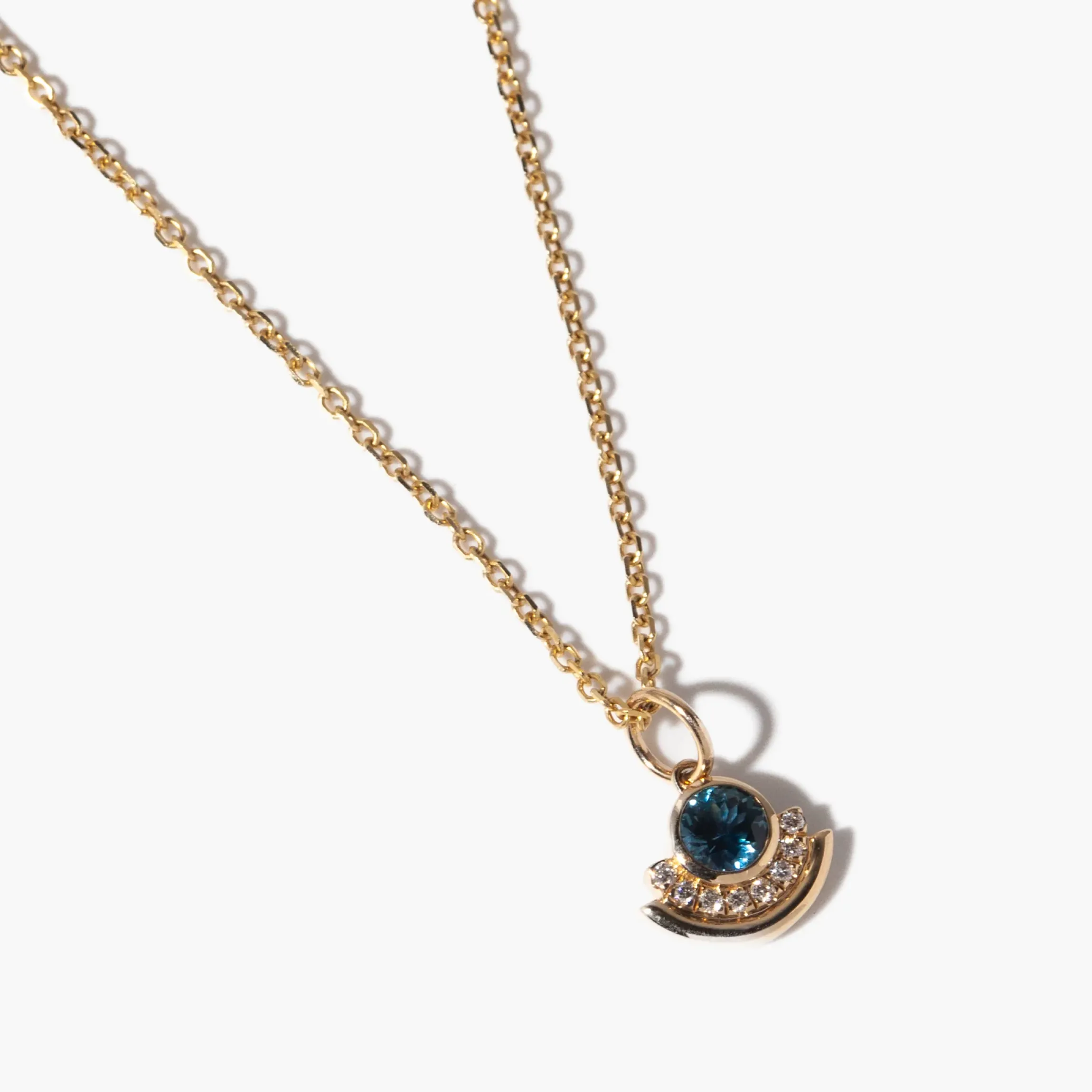 A golden arc wraps around an arc of eight round brilliant diamonds and lies just below a glowing teal Montana sapphire. This new charm from designer Casey Perez is a gorgeous piece to add to your necklace stack. Her attention to detail and love for the craft of jewelry making are apparent in all of her designs. Designed and crafted in Brooklyn, NYC.