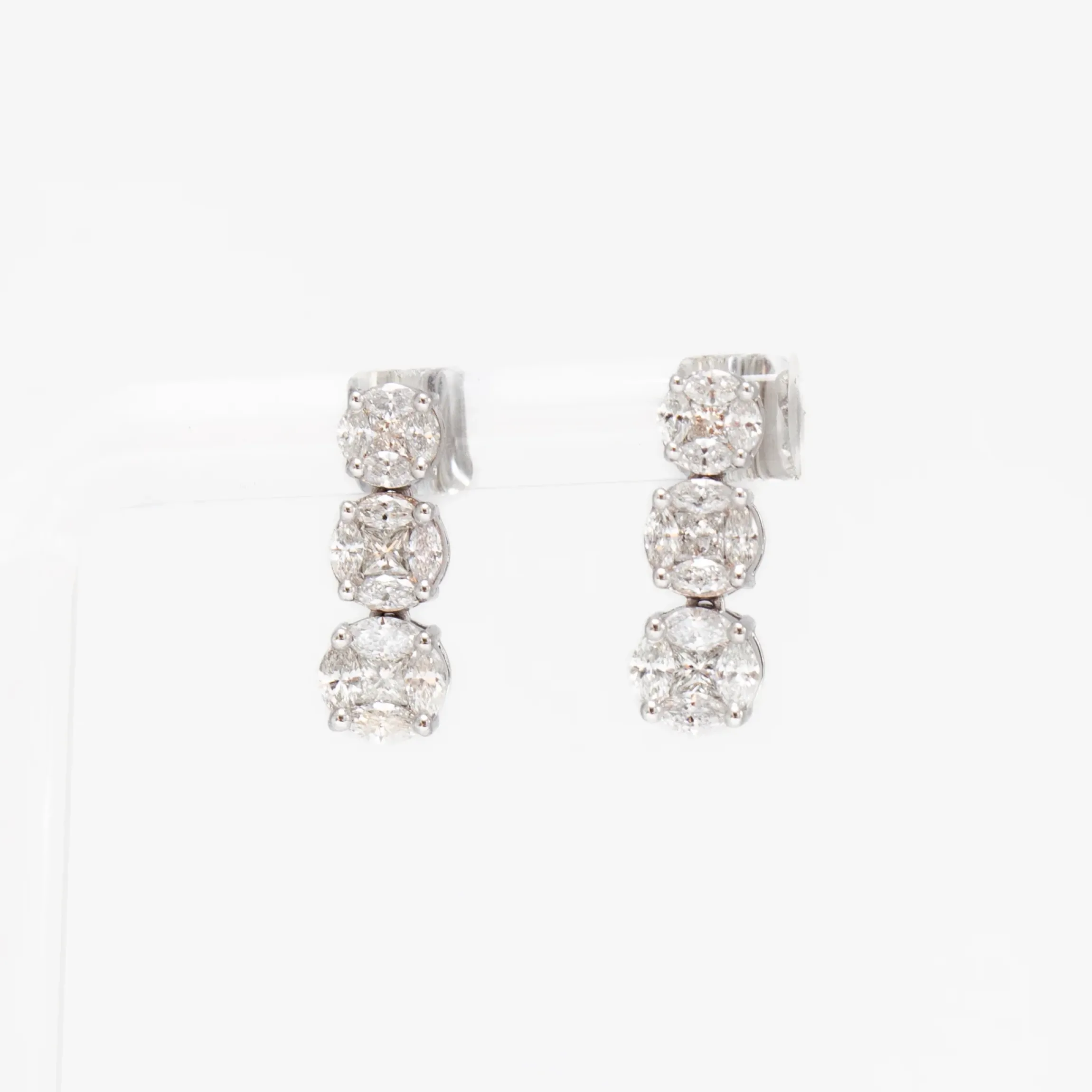 These fresh studs are sure to make a statement. With a mosaic-like design and a mix of princess and marquise white diamonds, they sparkle like nothing else. The graduating three drops are beautifully and thoughtfully crafted. Whether it’s your wedding day or a special occasion, these will definitely earn you some compliments.