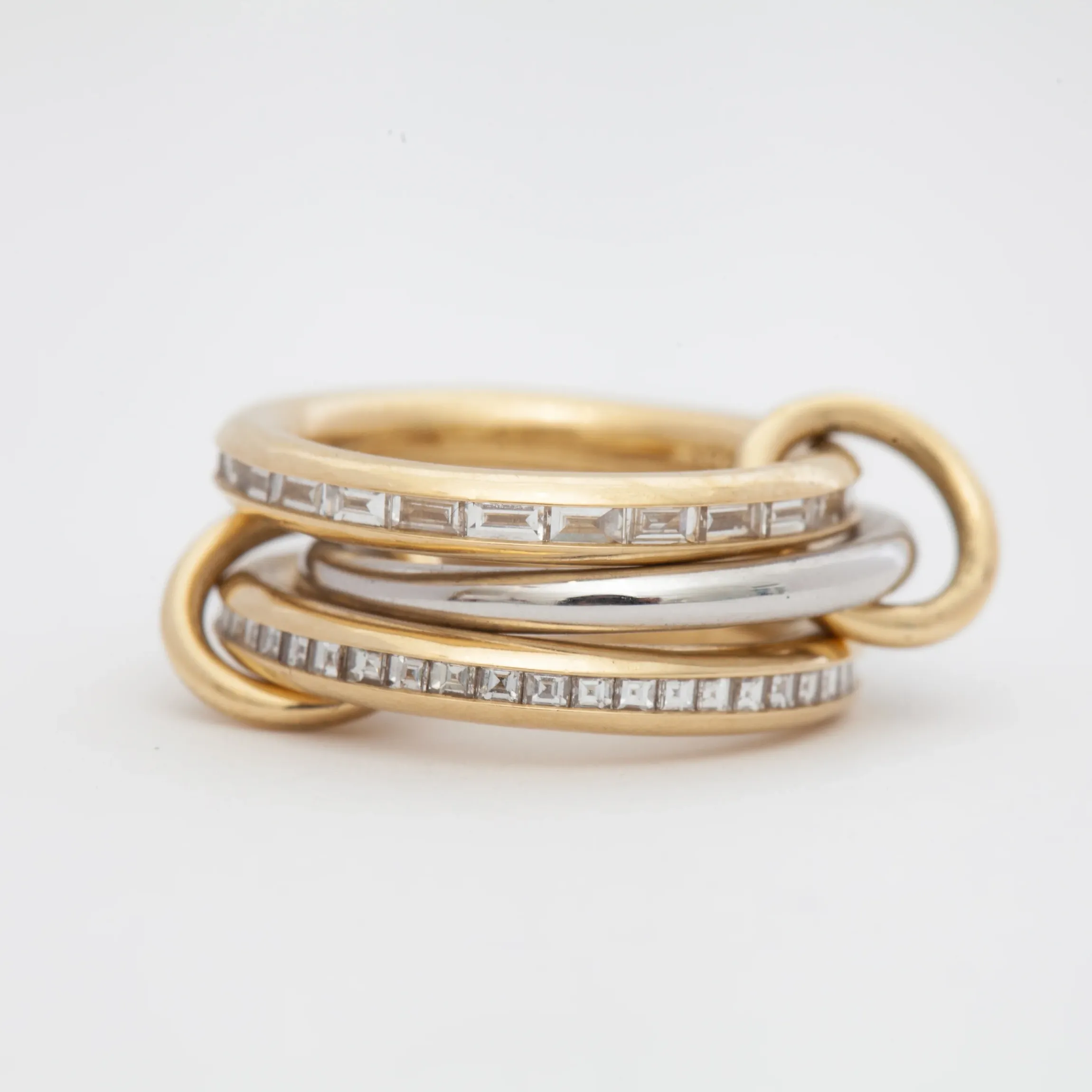 A delicate profile is gilded with step-cut diamonds in this dramatic stacked set from Spinelli Kilcollin. Slender baguette and petite square Carré-cut diamonds create a subtle mix of proportions in opposing channel-set bands. Designed for wear as a stunning stack or as a linked series of graceful rings, you’ll love finding a way to style it and make it your own. Made in the U.S.A.