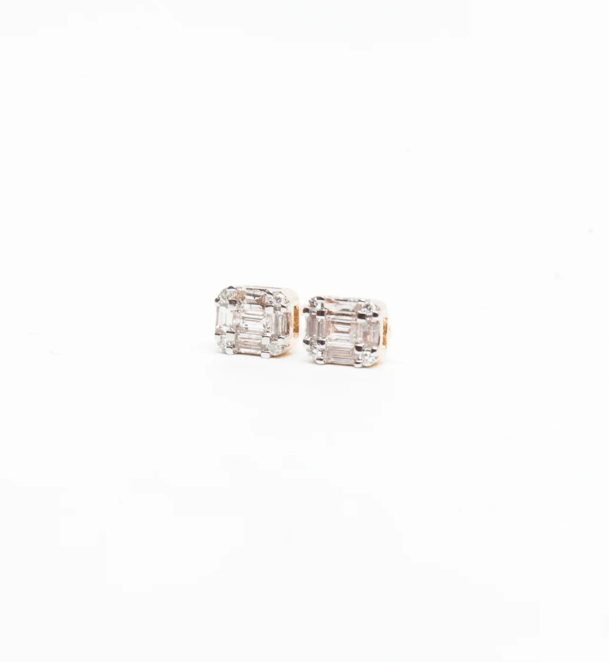 Move over, solitaire studs, the multiple diamonds on these gold studs make a big impact. Round diamonds at the corners wrap around five baguette diamonds for a bright and brilliant mix of shapes and facets. We think they make an ideal replacement for traditional diamond studs, but still have a clean and classic look that makes them easy to wear every single day. Designed in Los Angeles.