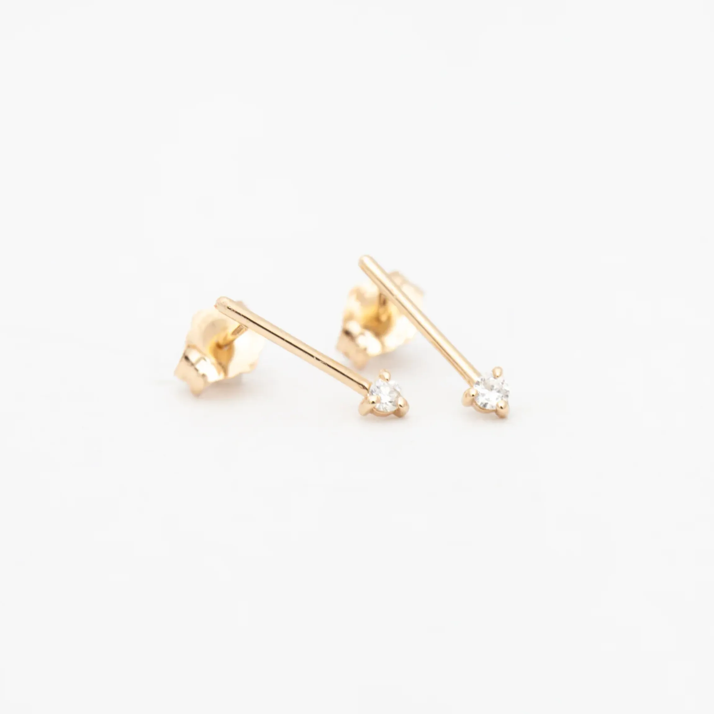 14 karat recycled yellow gold. Bar measures 8 mm in length, diamond measures 2 mm across at approximately 0.03 carat each.