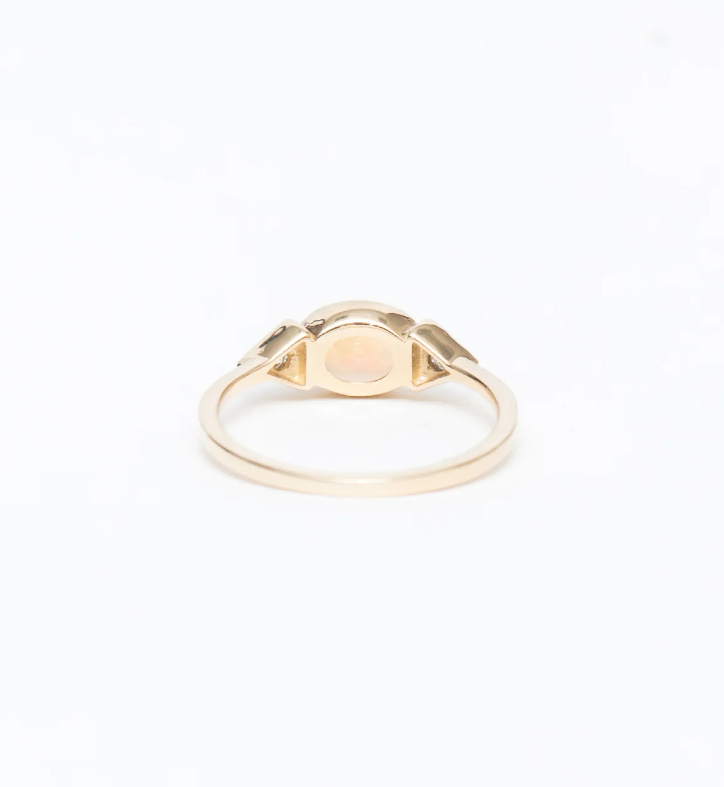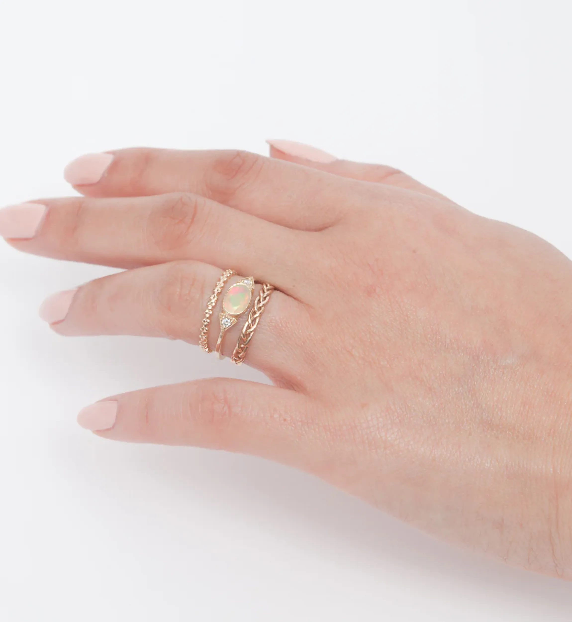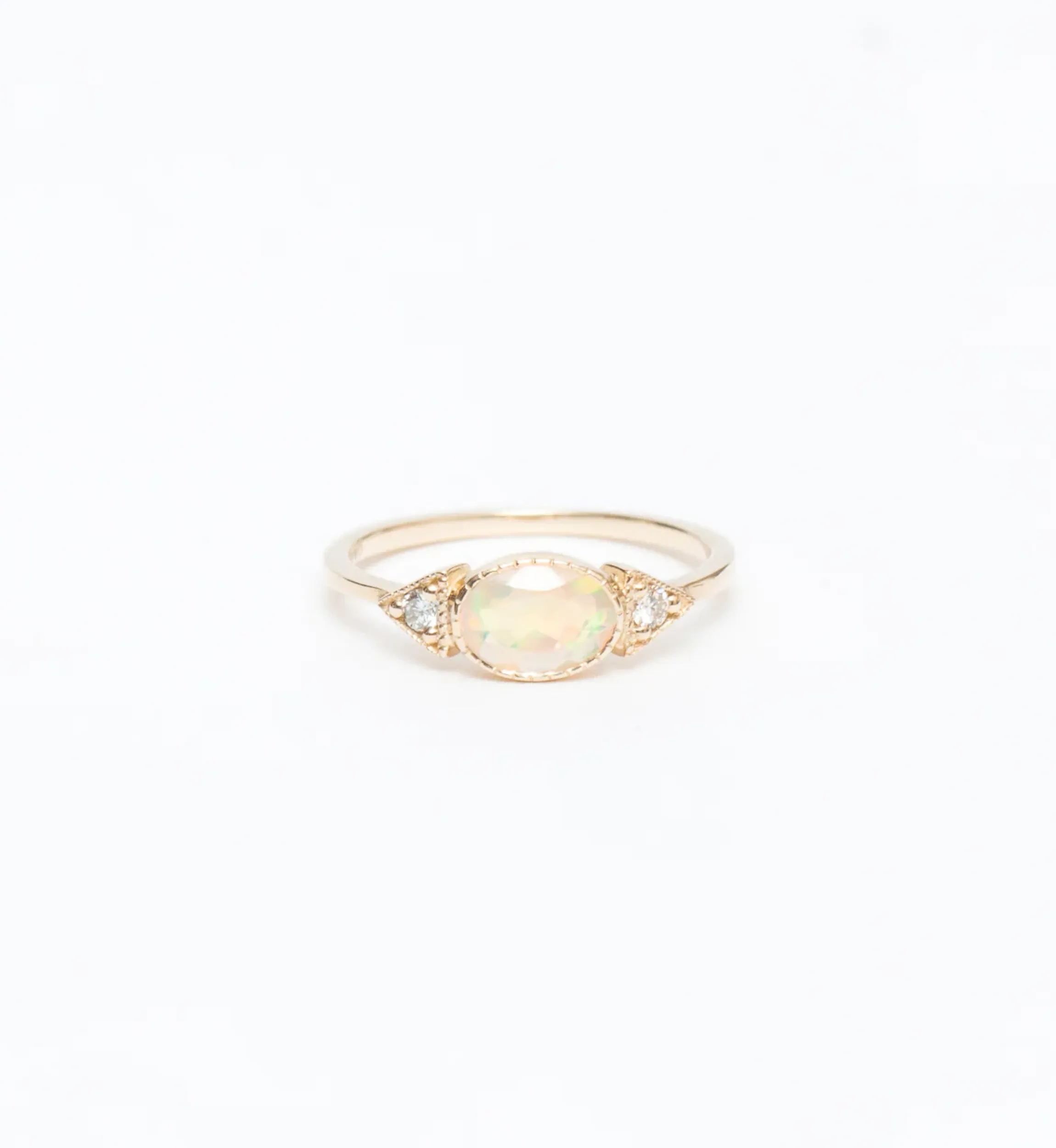 An elegant east-west setting combines the dreamy look of a opal with the timeless glint of white diamonds. Traditionally, opals are left smooth, but this center has been faceted to accentuate the shifting spectrum of colors that sparkle from within. Milgrain adds frames of sparkling golden beads around all the stones with Jennie Kwon’s signature sense of delicacy. Colorful, yet easy to wear, this style feels like a natural fit for everyday dressing. Handmade in the U.S.A.