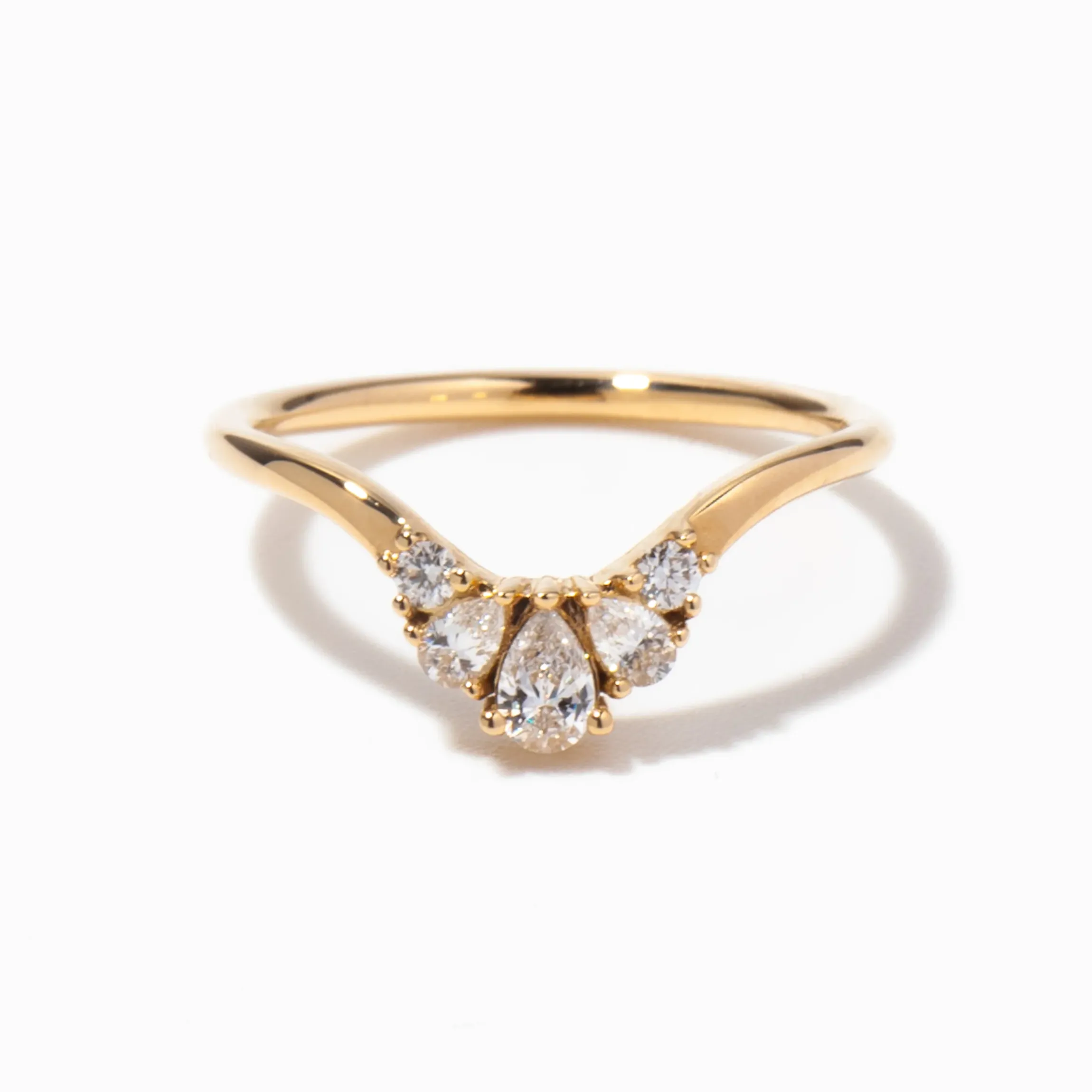Crafted by hand in 18K gold, this wedding ring features three pear and two brilliant white diamonds that gracefully follow the slender band. Perfect for stacking, it will seamlessly nest with your engagement ring.