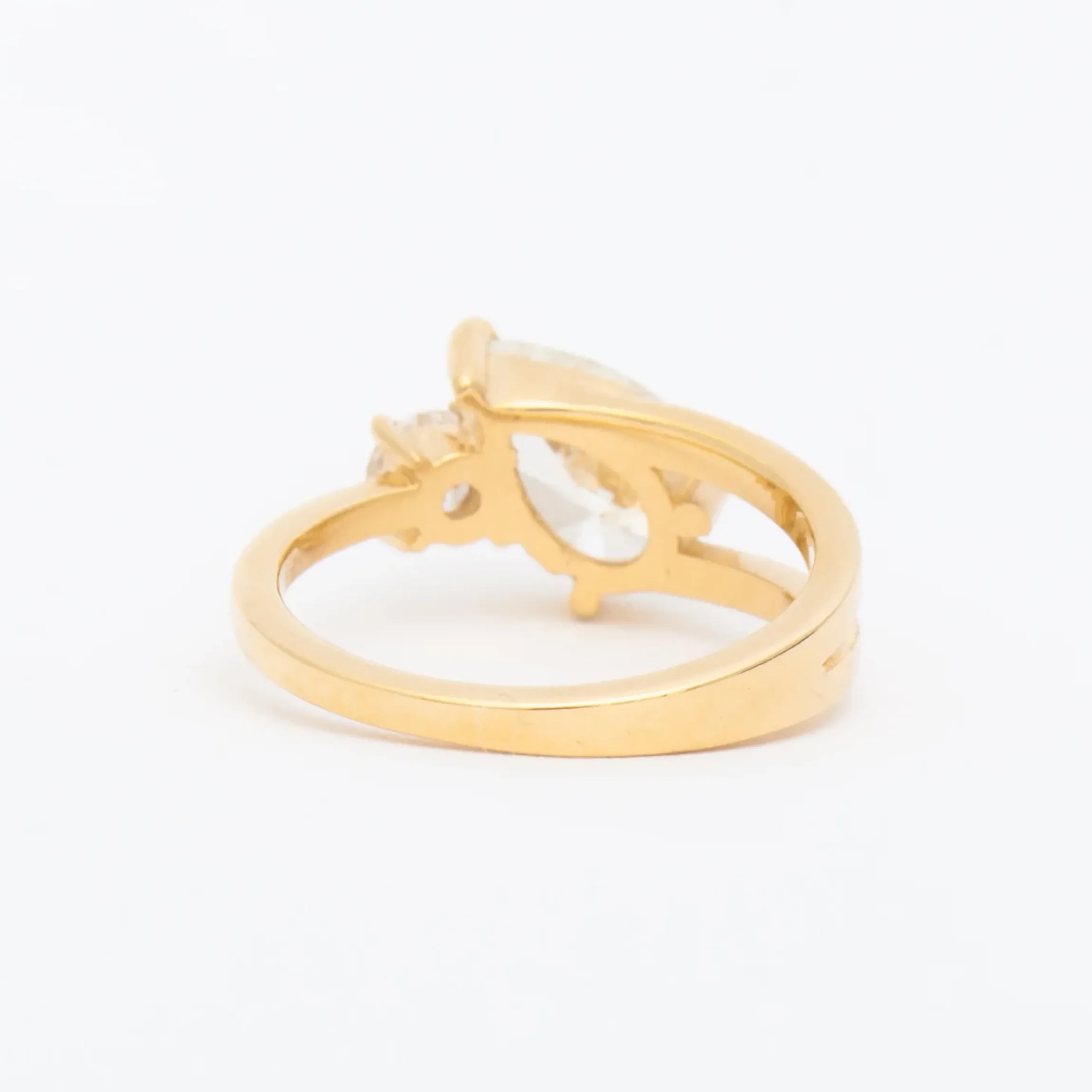From The Future Fine comes a brand new take on the toi et moi. Built on luxurious lines that will have heads turning and jaws dropping, this ring boasts a tilted pear diamond paired effortlessly with a round white diamond. Two become one as you spin the ring around your finger revealing its intricate details from any angle. Made in the USA.
