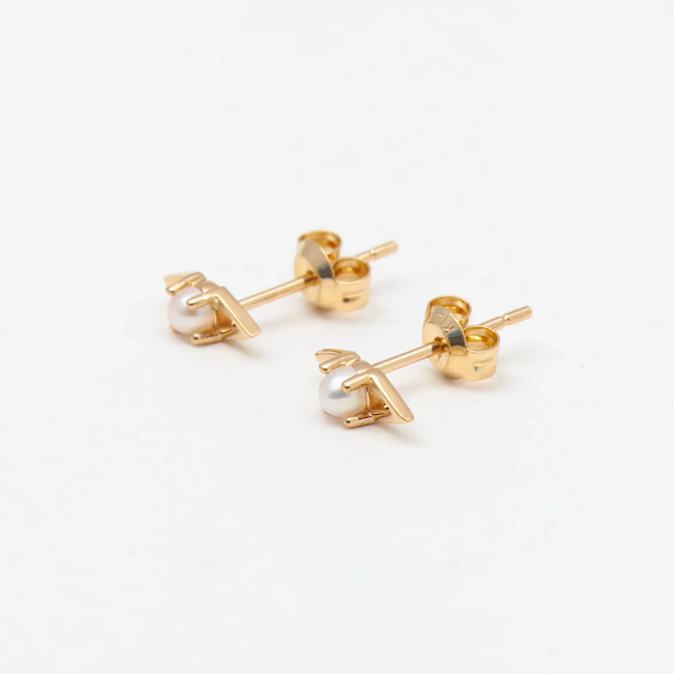 A pointed frame of gold creates a long and elegant silhouette for these pearl studs. The opalescent colors of the center stone contrasts beautifully with the modern, angular form. Made in the U.S.A.