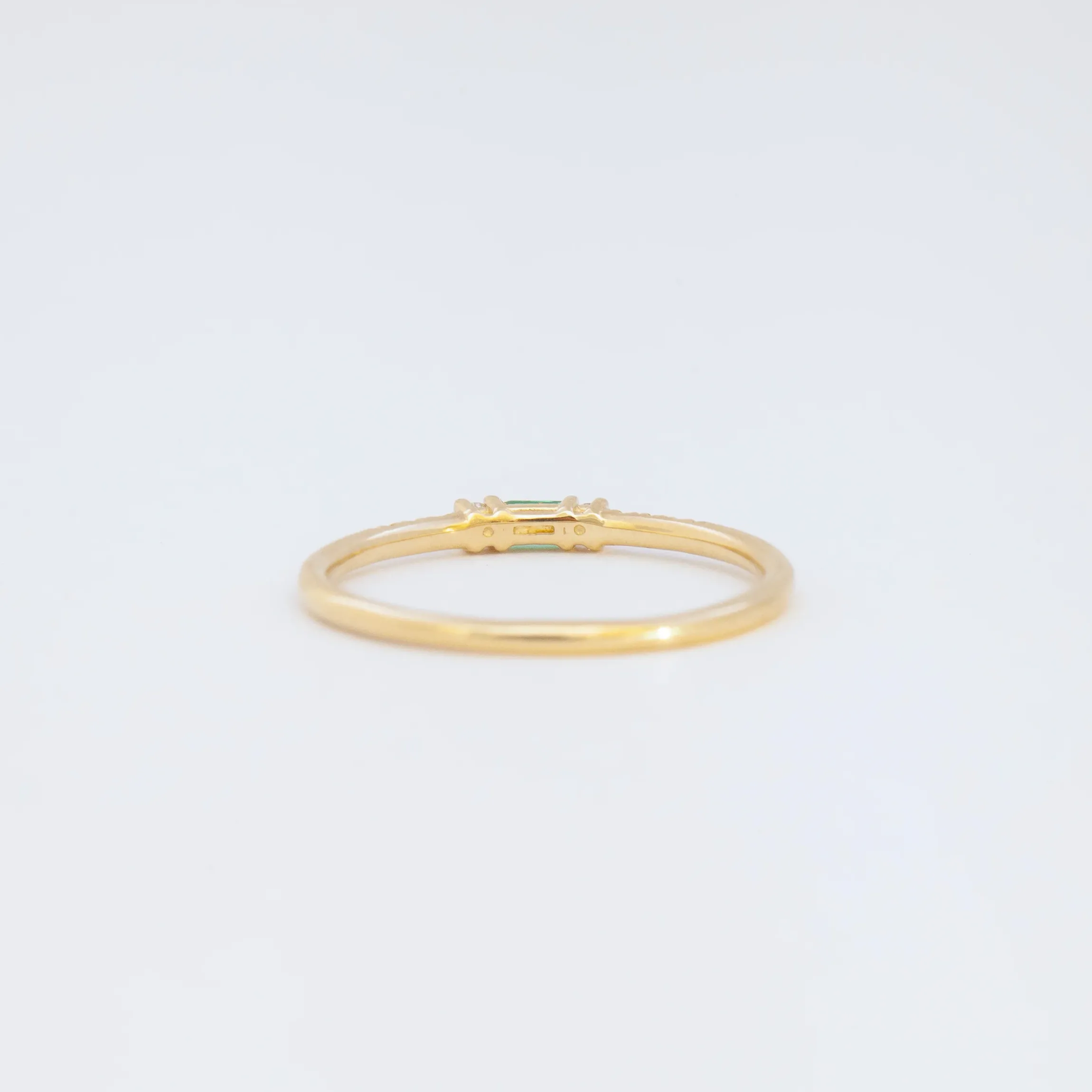 14 karat gold set with one 3 mm x 1.5 mm baguette emerald, two 1.5 mm round white diamonds, and six 1 mm round white diamonds.
