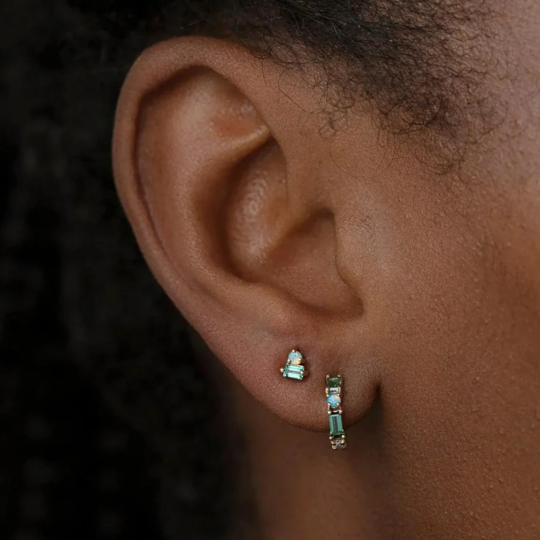 Introducing the Brickwork Series — inspired by traditional masonry, where each brick comes together to build both a beautiful pattern and a strong foundation. These effortless hoop earrings feature a brilliant opal, a white diamond, and a gradation of green tourmalines – each stone unique in color and tone, creating a beautiful natural gradient.